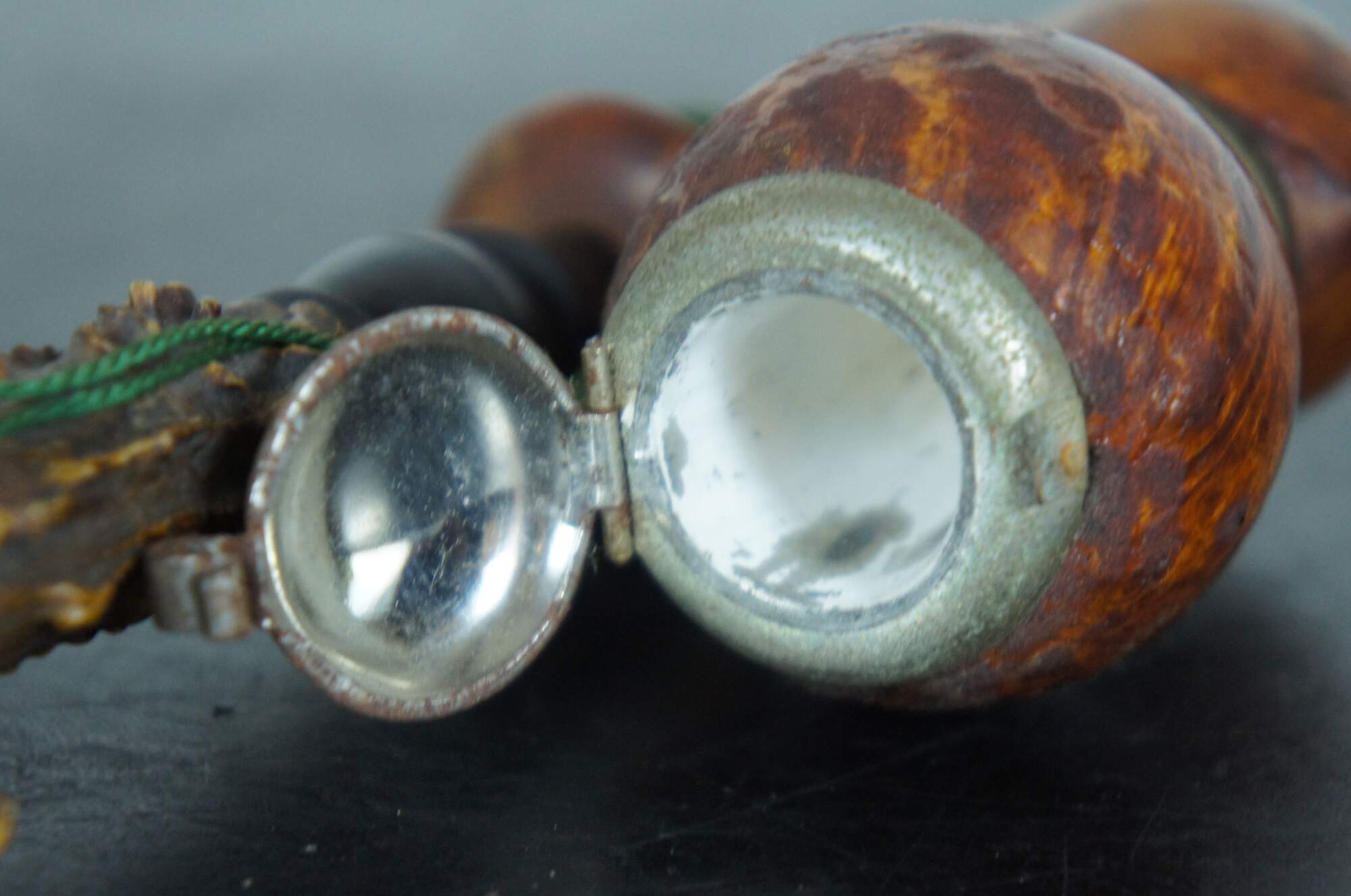 Vintage German smoking pipe fashions with a raw buck horn / antler stem and a round burl wood bowl with metal cap.