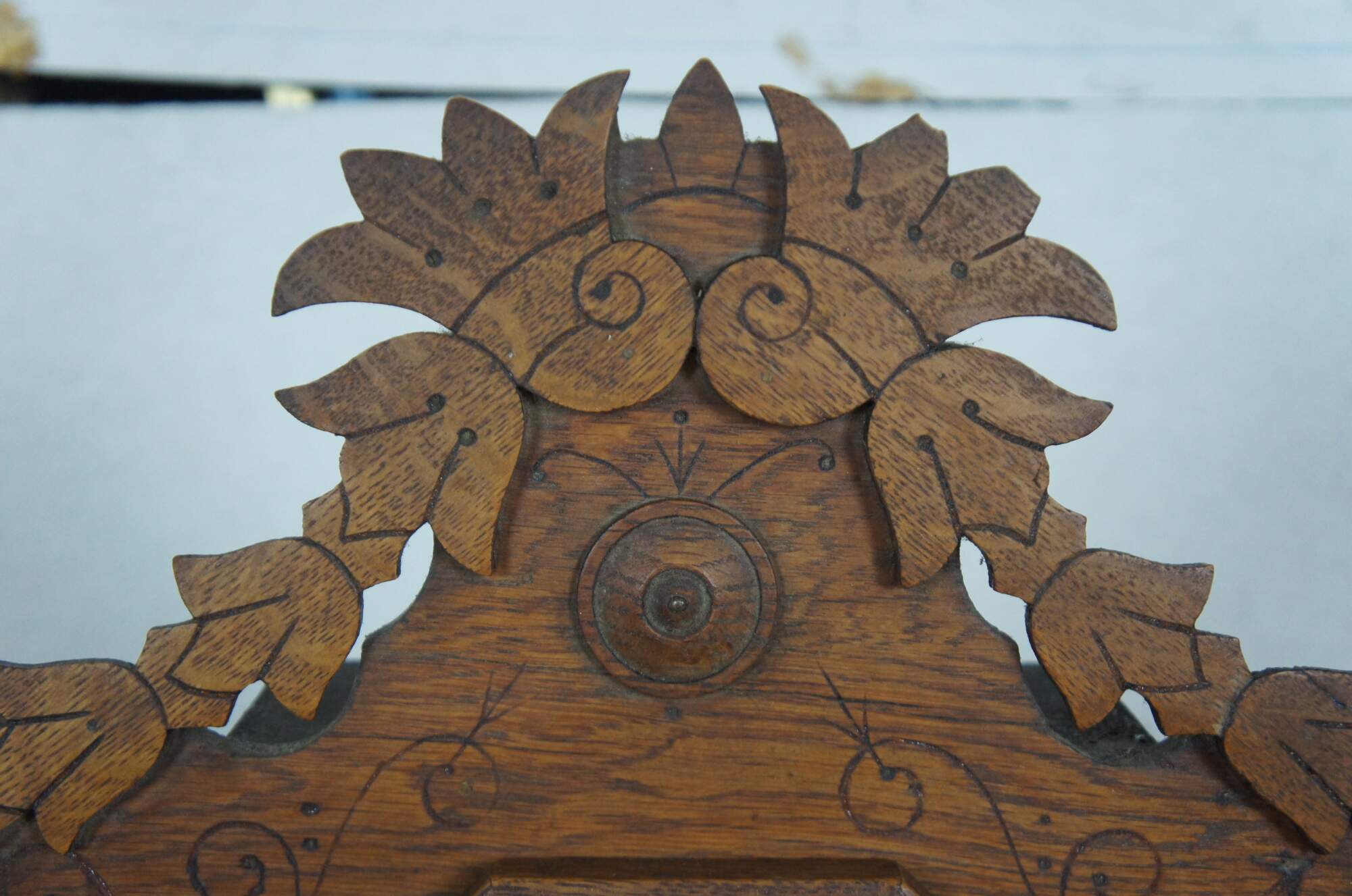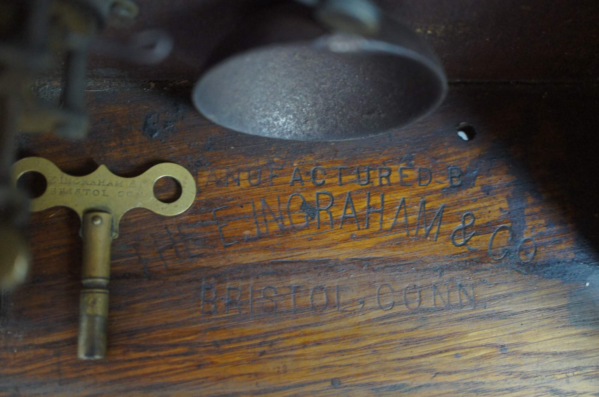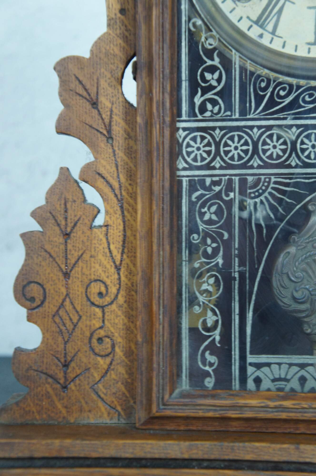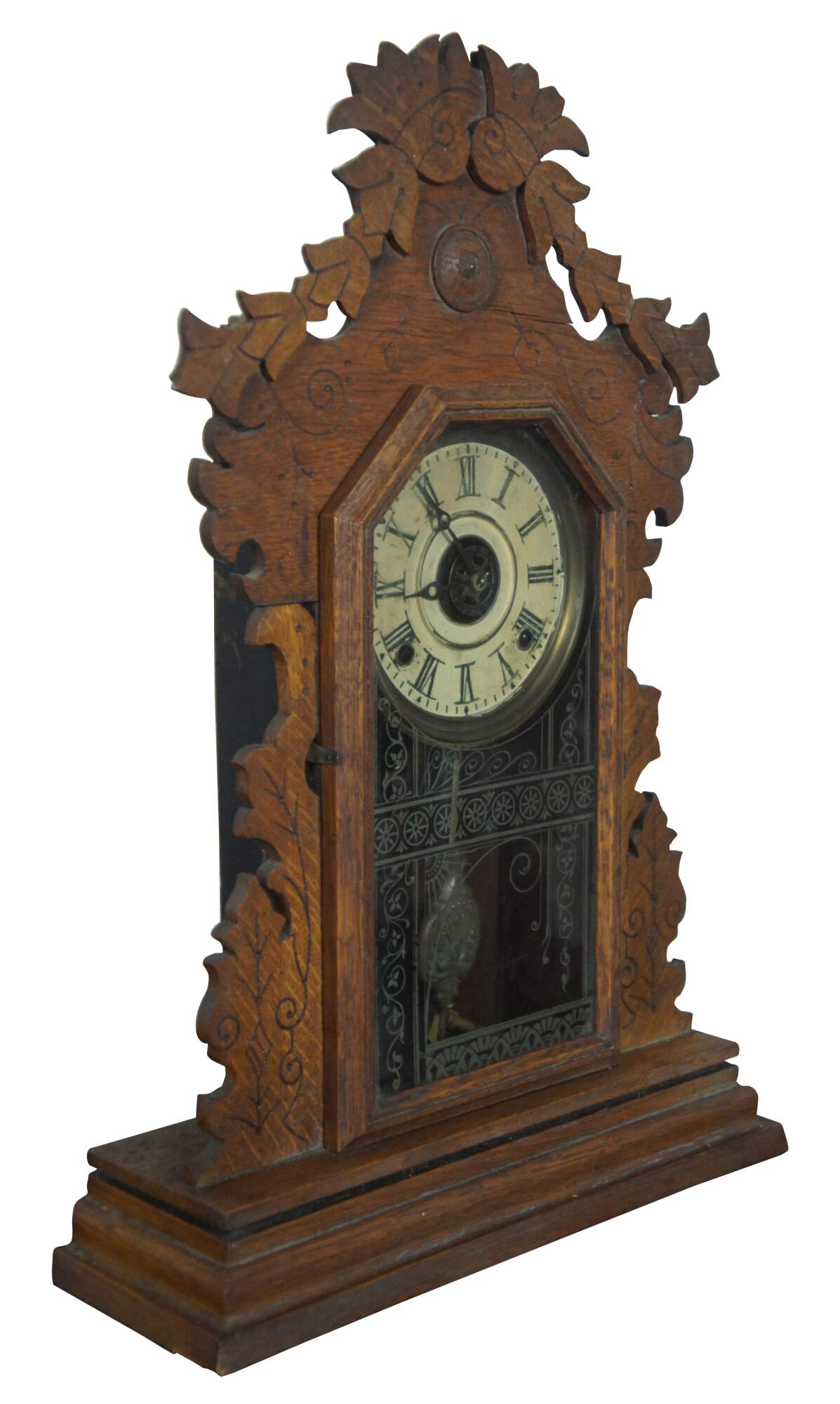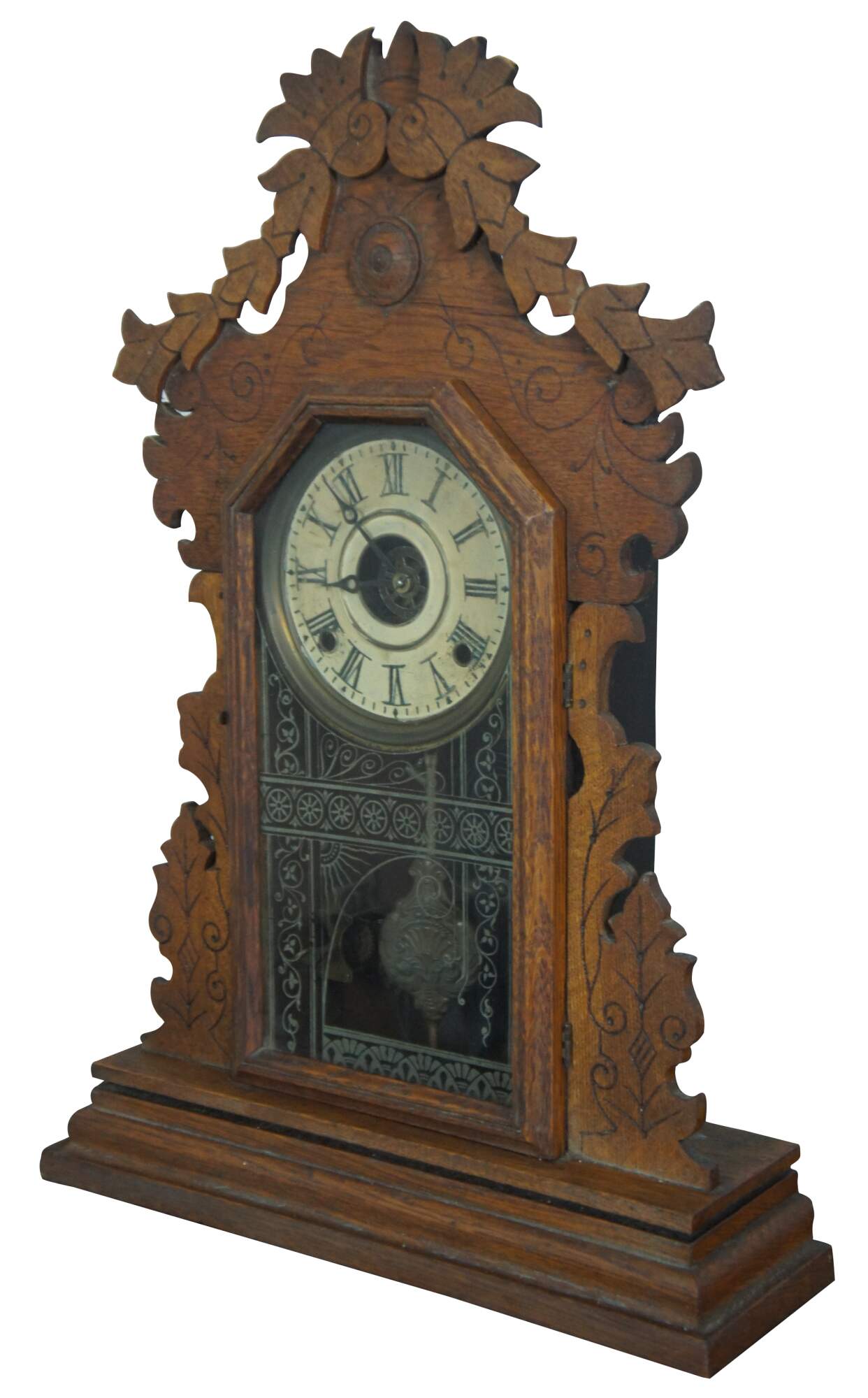 Antique mantel clock by E. Ingraham & Company featuring a carved oak case with art deco style leaves and flowers, painted face with Roman numerals, ornate brass pendulum, and reverse painted glass front.