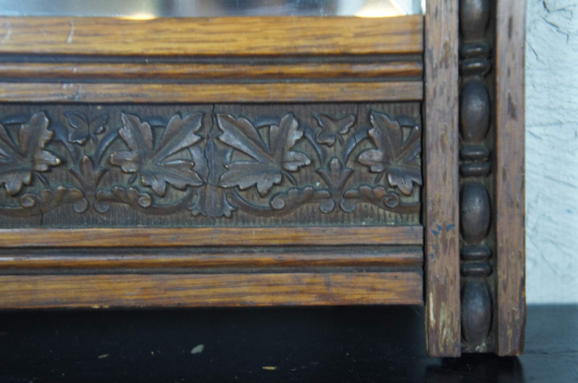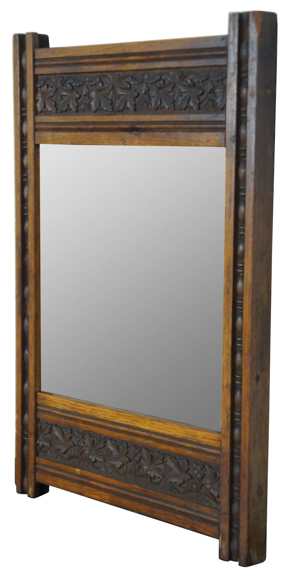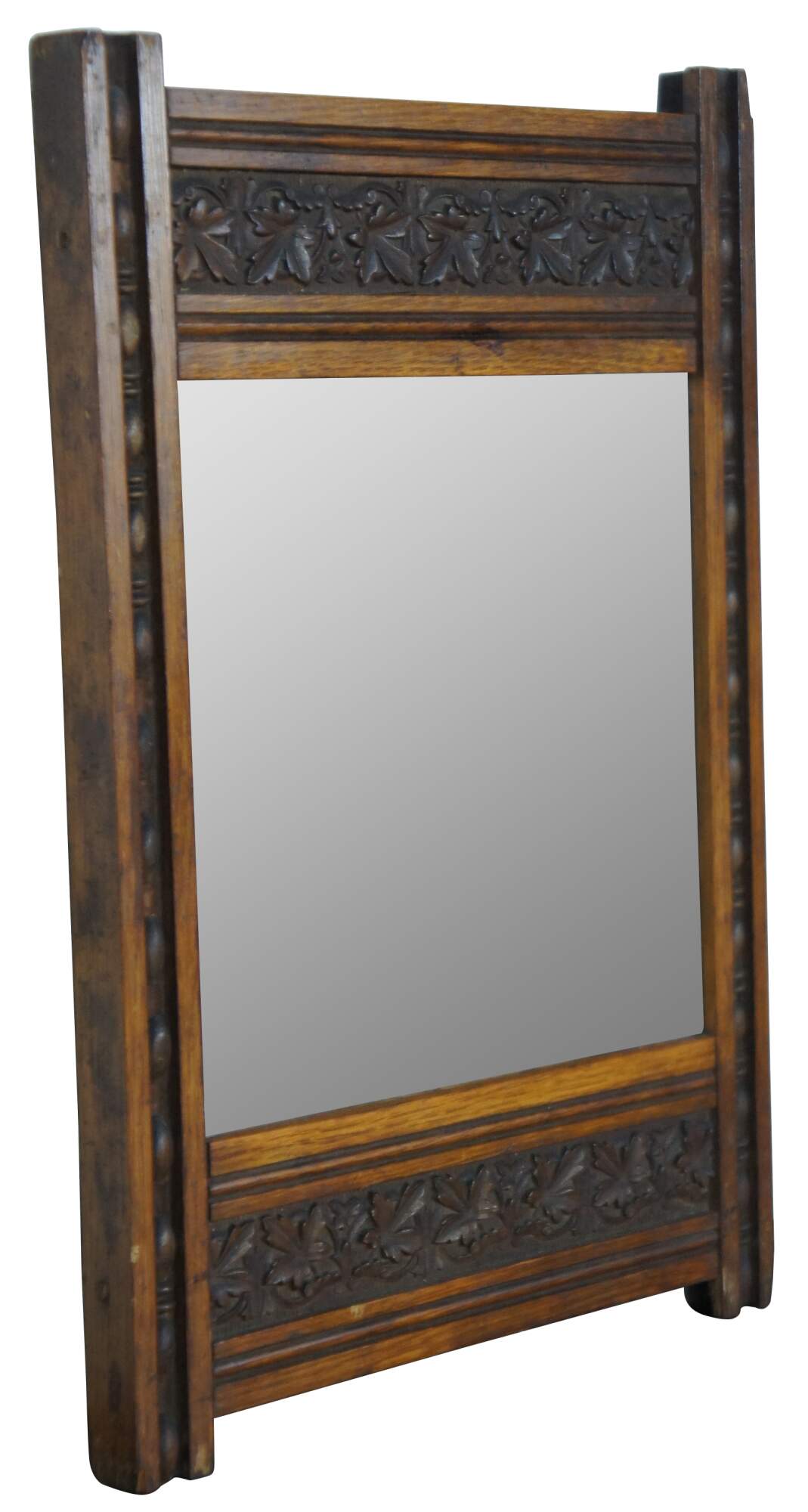 Antique square beveled wall or vanity mirror set in a carved oak frame featuring fluted lines and oak leaves a beaded trim.