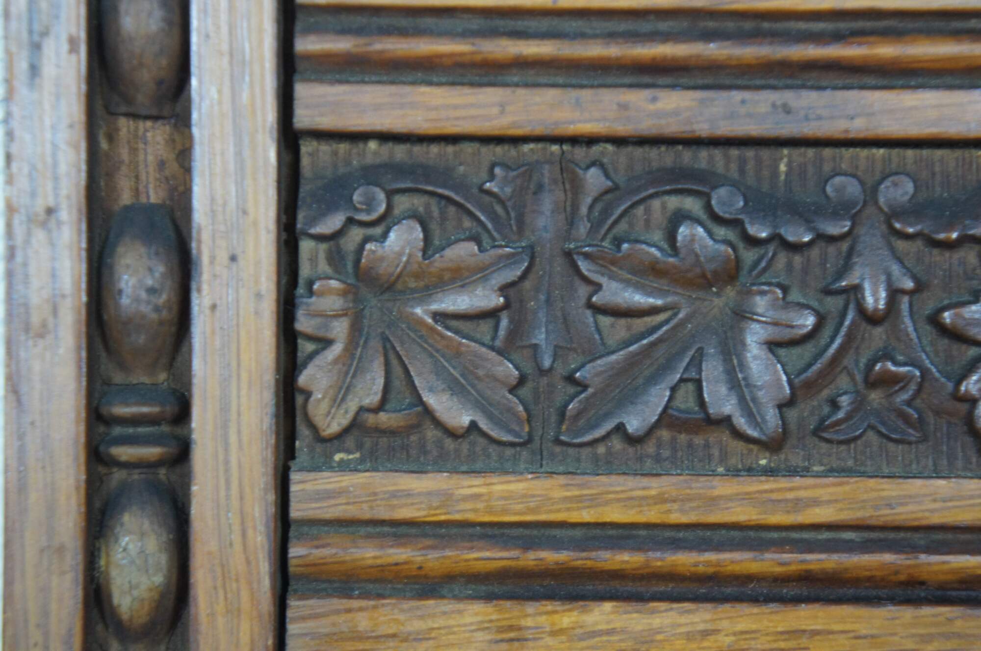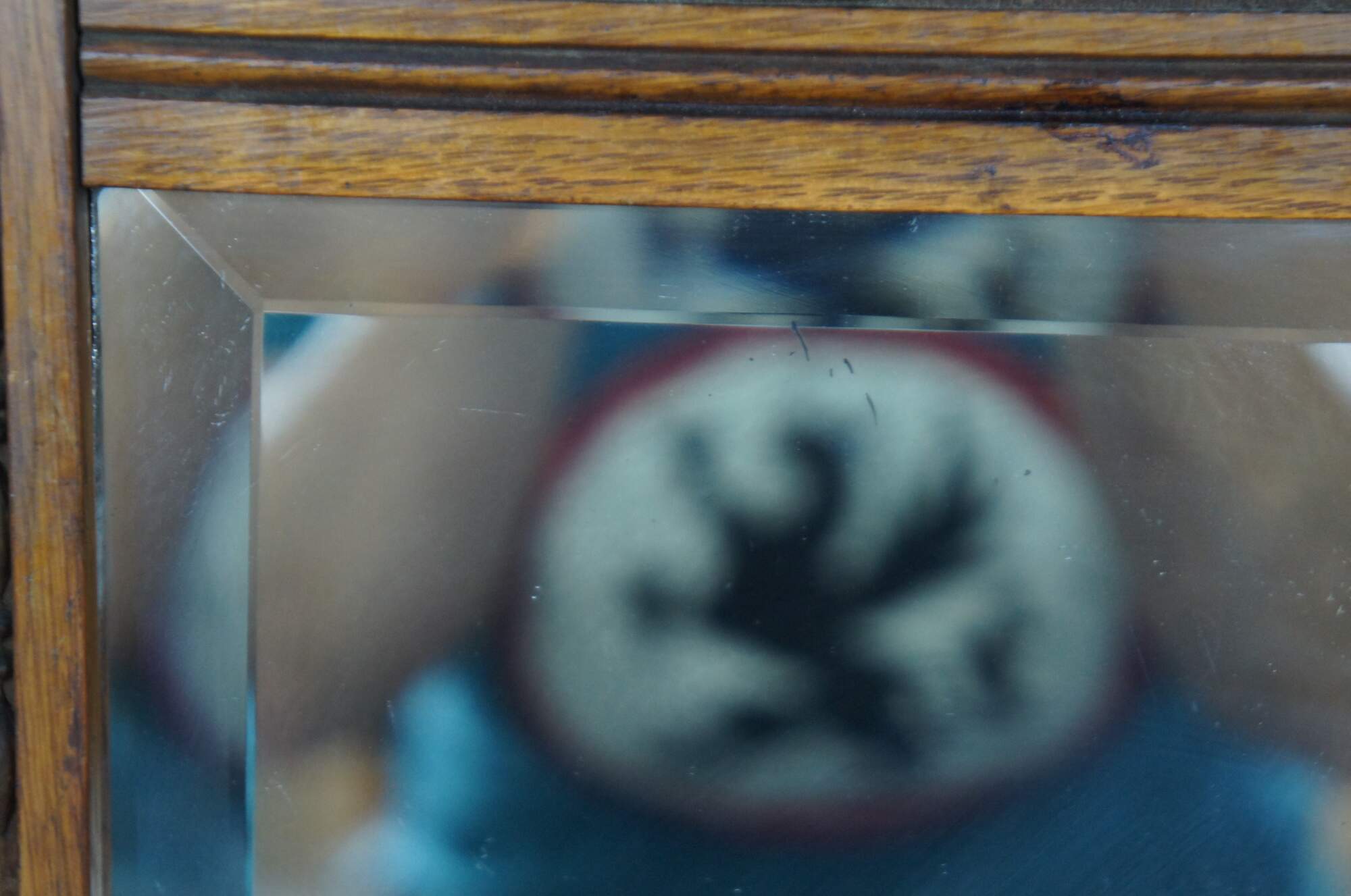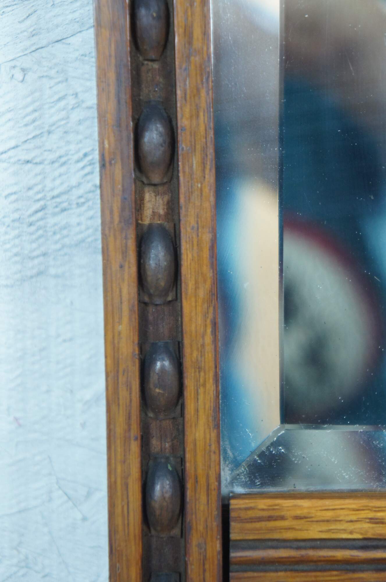 Antique square beveled wall or vanity mirror set in a carved oak frame featuring fluted lines and oak leaves a beaded trim.