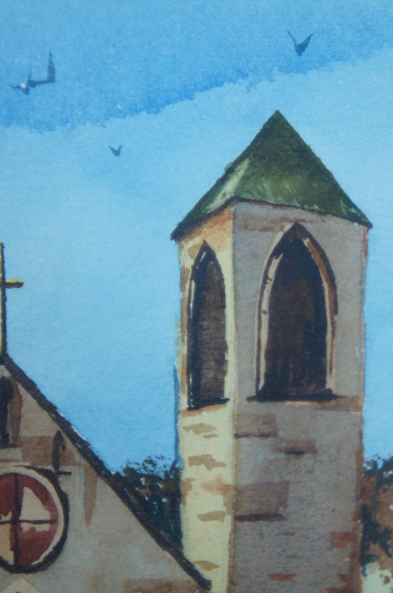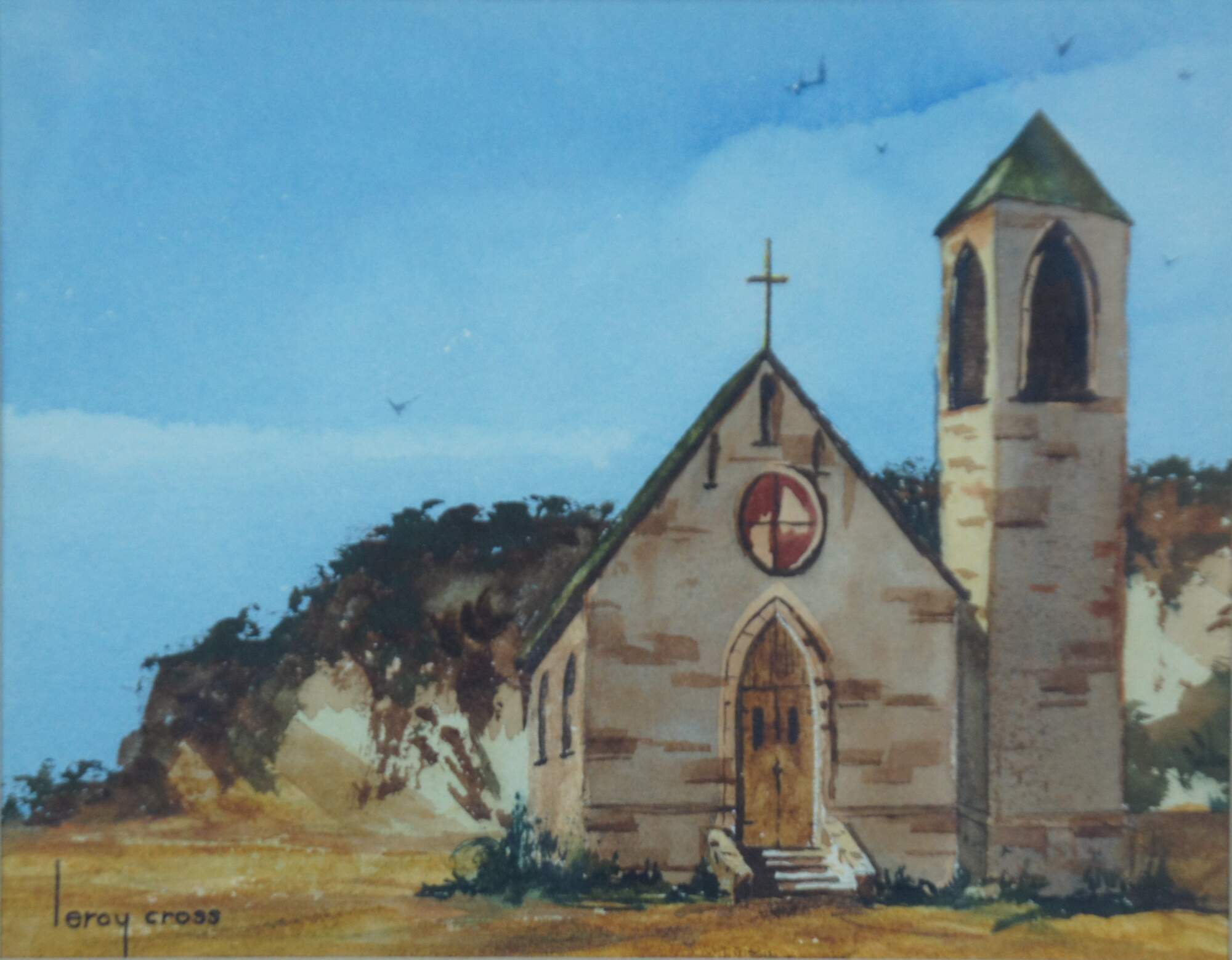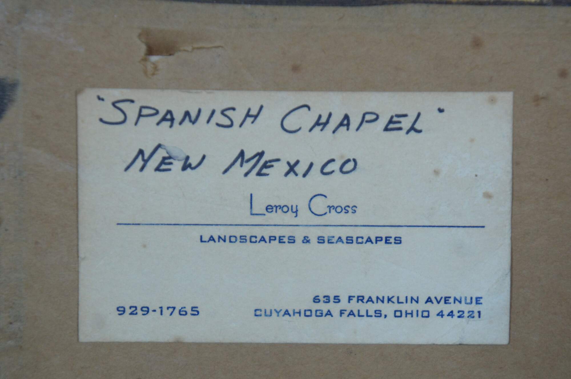 Vintage watercolor desert landscape painting titled “Spanish Chapel” by Leroy Cross.