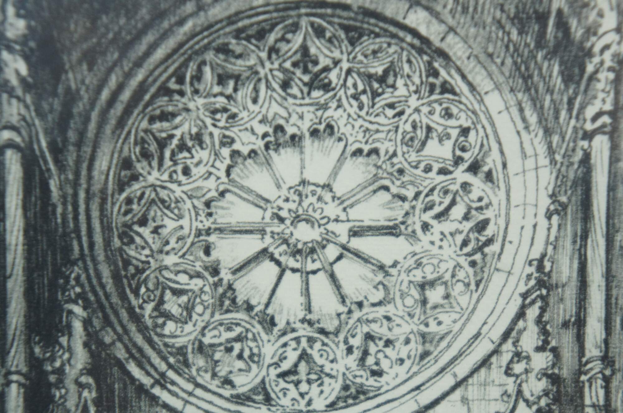 Antique etching of a Gothic church or cathedral entrance flanked by saint statues and a rose window with figures entering. Signed in plate.