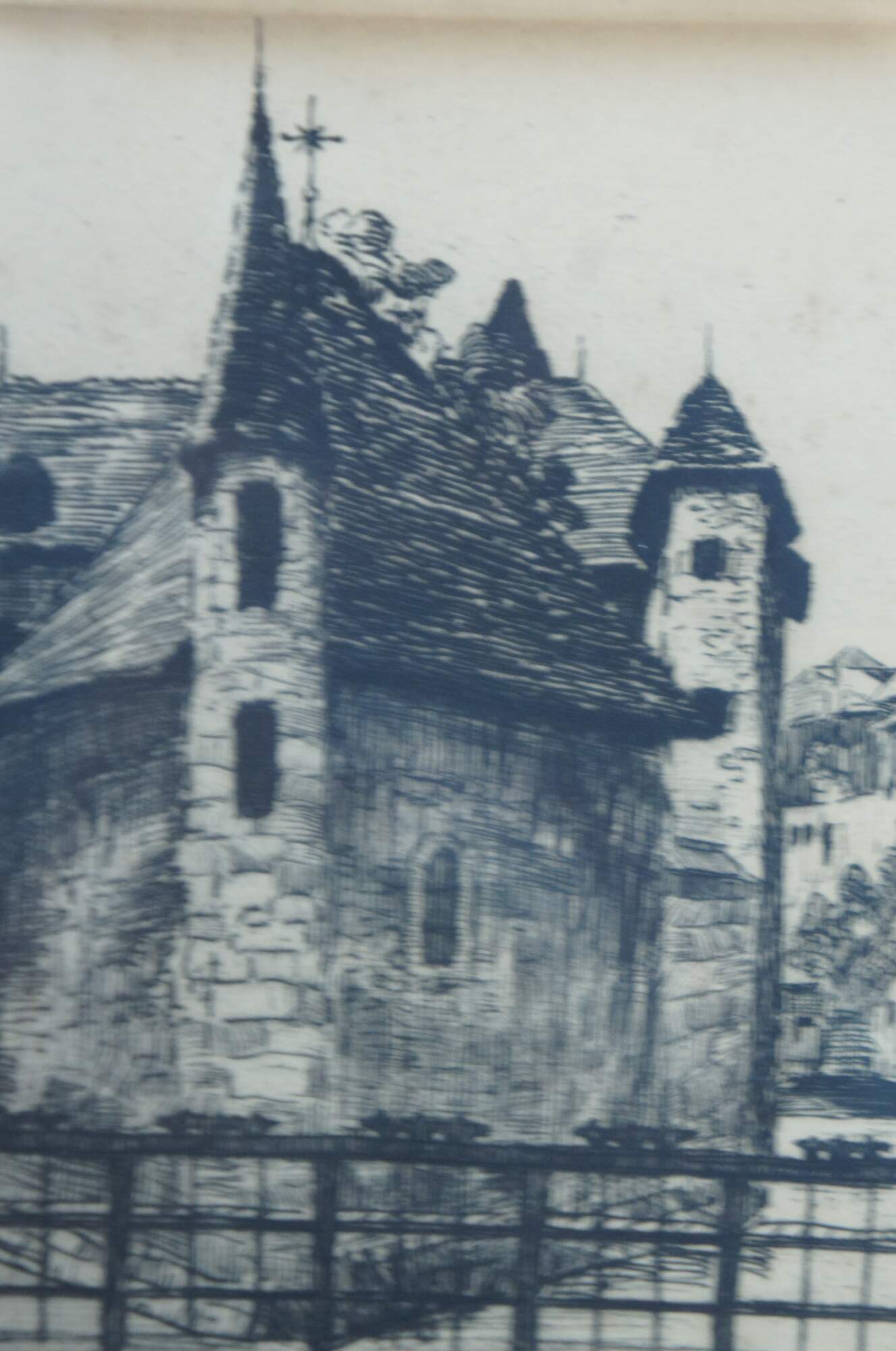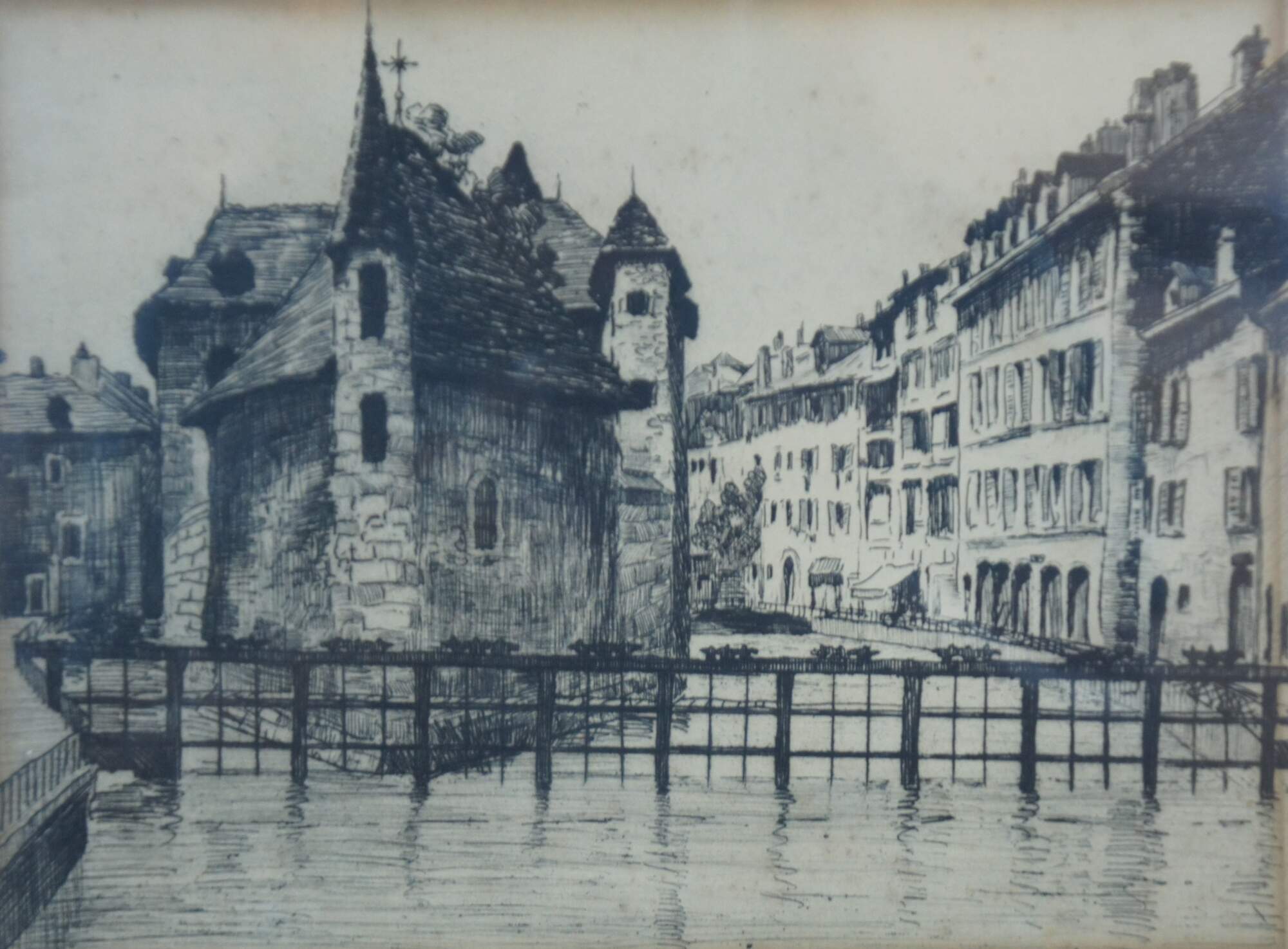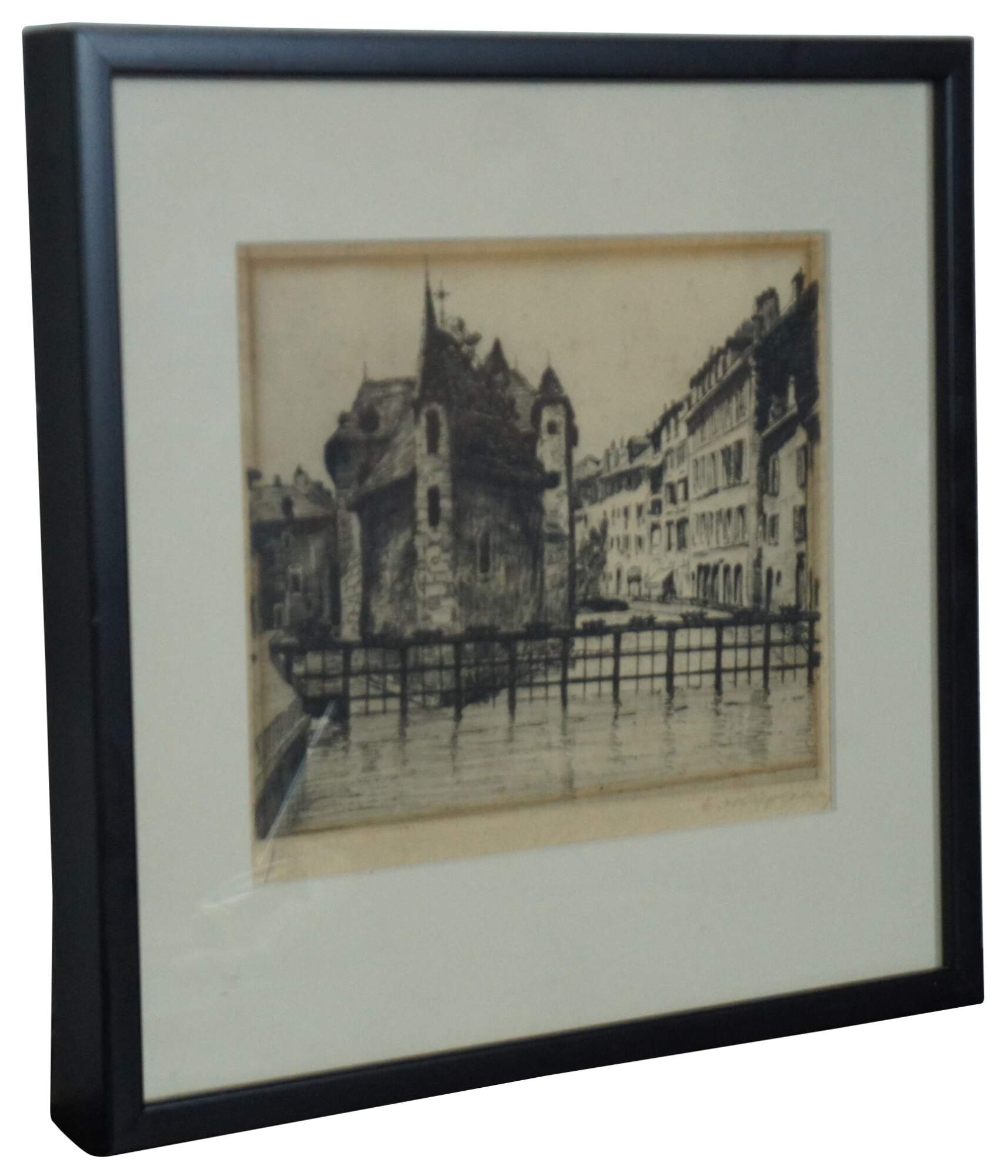Antique drypoint etching showing a European cityscape (attributed to Venice Italy) of canals and buildings. Pencil signed and numbered 1/25.