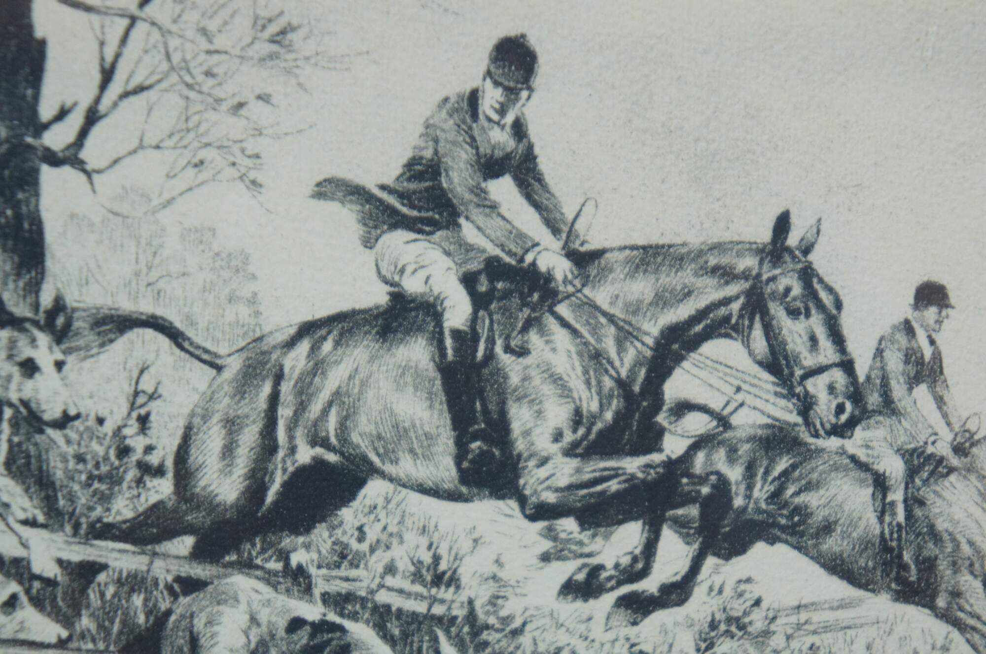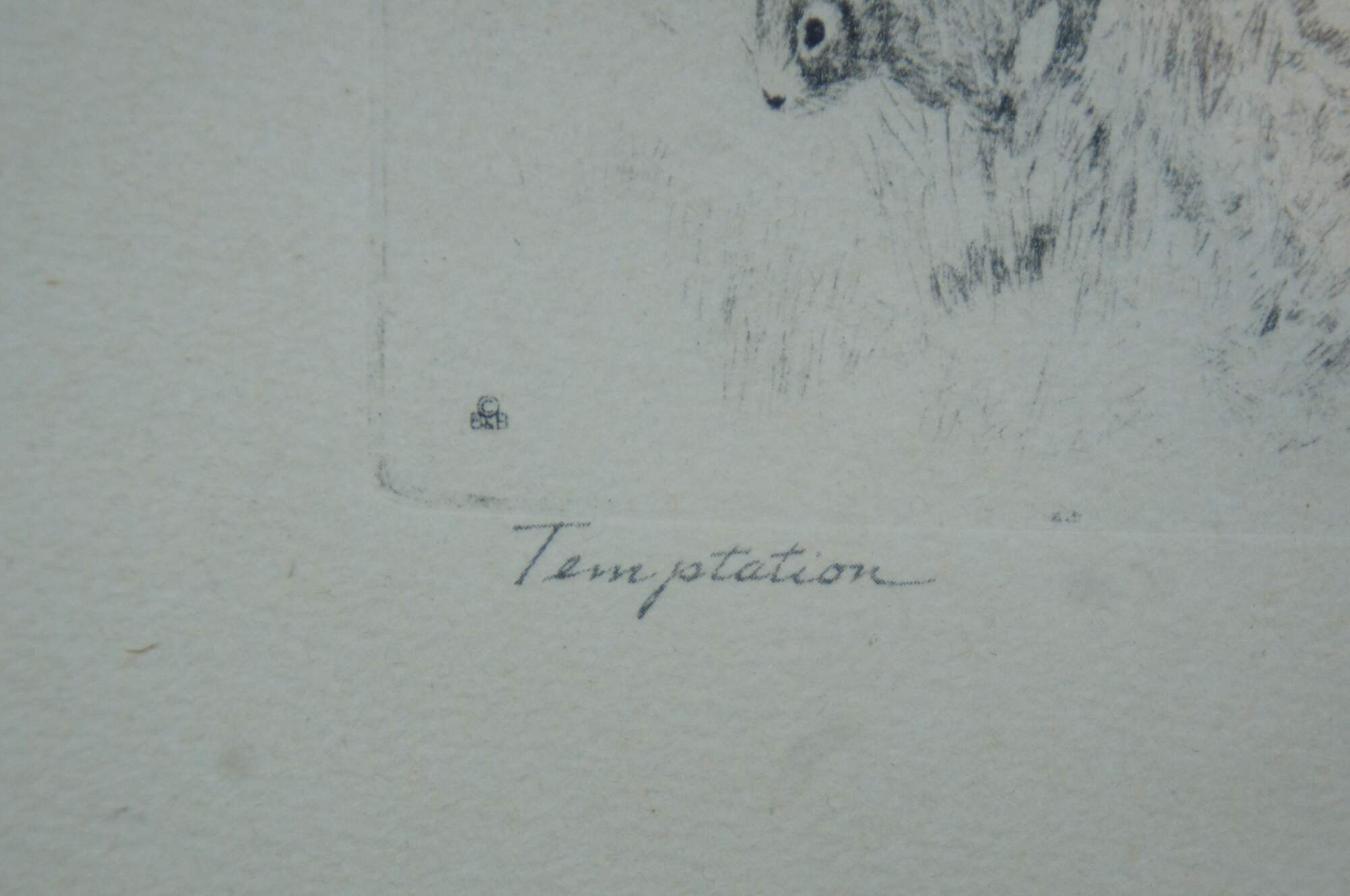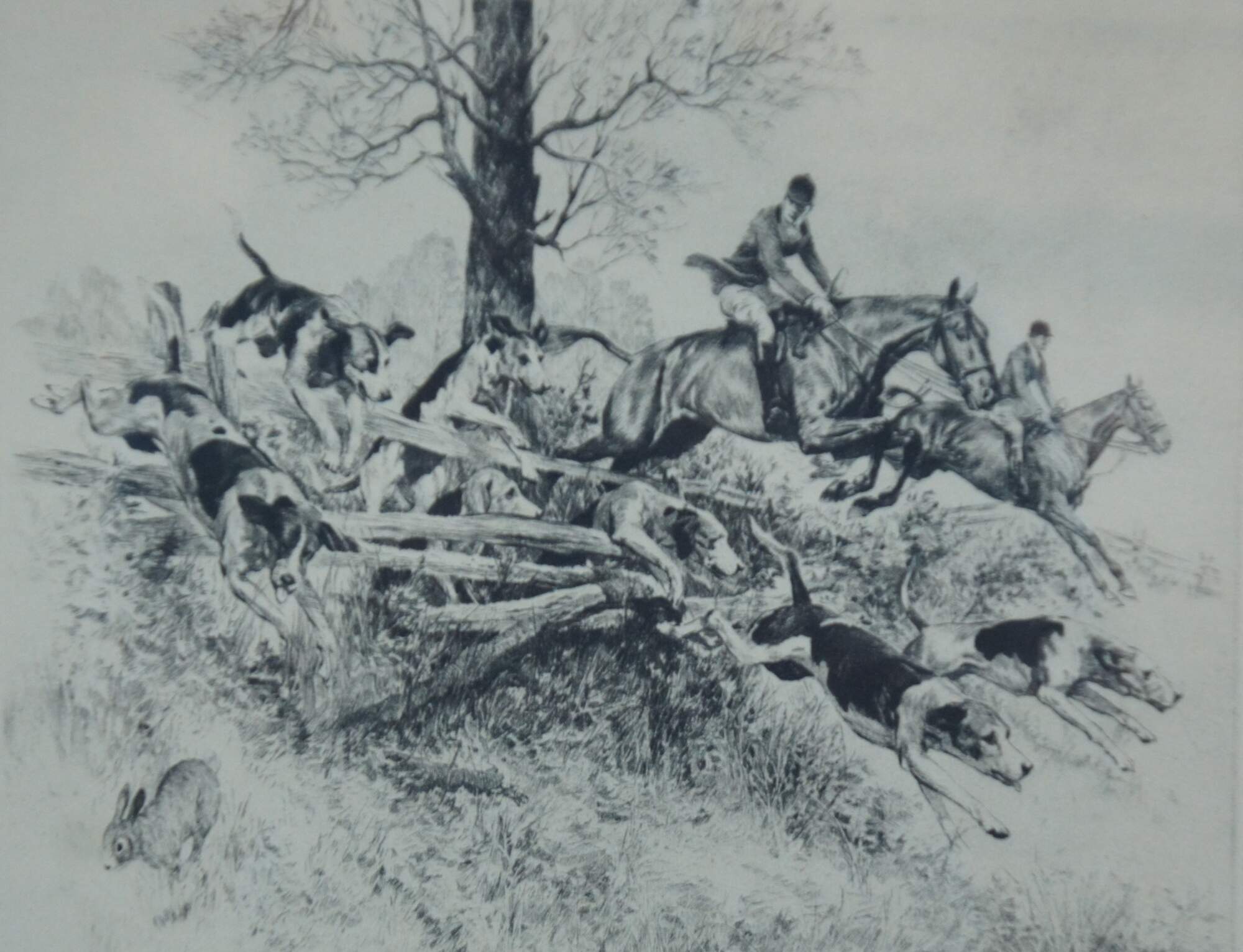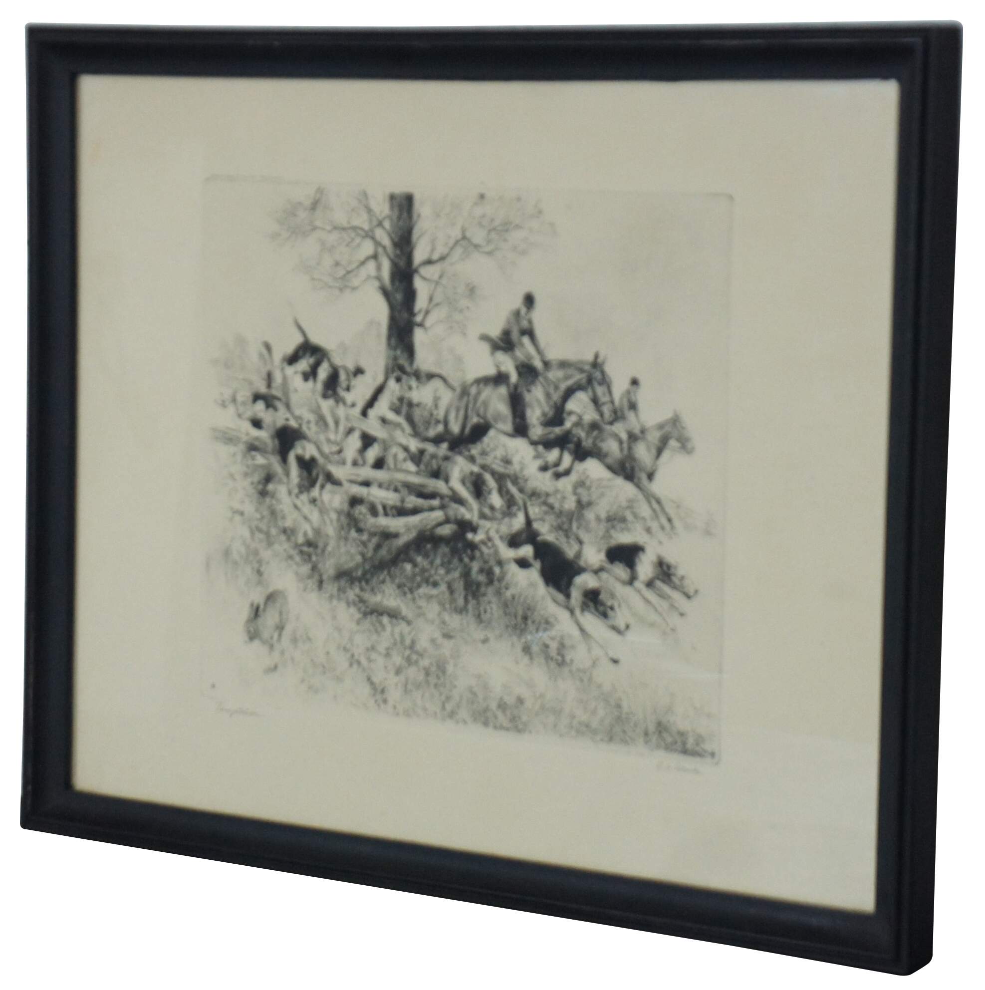 Early to mid 20th century drypoint etching by Reinhold Palenske titled “Temptation,” showing a pack of fox hounds and men on horseback clearing a fence, while one dog notices a rabbit running out of the way. Signed in plate.