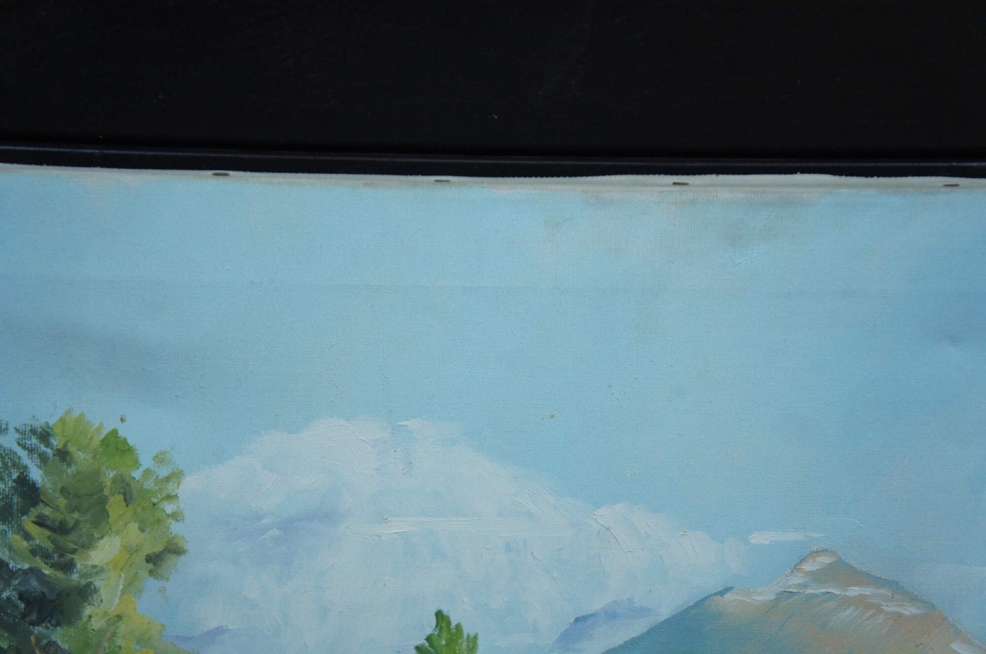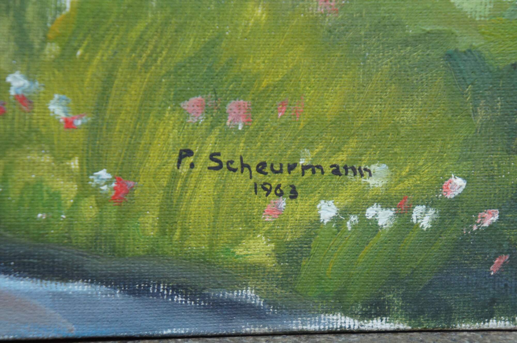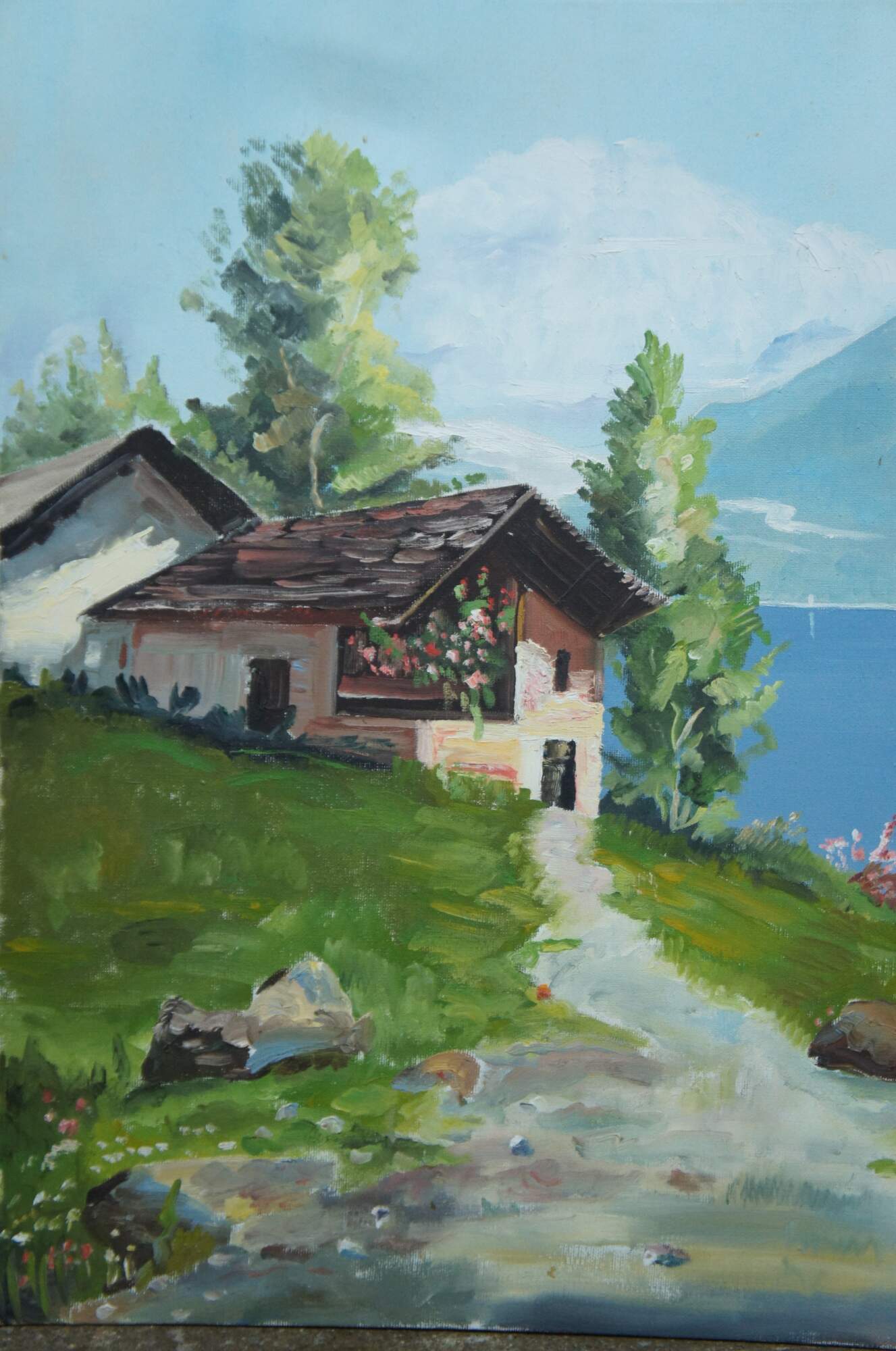 1963 mid century oil on canvas nautical landscape painting of a small cottage by a large lake / river / sea with mountains and sailboats in the background; signed P. (Paul) Scheurmann 1963.