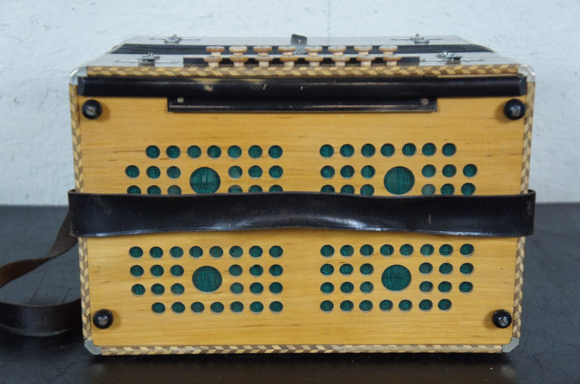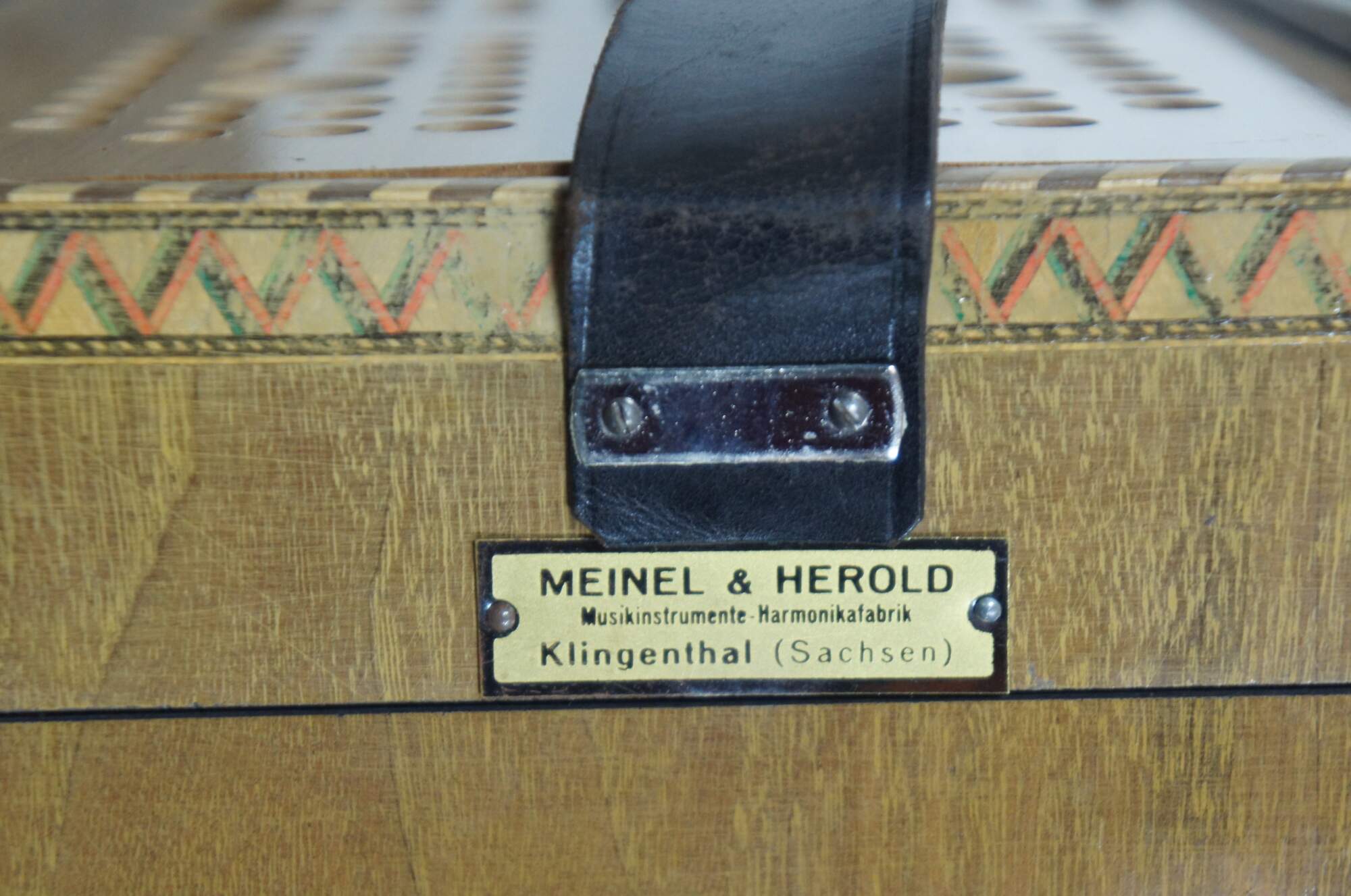 Antique inlaid parquetry design and painted accordion or squeezebox with mother of pearl buttons, leather strap, and a wooden case lined with green baize / felt, made by Meinel & Herold Musikinstrumente-Harmonikafabrik Klingenthal (Sachsen).