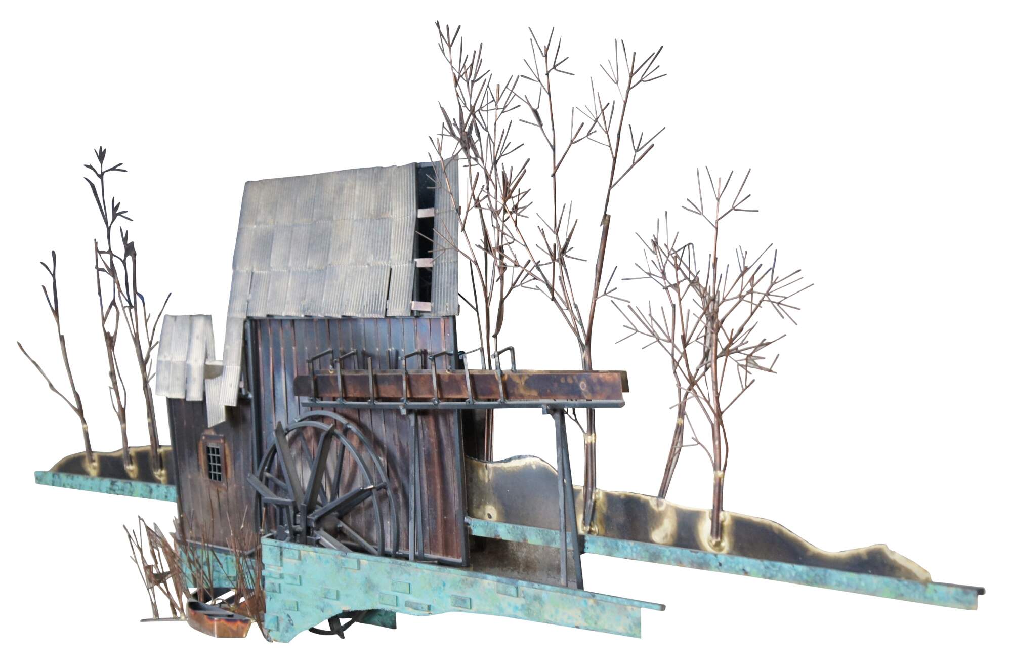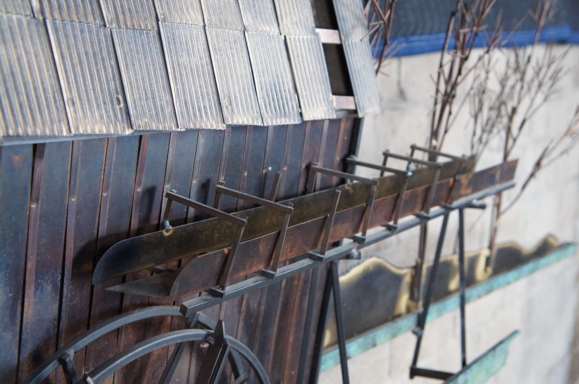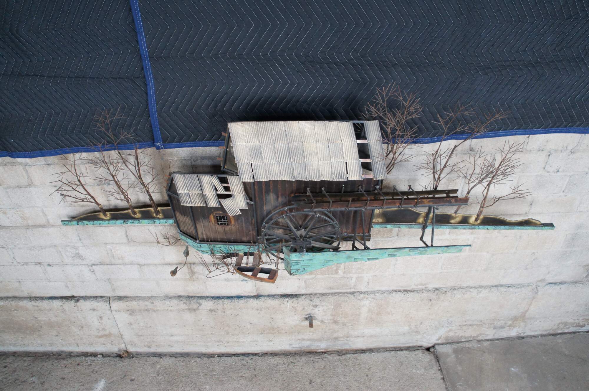 1970s mid century Curtis Jere brutalist style wall art sculpture. Made of copper, brass and steel featuring a primitive country or farmhouse landscape scene along a river complete with mill house, barn and water wheel.