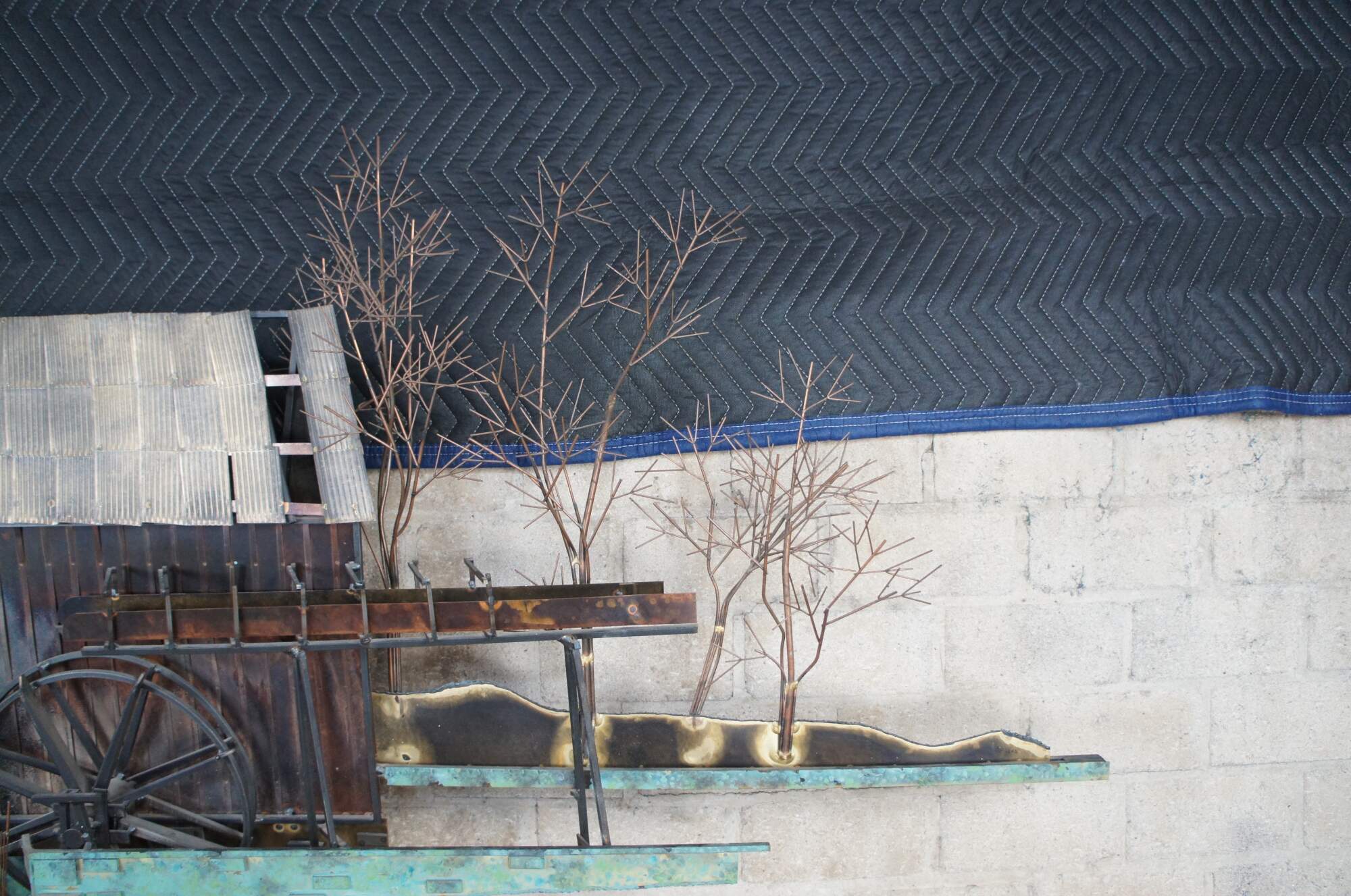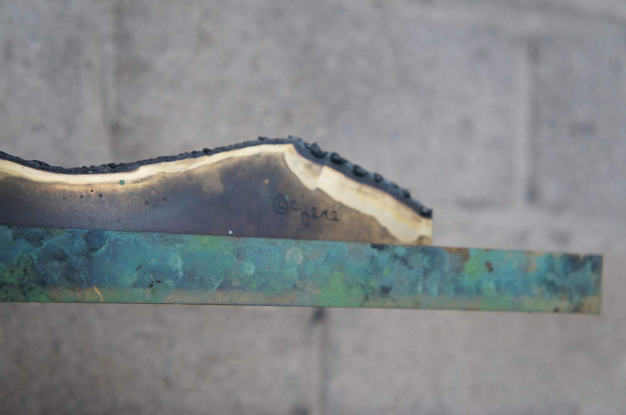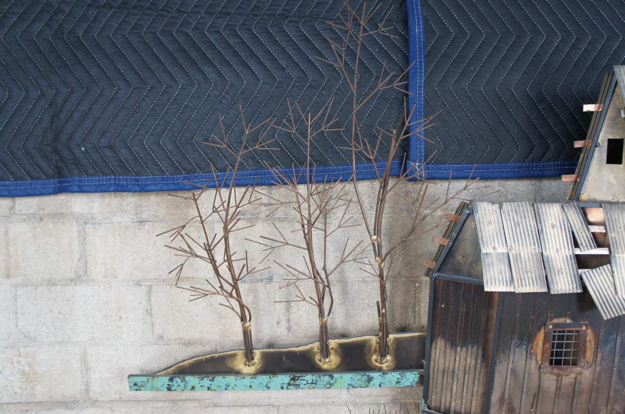 1970s mid century Curtis Jere brutalist style wall art sculpture. Made of copper, brass and steel featuring a primitive country or farmhouse landscape scene along a river complete with mill house, barn and water wheel.