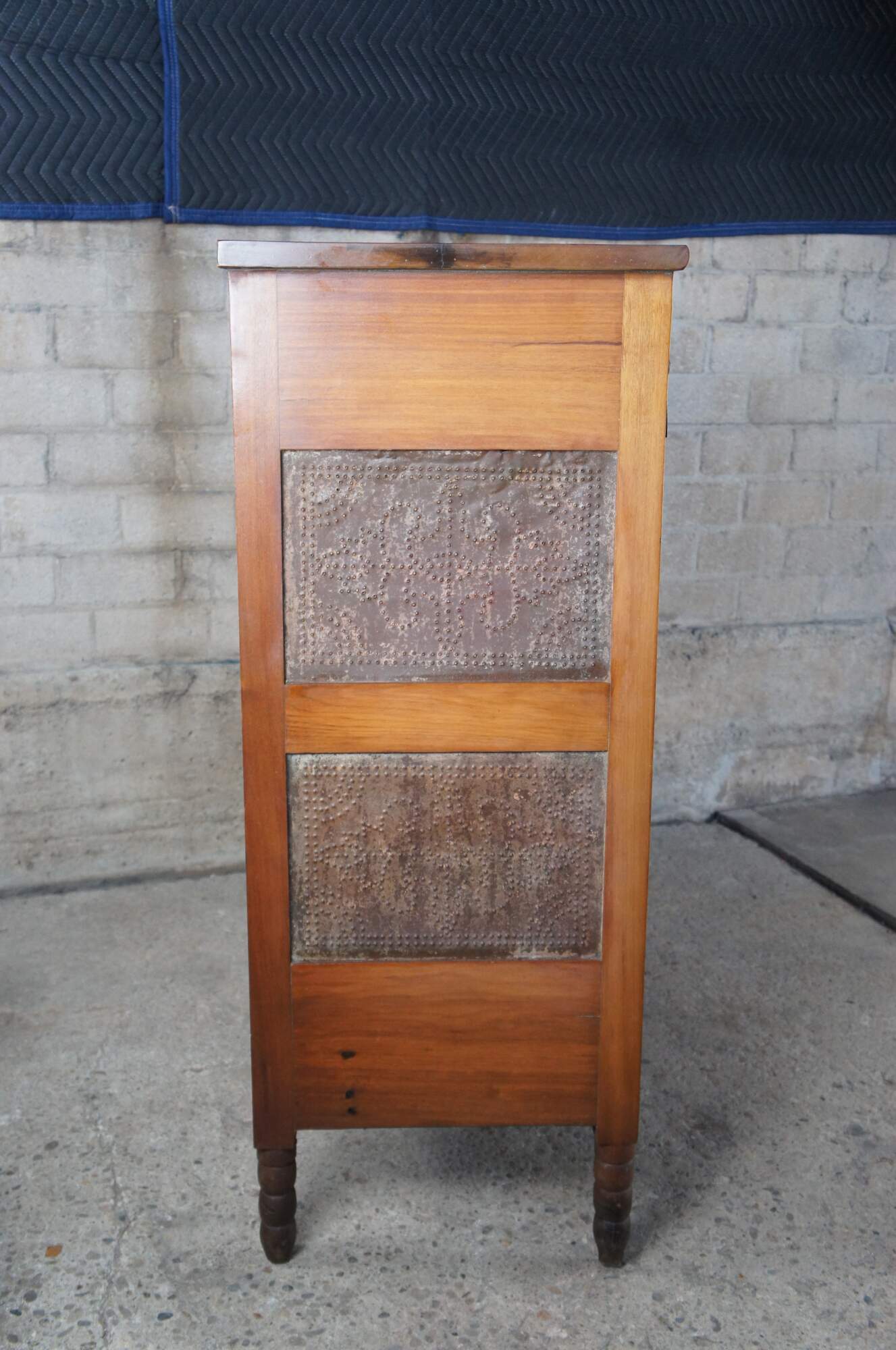 Antique American Country farmhouse pie safe, cupboard or kitchen cabinet. Made of walnut featuring punched tin panels, turned nubby legs and upper hand dovetailed divided locking drawer. Circa first half 19th century.