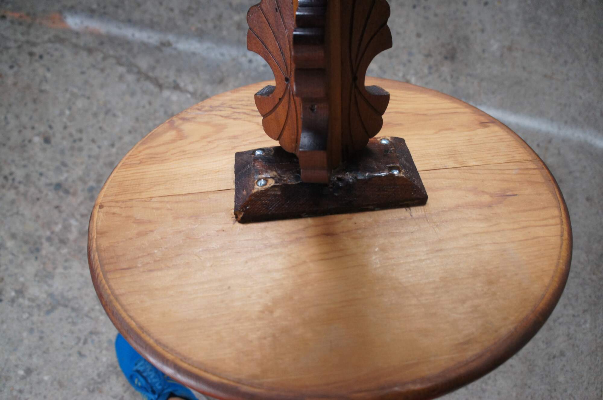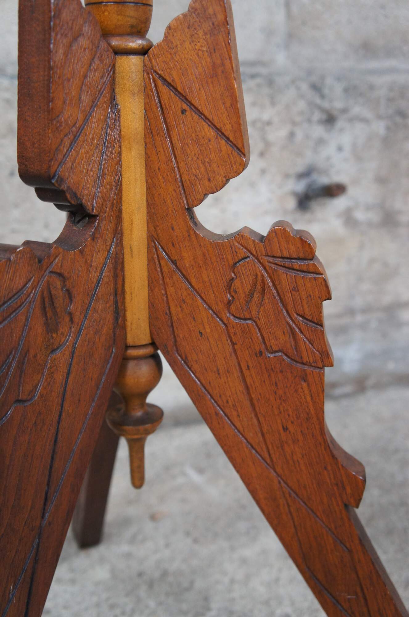 Antique Eastlake Victorian round oak parlor pedestal table featuring a tripod base with carved leaves and drop finial.