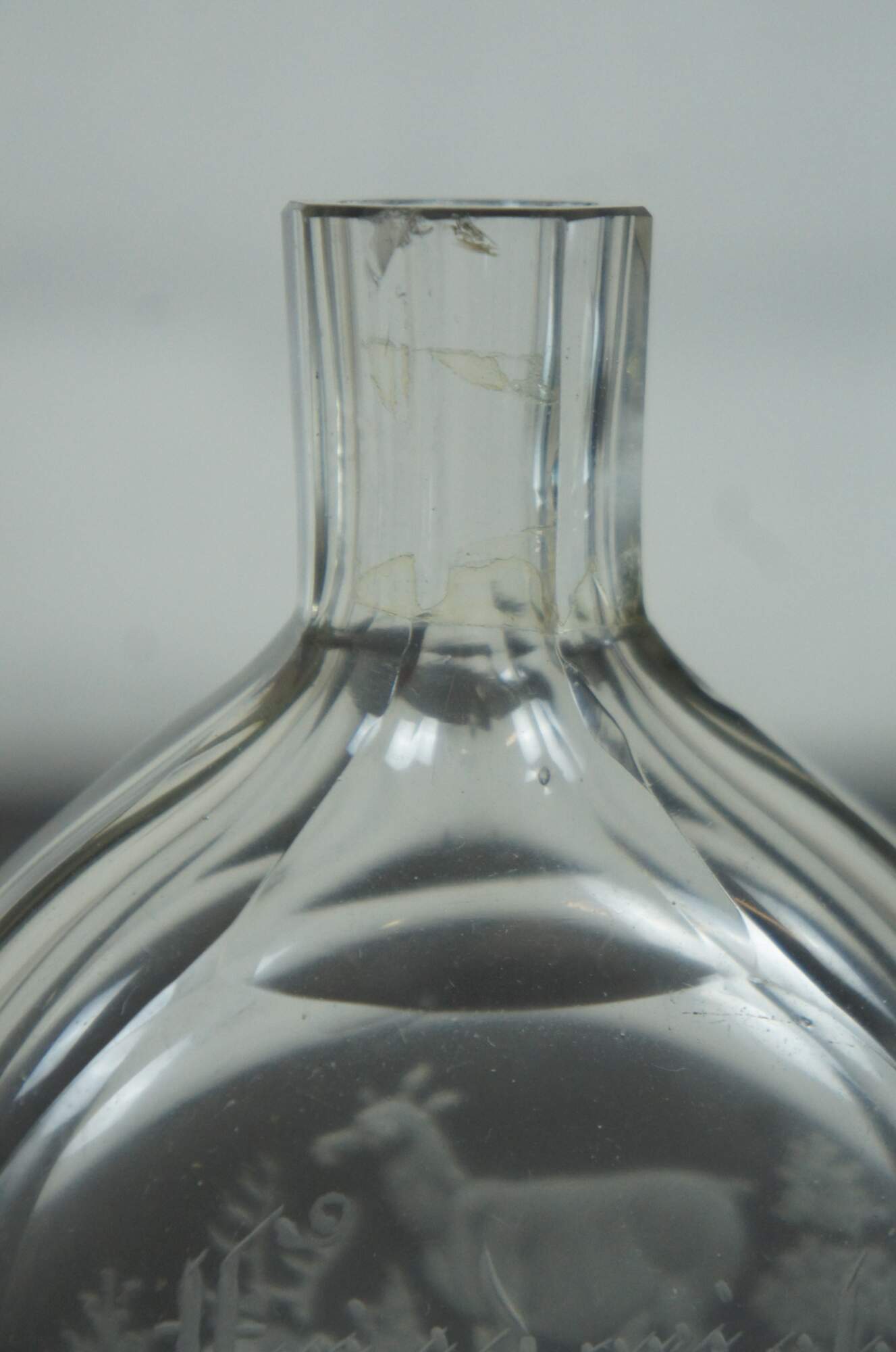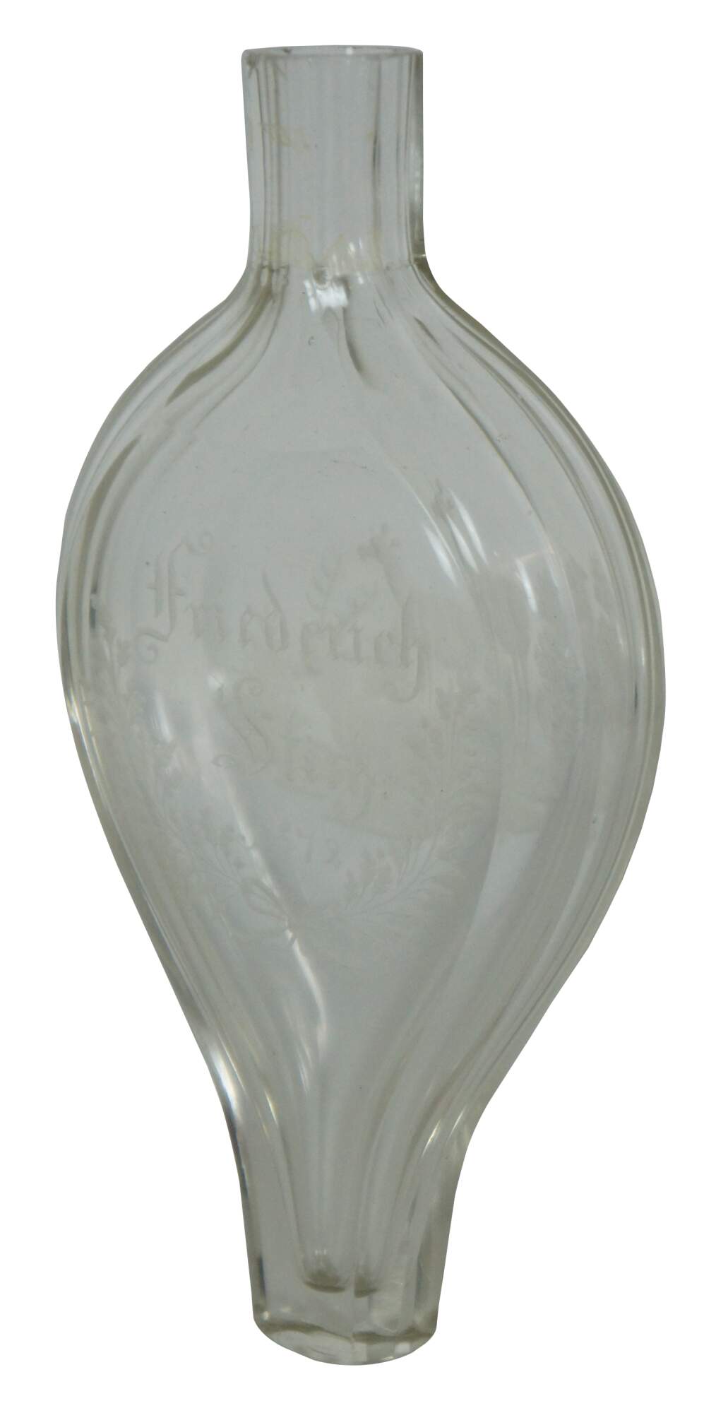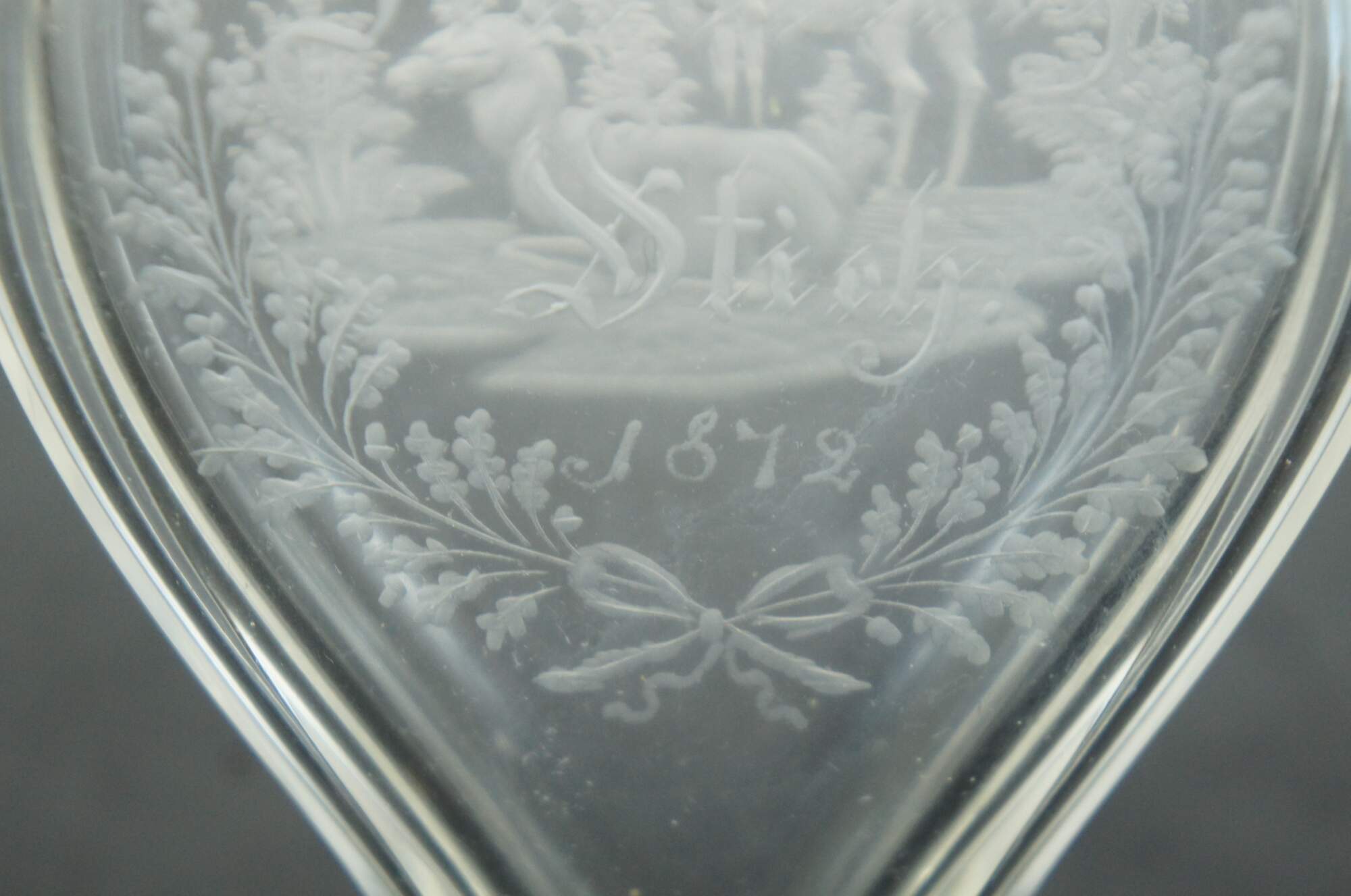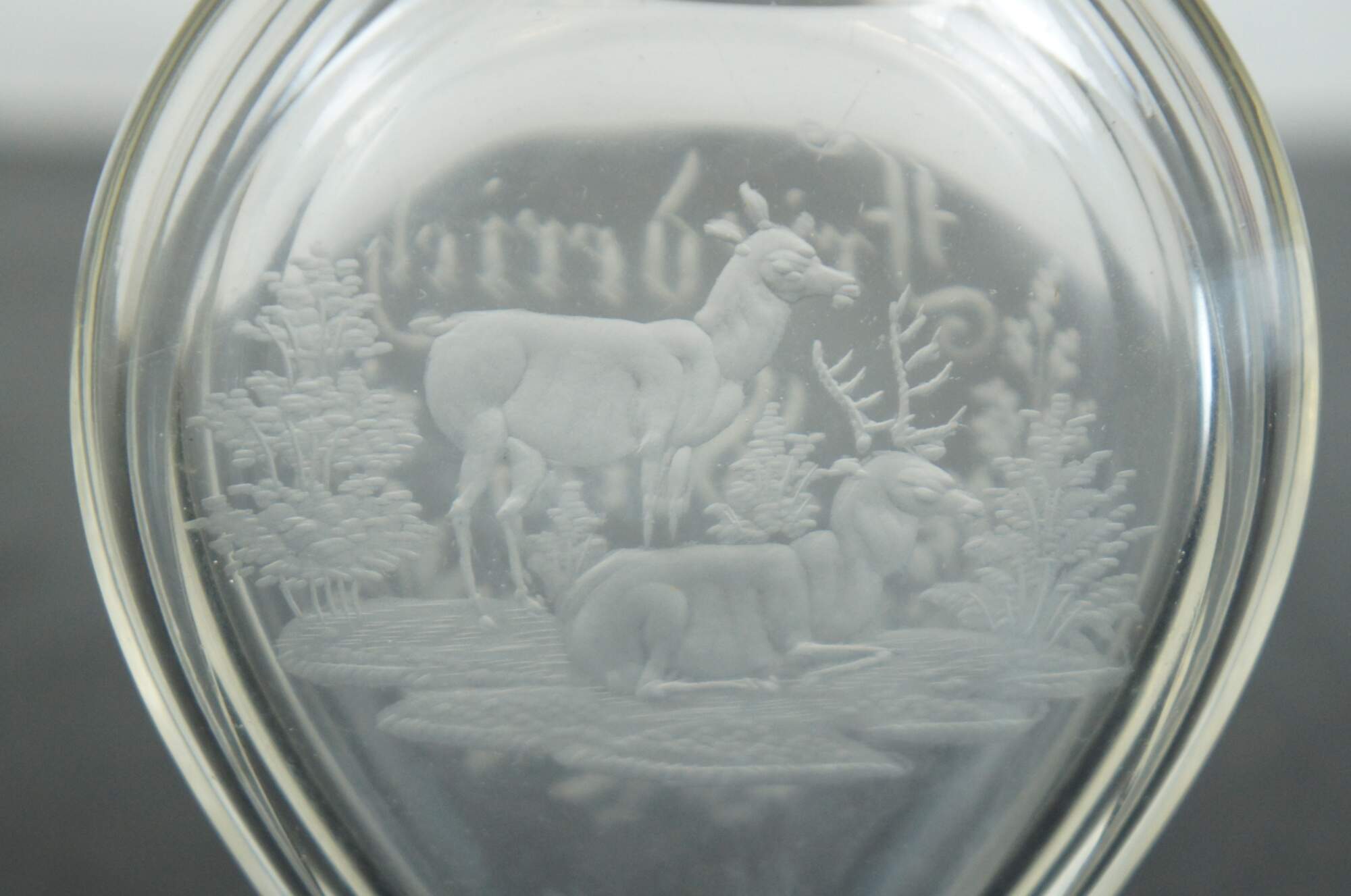 Rare antique late 19th century German etched glass perfume bottle / apothecary decanter or bud vase featuring unusual teardrop form with a narrow octagonal base and top. Eetched on one side with the words Friederich Stioh 1872 above a pair of oak branches tied with a ribbon, opposite a hunt landscape featuring a pair of stags or deer.