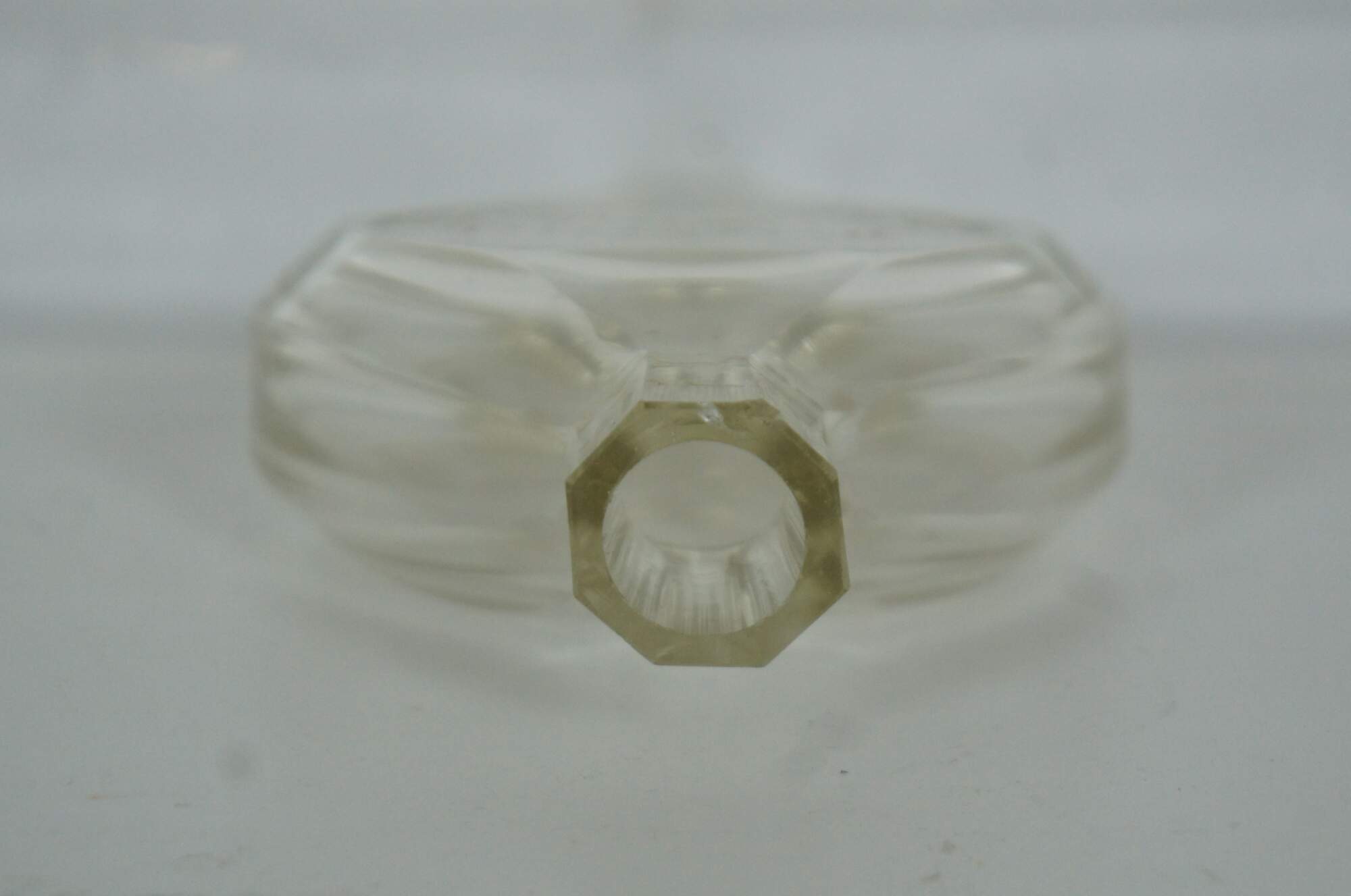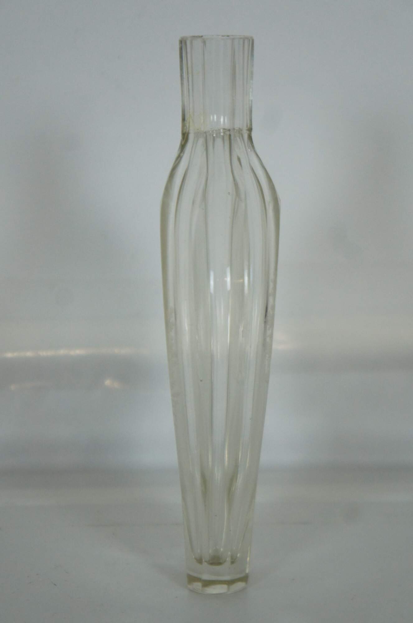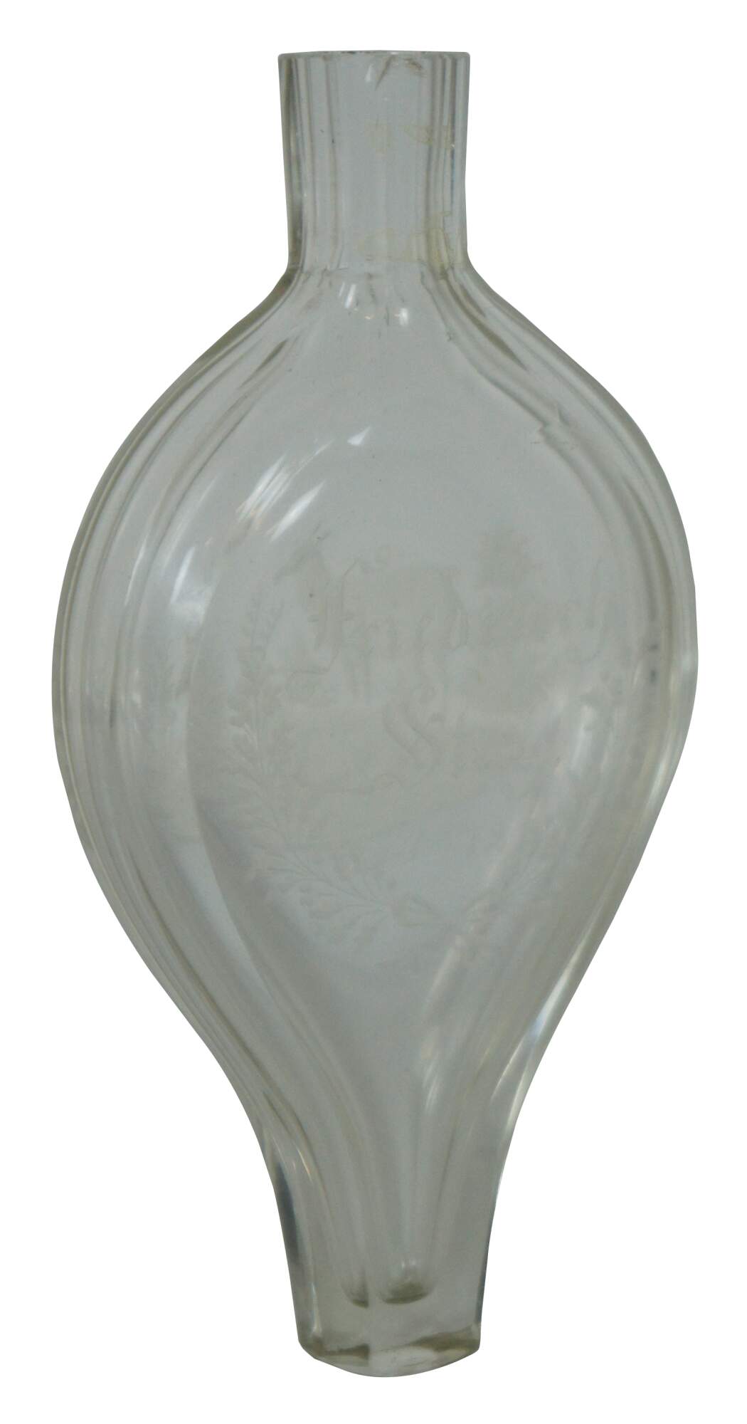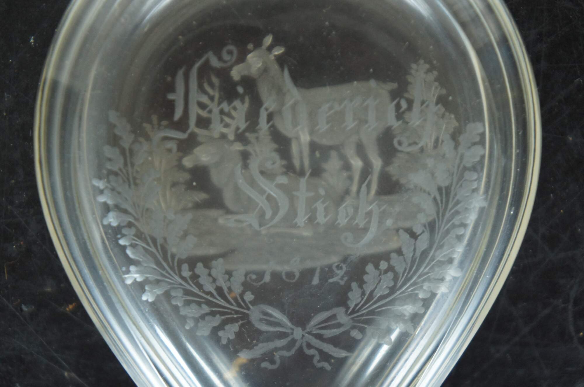 Rare antique late 19th century German etched glass perfume bottle / apothecary decanter or bud vase featuring unusual teardrop form with a narrow octagonal base and top. Eetched on one side with the words Friederich Stioh 1872 above a pair of oak branches tied with a ribbon, opposite a hunt landscape featuring a pair of stags or deer.