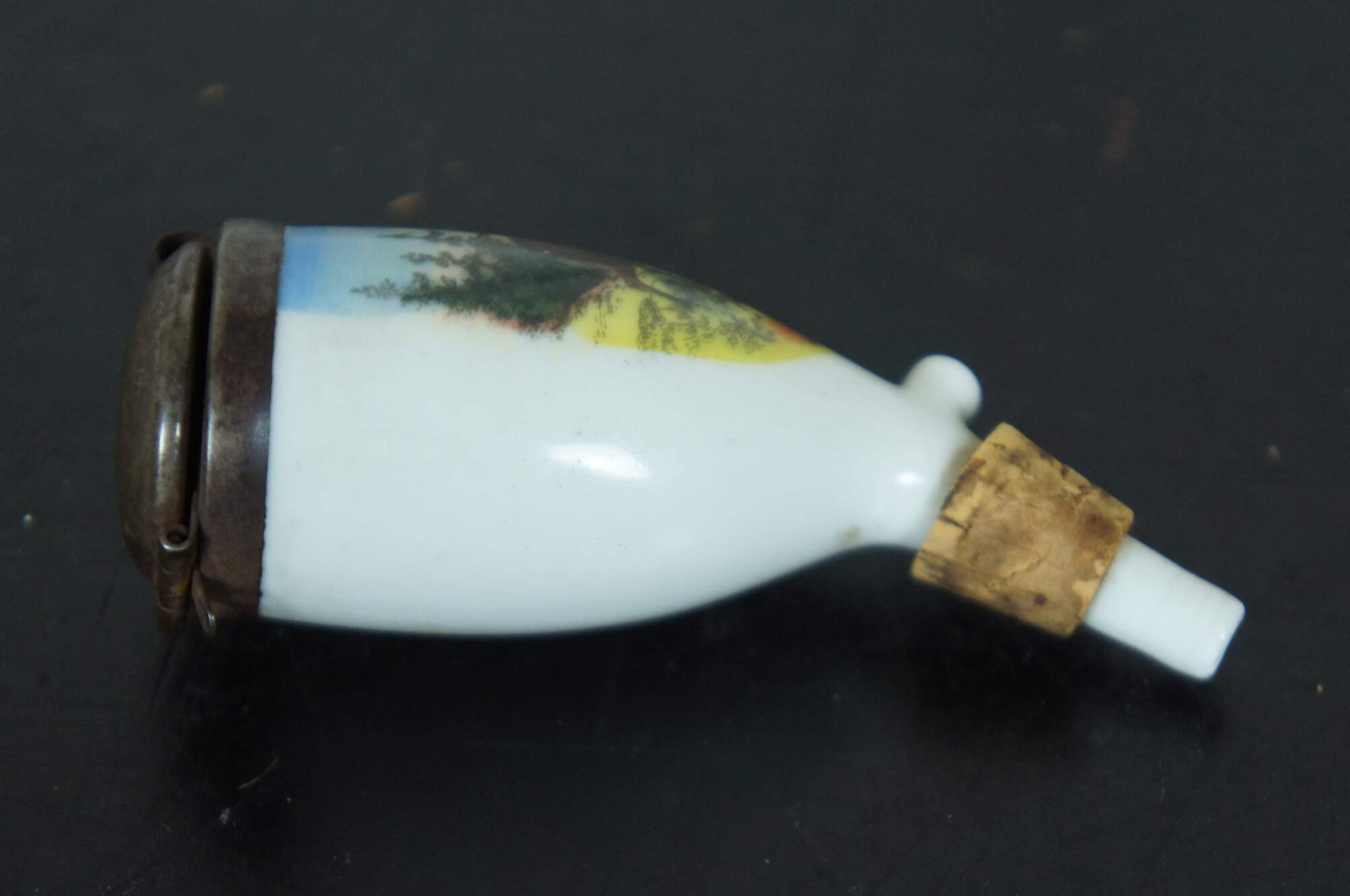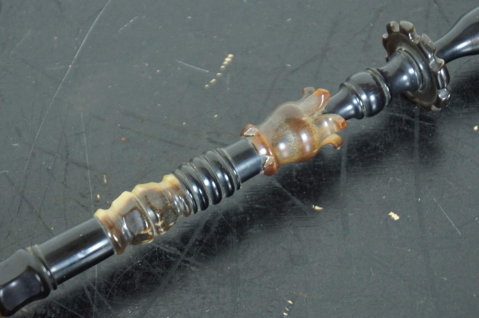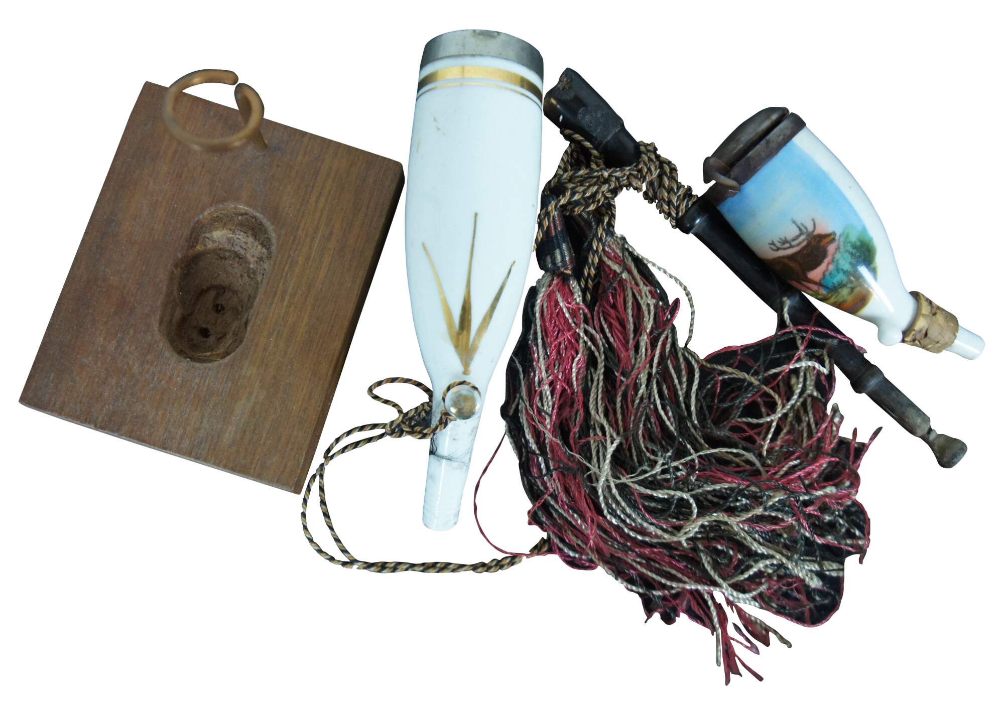 Lot of five vintage German pipe pieces including one long carved and flexible cloth pipe stem/mouthpiece, one large porcelain bowl with gilded accent and carved mouthpiece, one smaller porcelain pipe bowl with printed elk, and a simple wood pipe display stand.