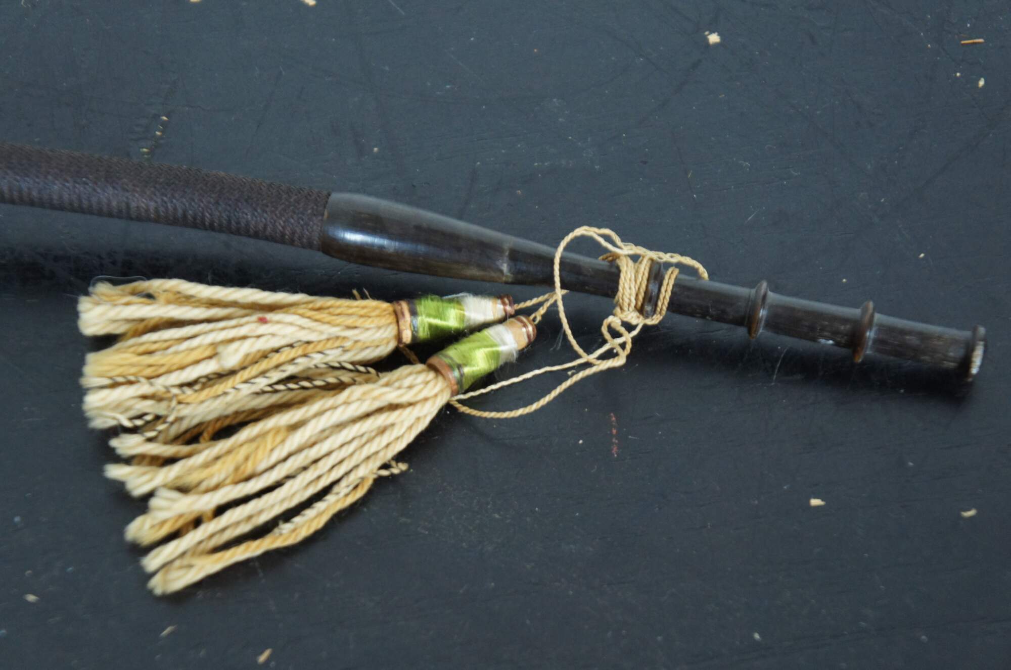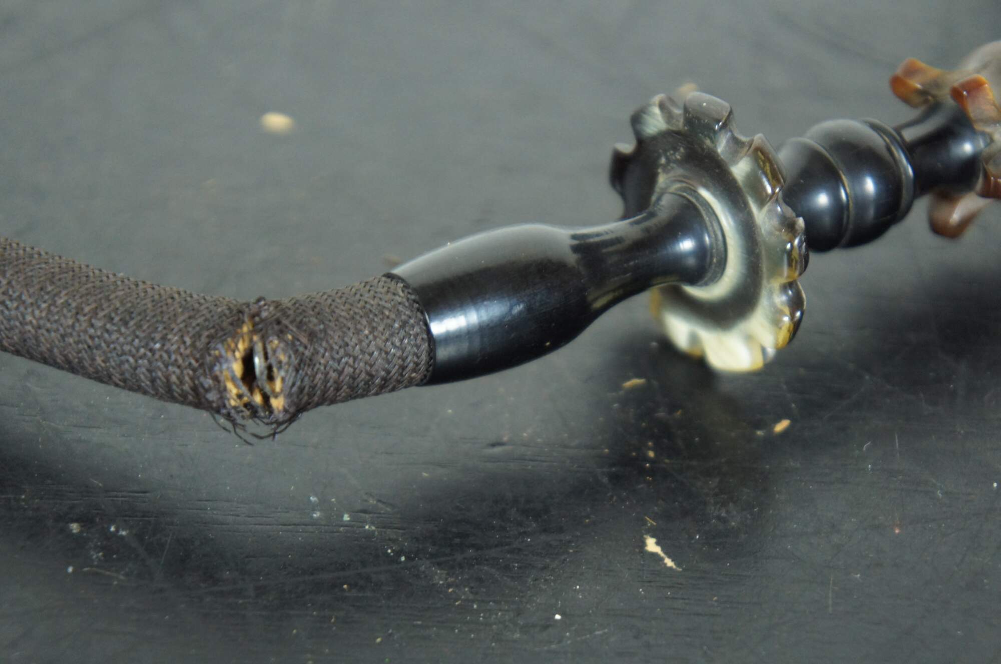 Fair Condition – Chipping to small pipe stem, split in fabric on large pipe stem, tarnish tho metal on bowls, gentle wear throughout.