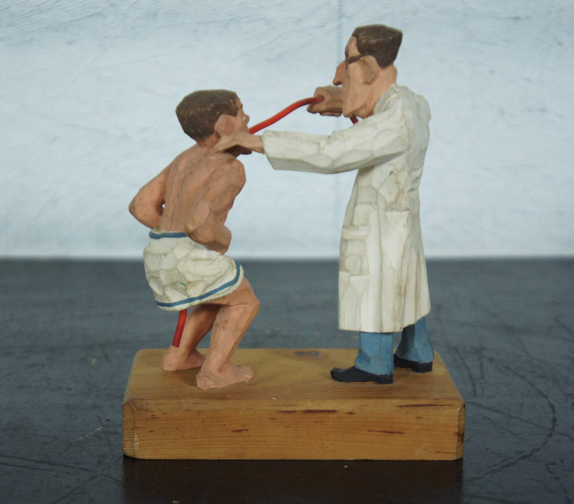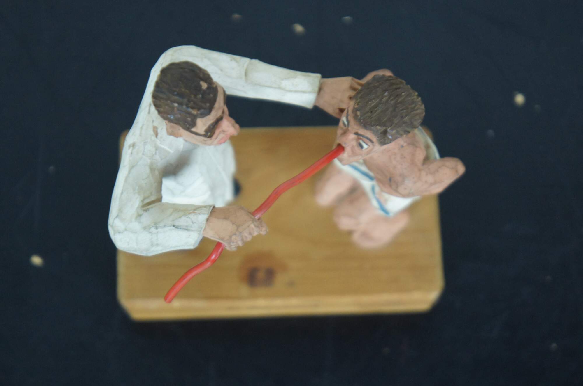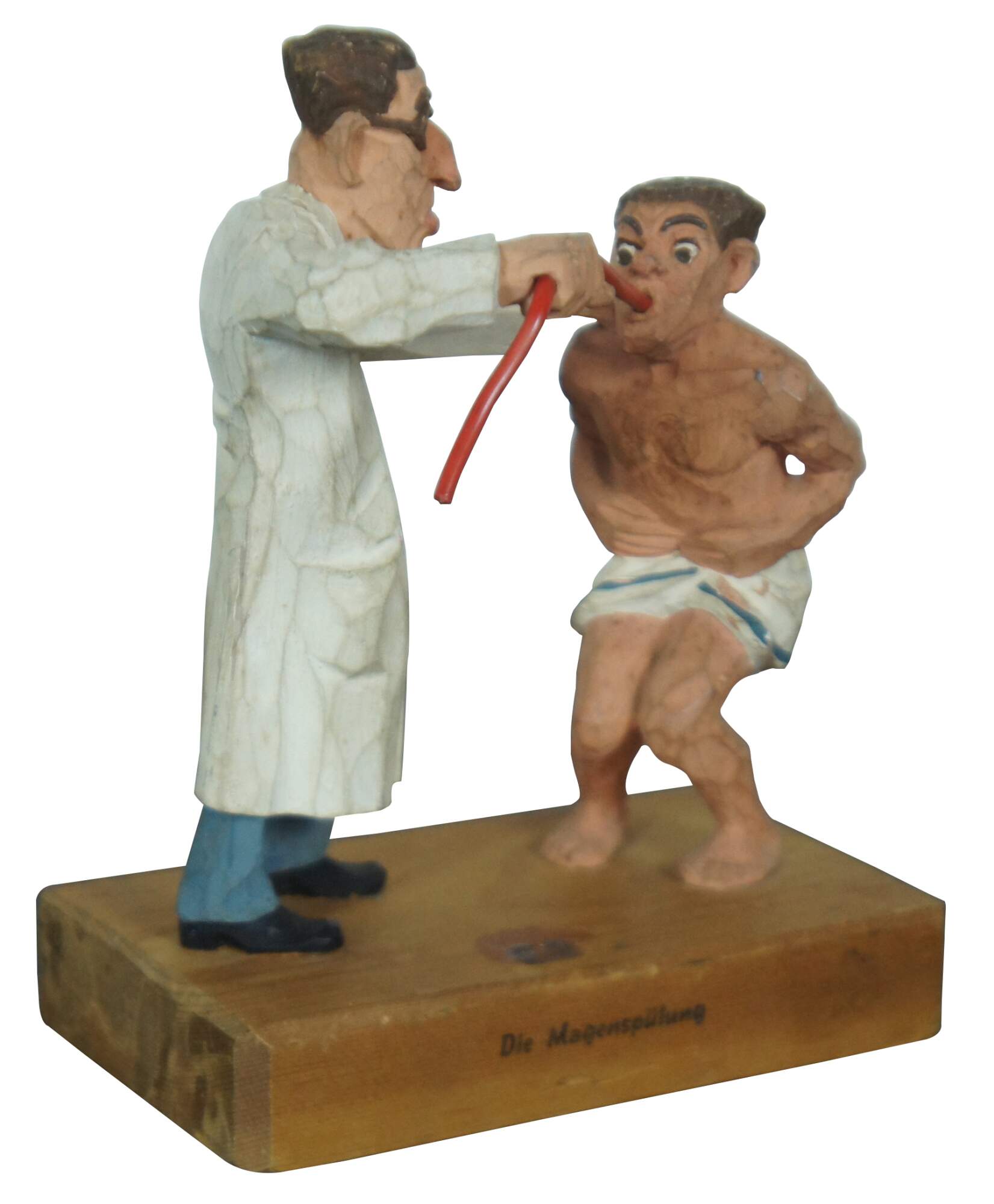 Vintage hand carved wood German novelty figurine titled “Die Magenspulung” (The Gastric Lavage), showing a doctor and a mostly naked patient undergoing an uncomfortable looking method of internal cleansing.
