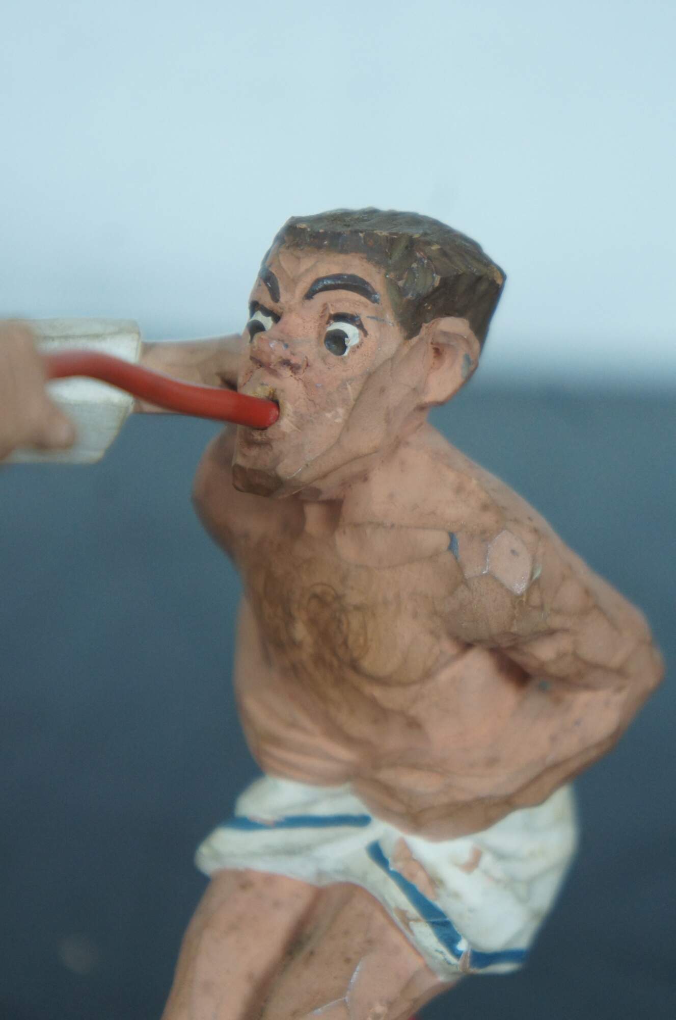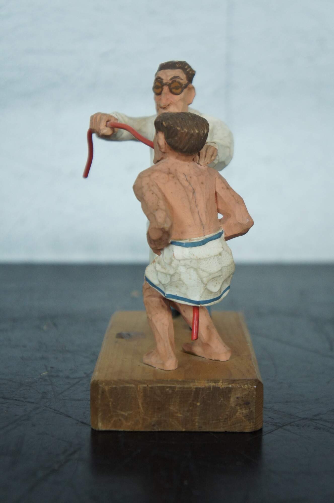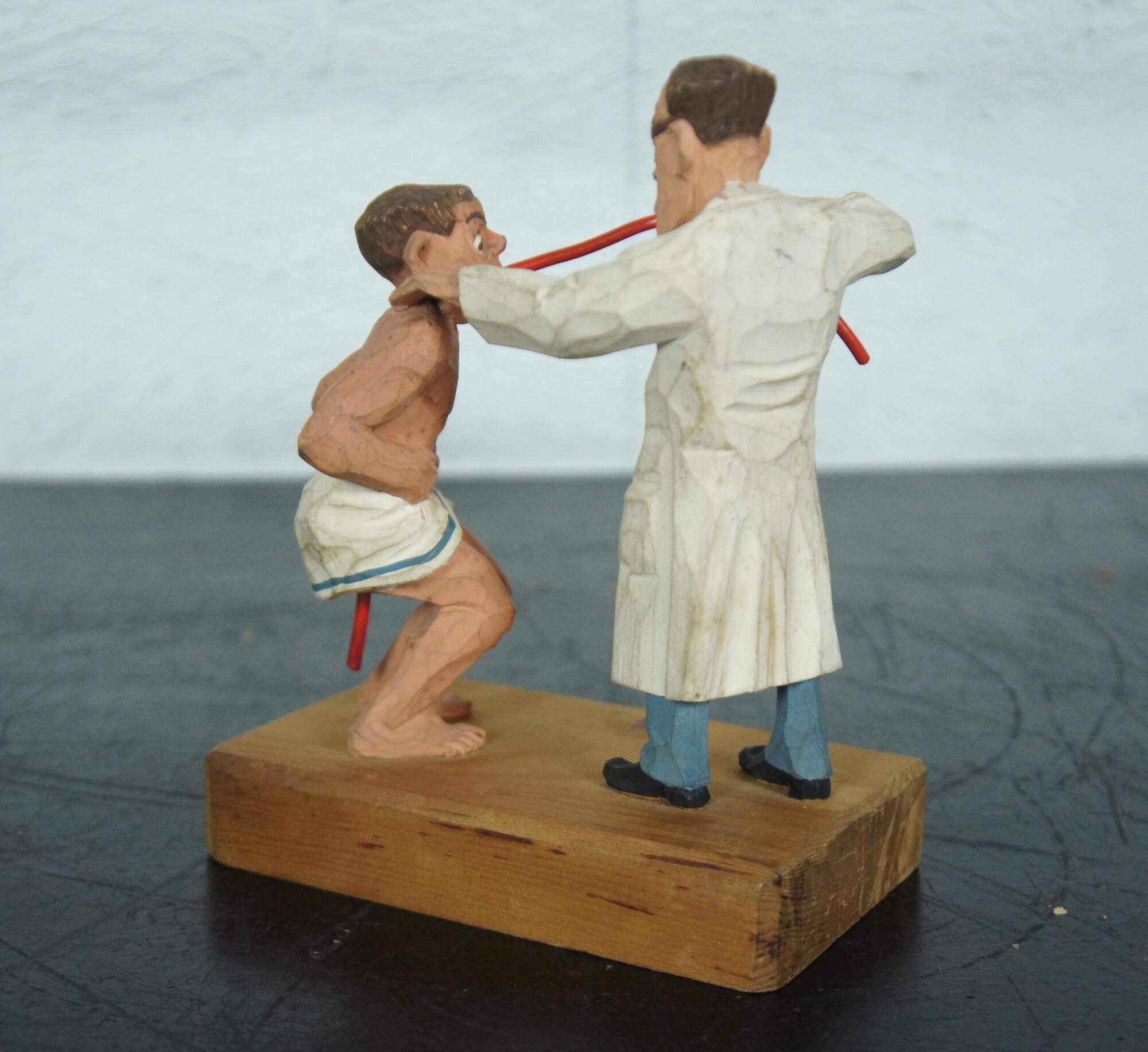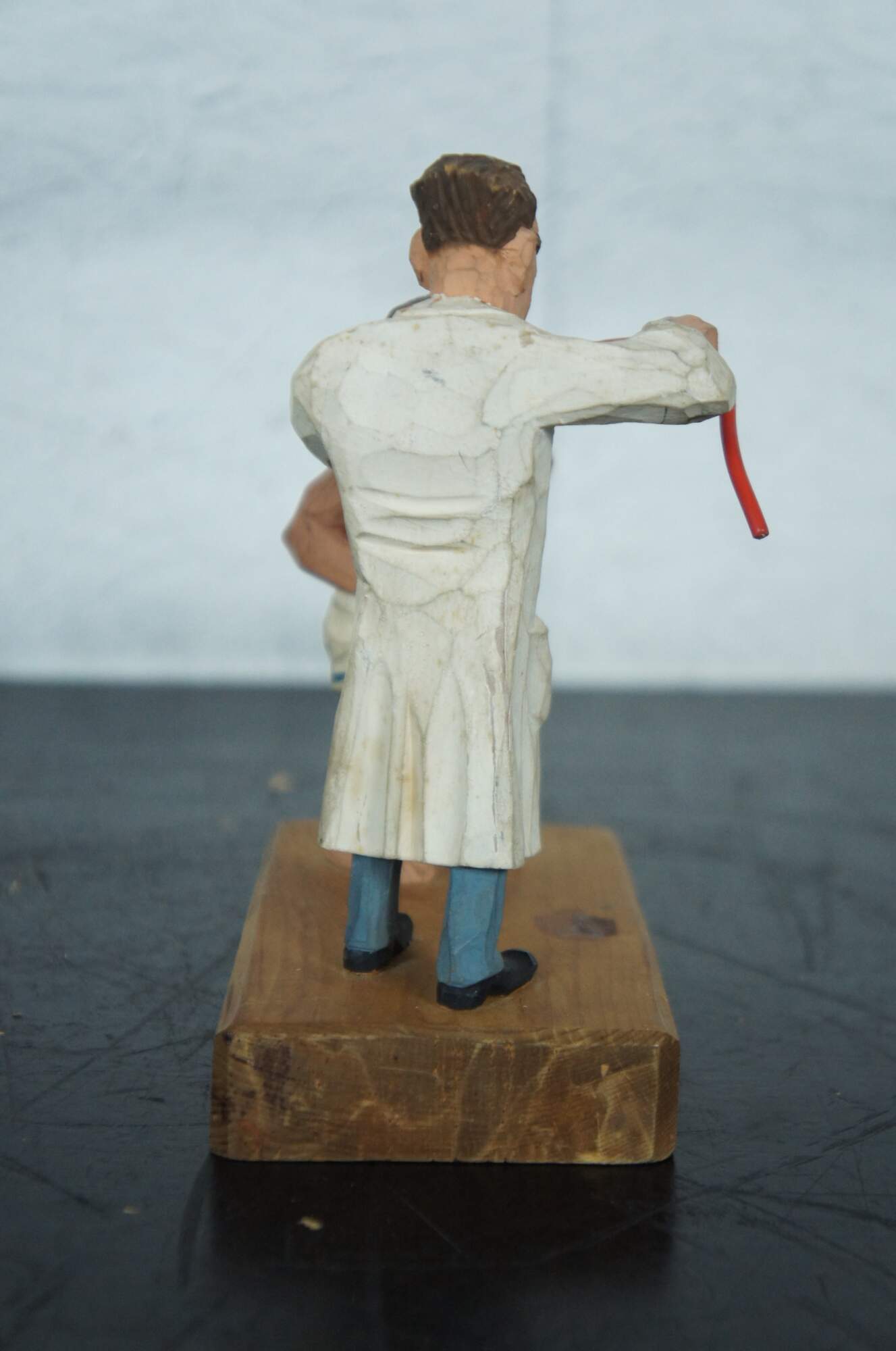 Vintage hand carved wood German novelty figurine titled “Die Magenspulung” (The Gastric Lavage), showing a doctor and a mostly naked patient undergoing an uncomfortable looking method of internal cleansing.