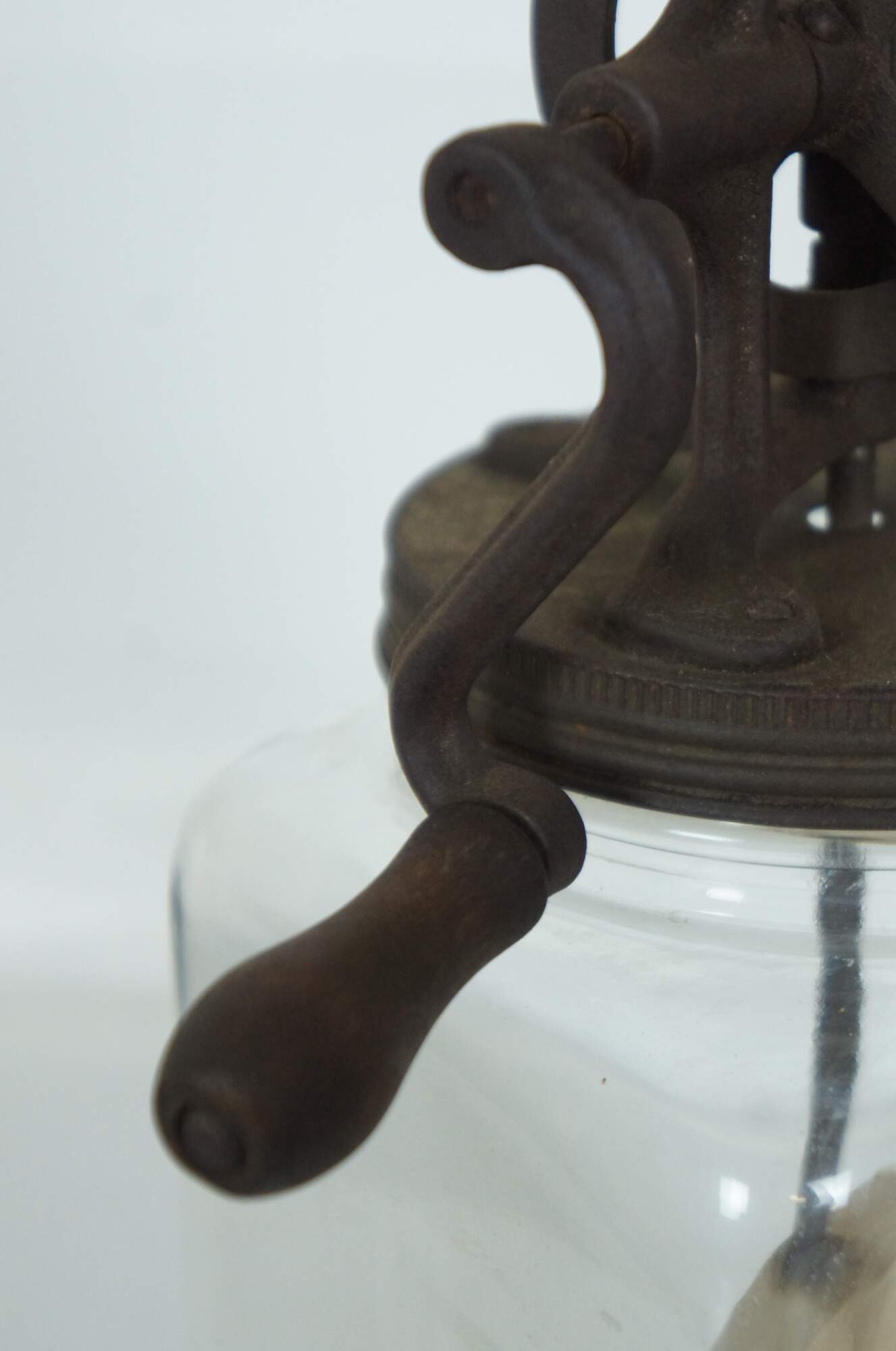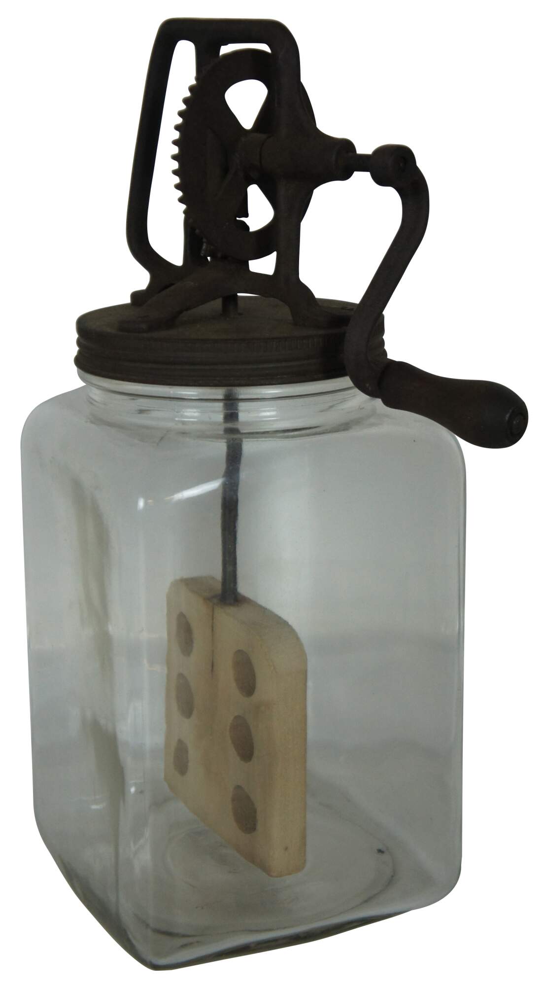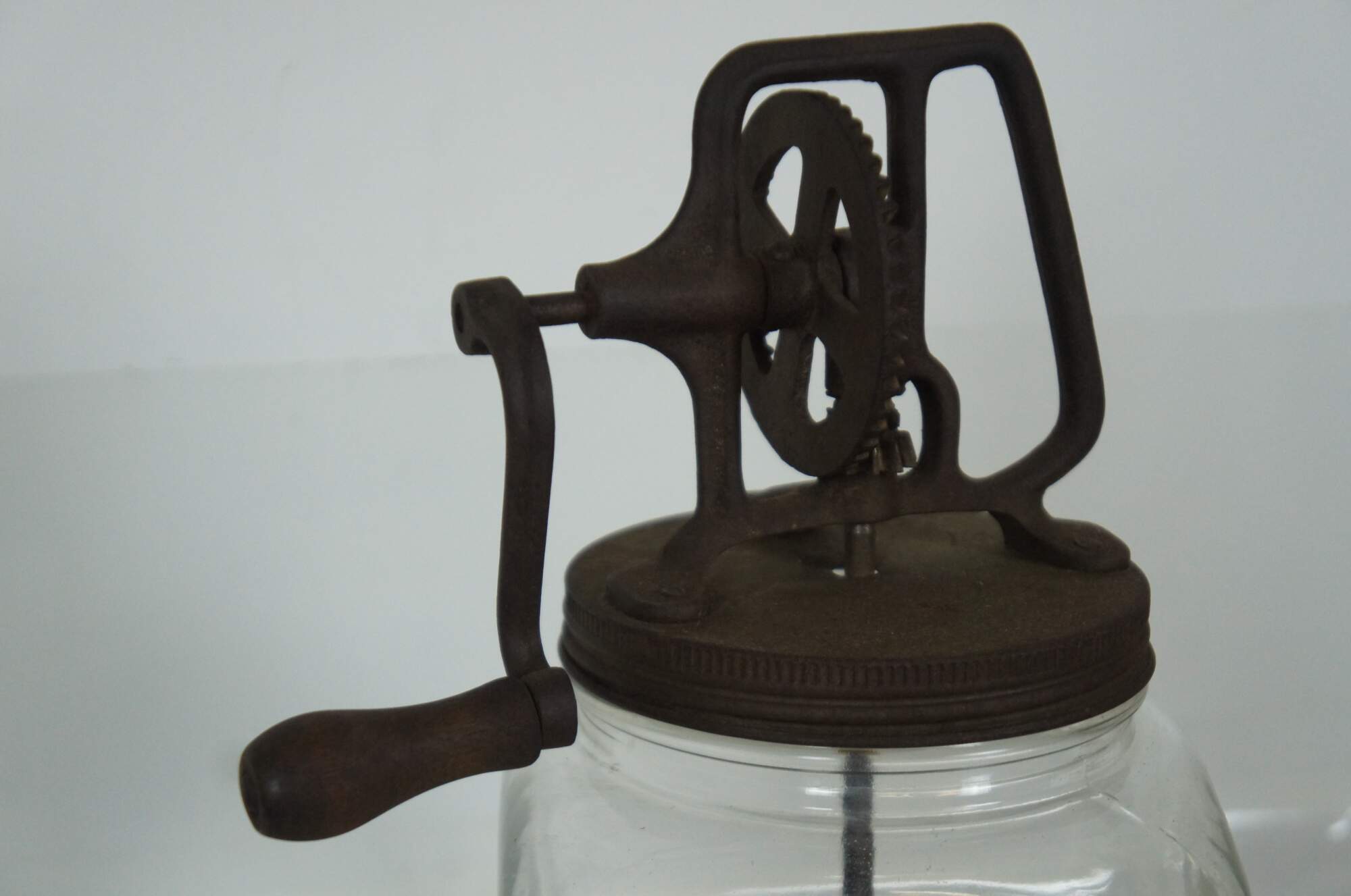 Antique Hazel Atlas Glass square jar butter churn with metal lid, iron crank and wooden paddle.
