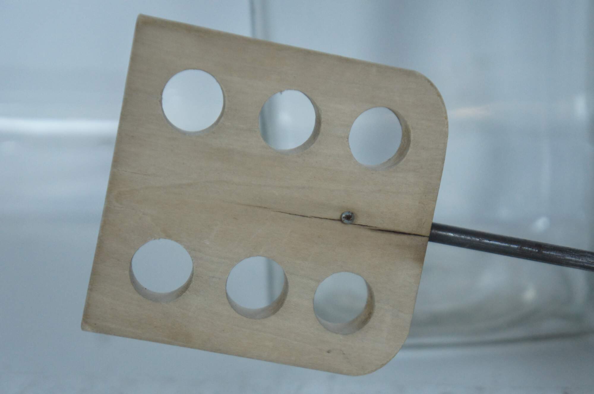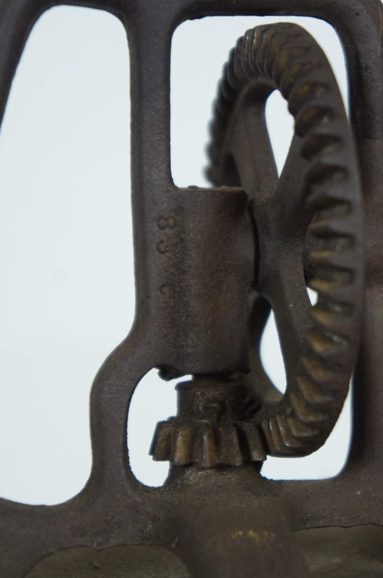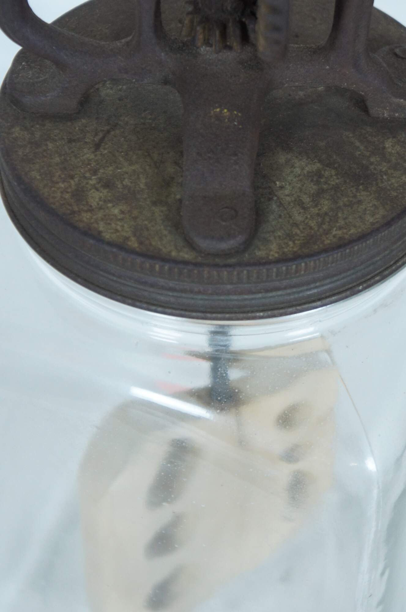 Antique Hazel Atlas Glass square jar butter churn with metal lid, iron crank and wooden paddle.