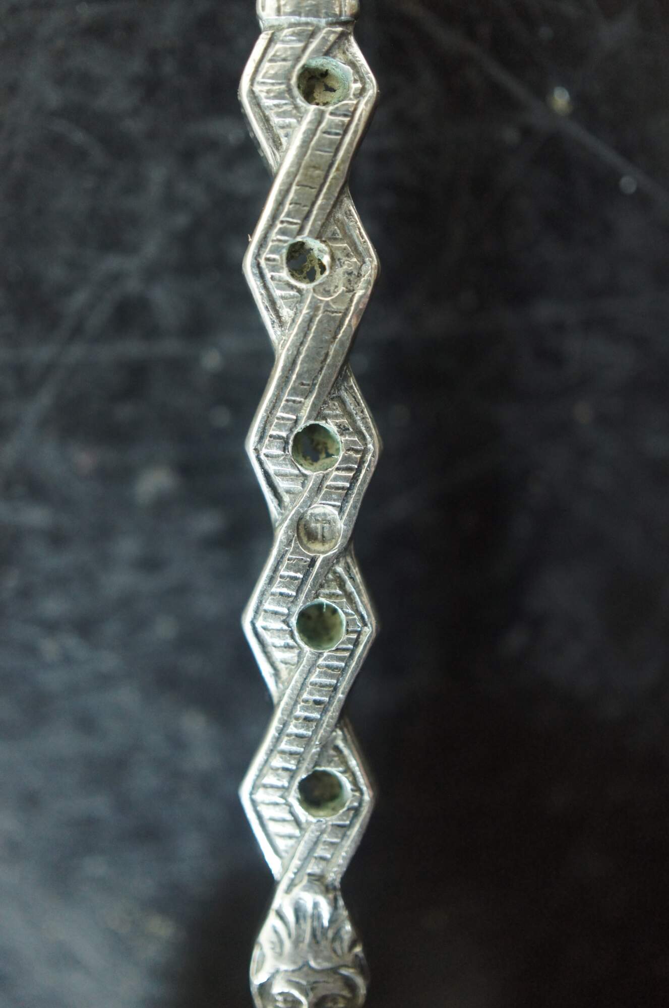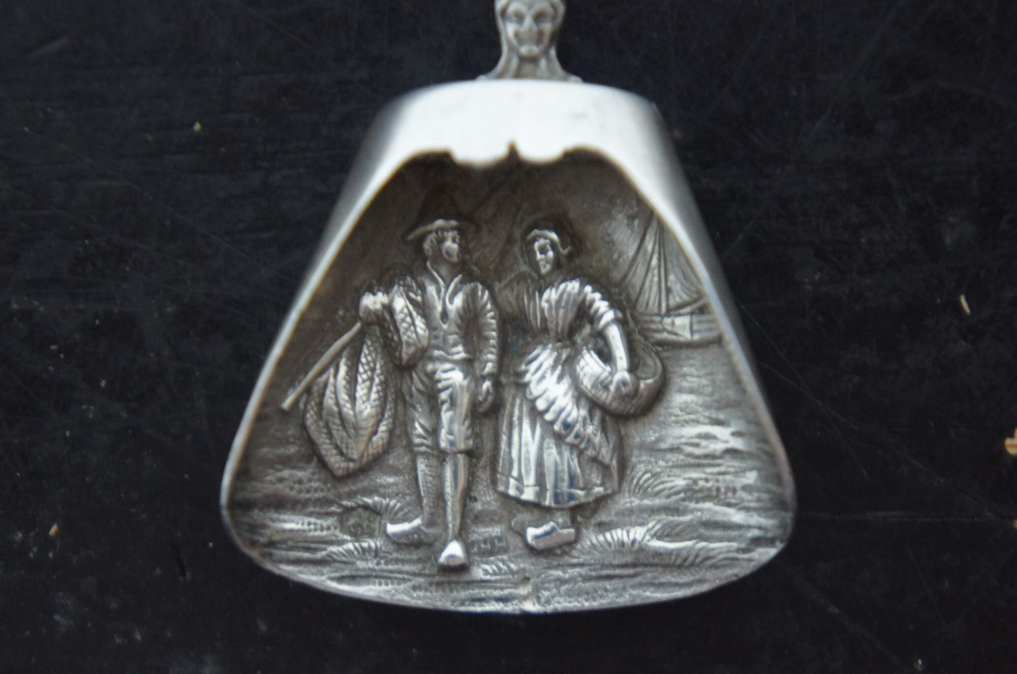 Antique 1850’s Dutch repousse 835 silver sugar shovel with a molded bowl showing a man and woman with a fishing net and basket, an interlocking zig zag handle and a topper in the shape of two noblemen talking. Bowl is stamped with the lion passant indicating second standard purity, topper stamped with the Minerva head duty mark, and handle stamped with date mark T (indicating manufacture in 1853).
