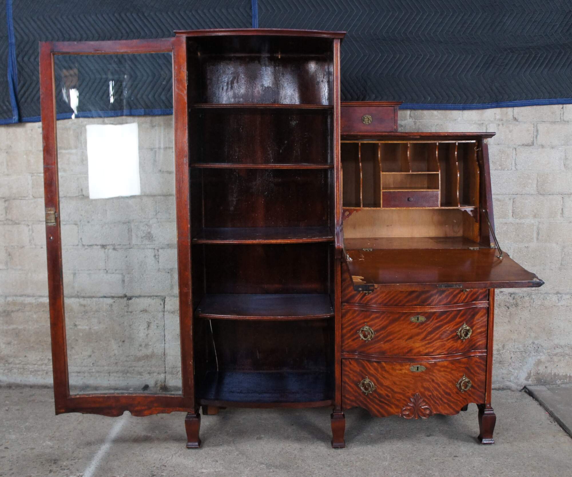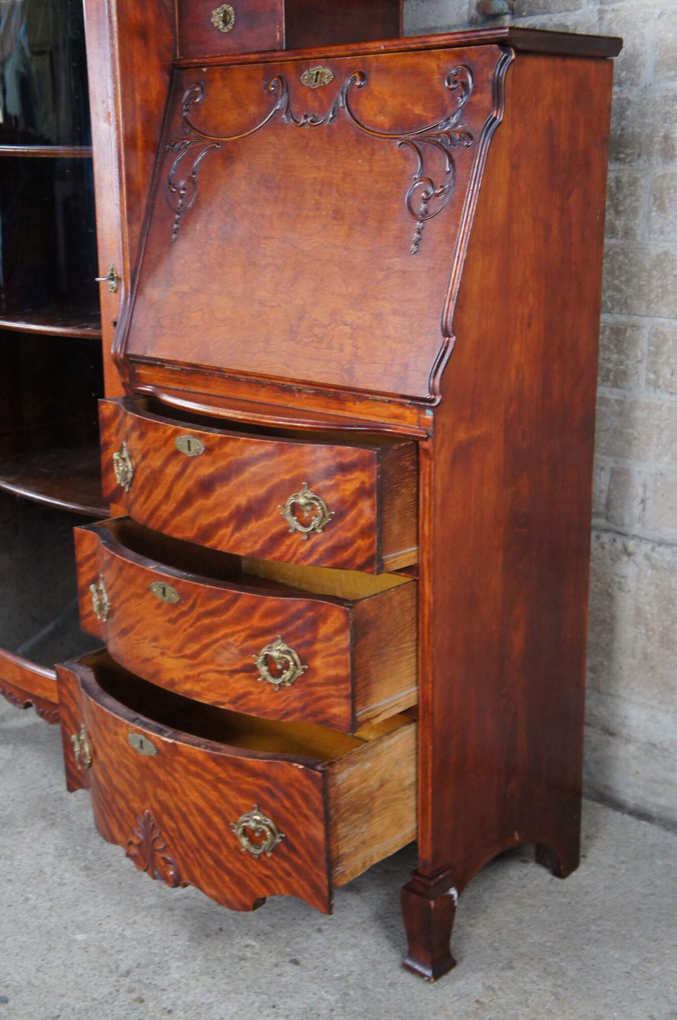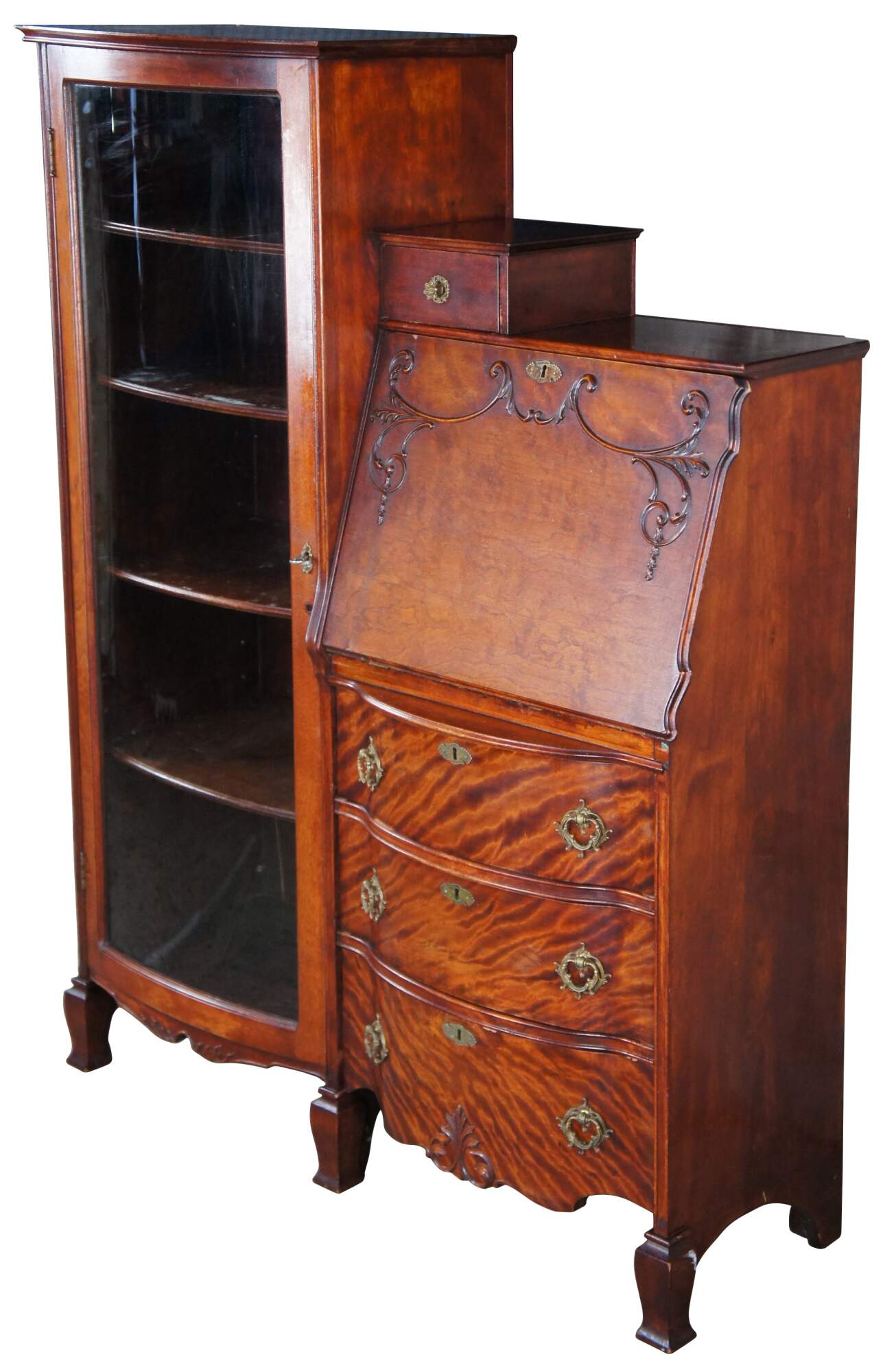 Antique Victorian side by side secretary desk and curio bookcase, circa 1900s. Made of quartersawn or "tiger" oak The body of the cabinet includes a curved glass bookcase and drop front secretary with ornate trim. Secretary opens to a writing surface with drawer and cubbies. Includes three lower drawers for storage with ornate brass hardware. The cabinet is supported by five legs with tapered front feet.