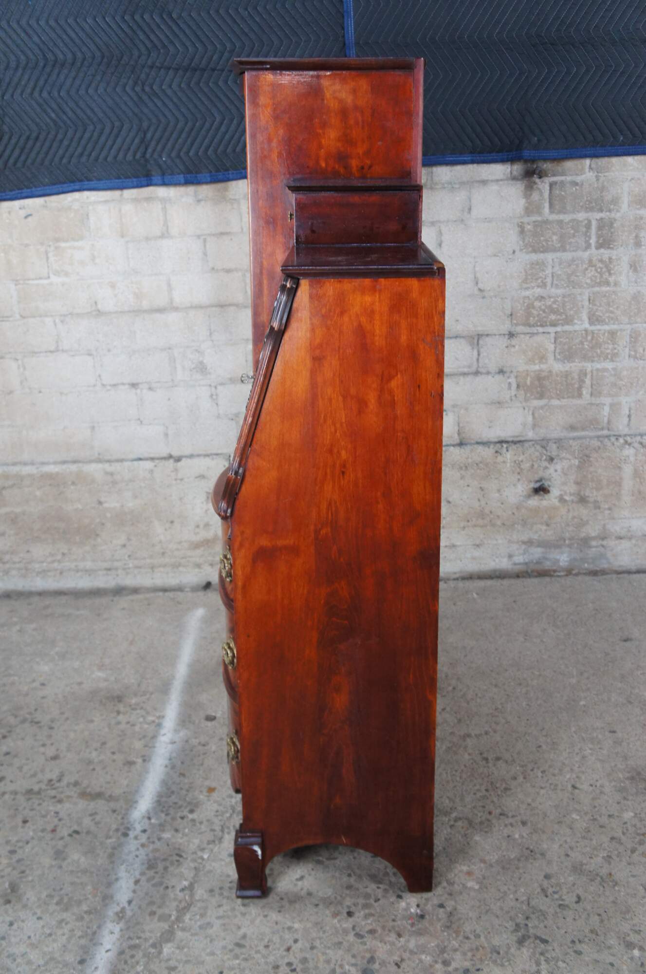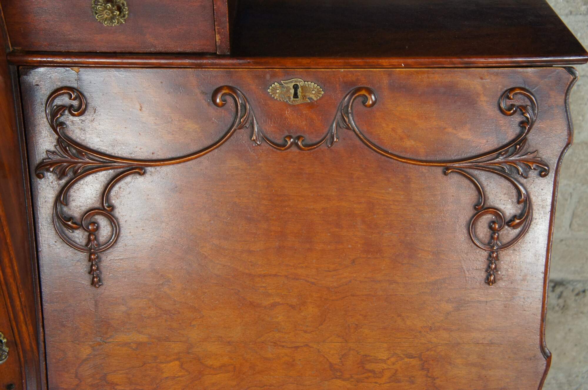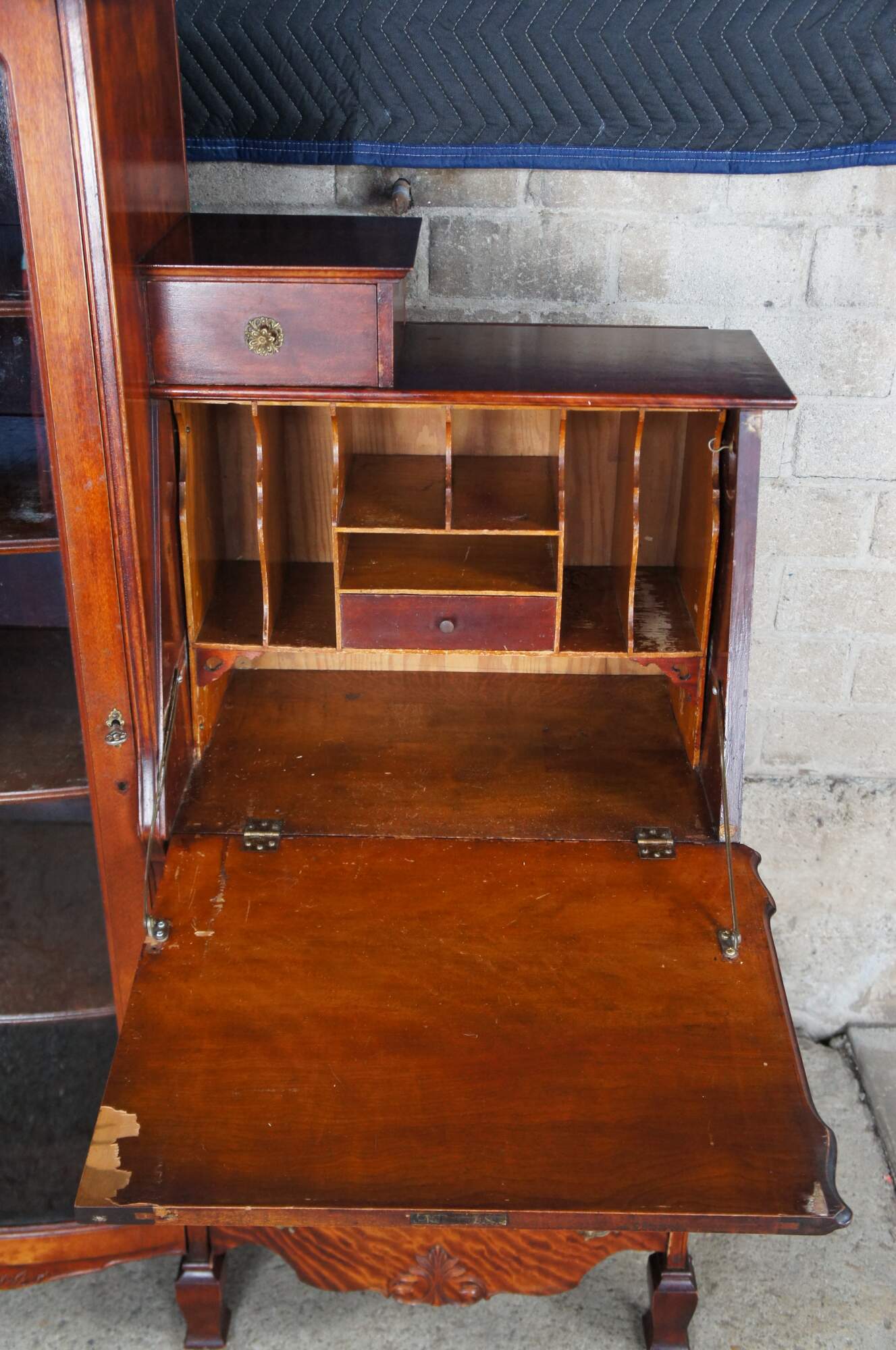 The cabinet is missing the original topper or crown. At some point the mirror above the desk portion and crown were removed1. The cabinet is structurally solid. There are some signs of use and age. Some missing veneer on inner desk surface