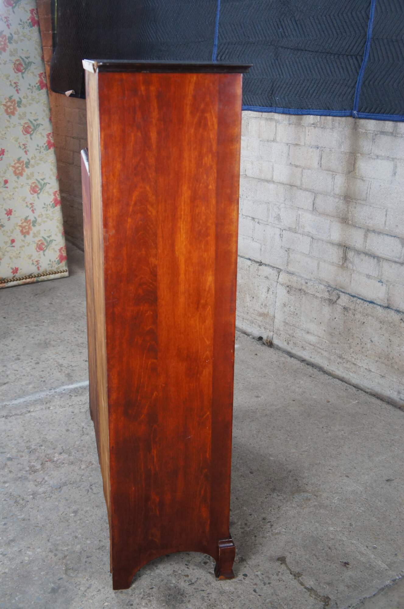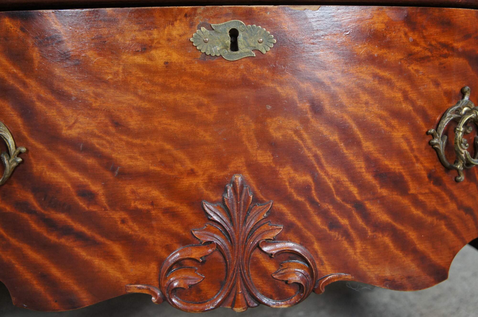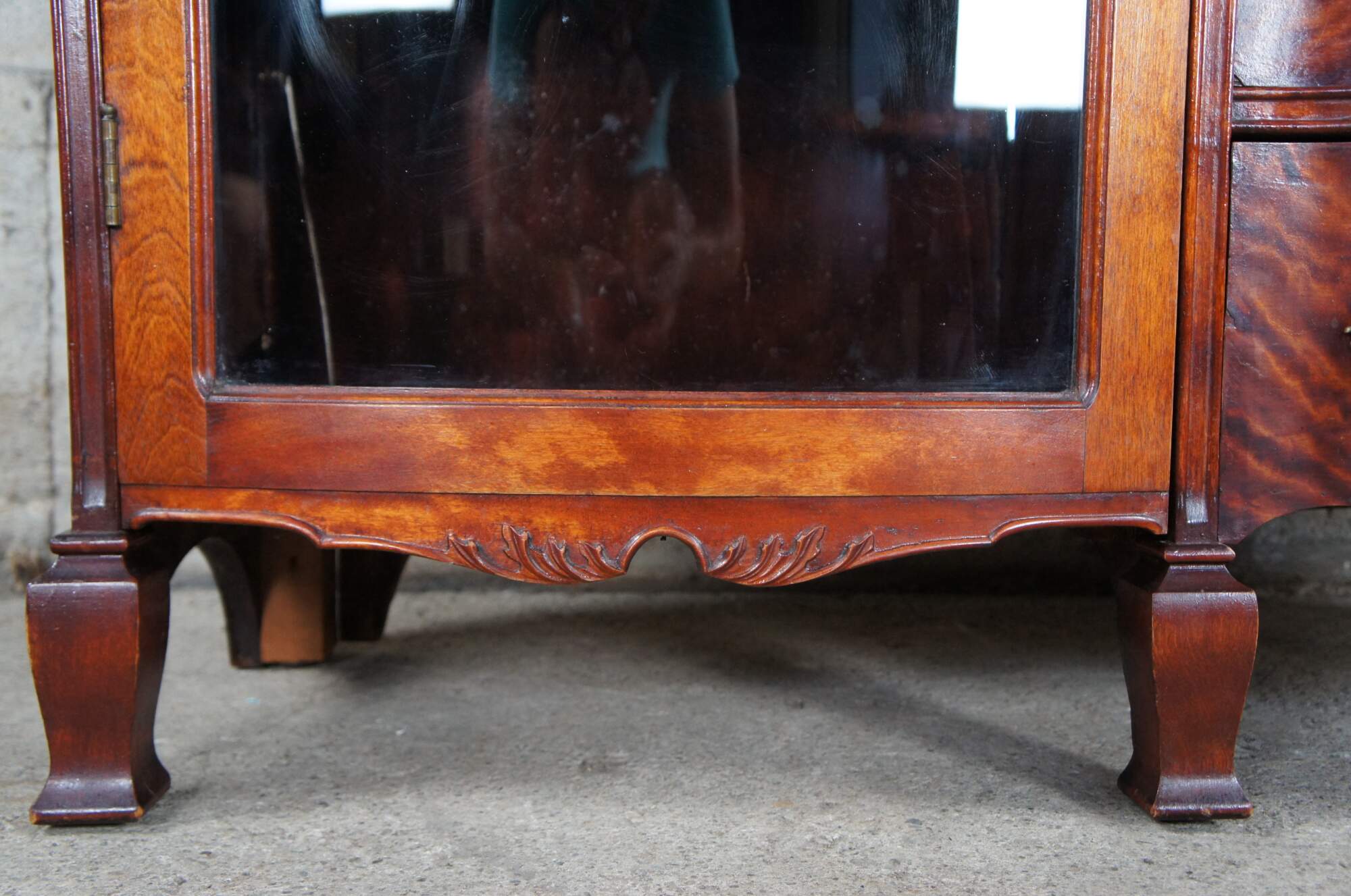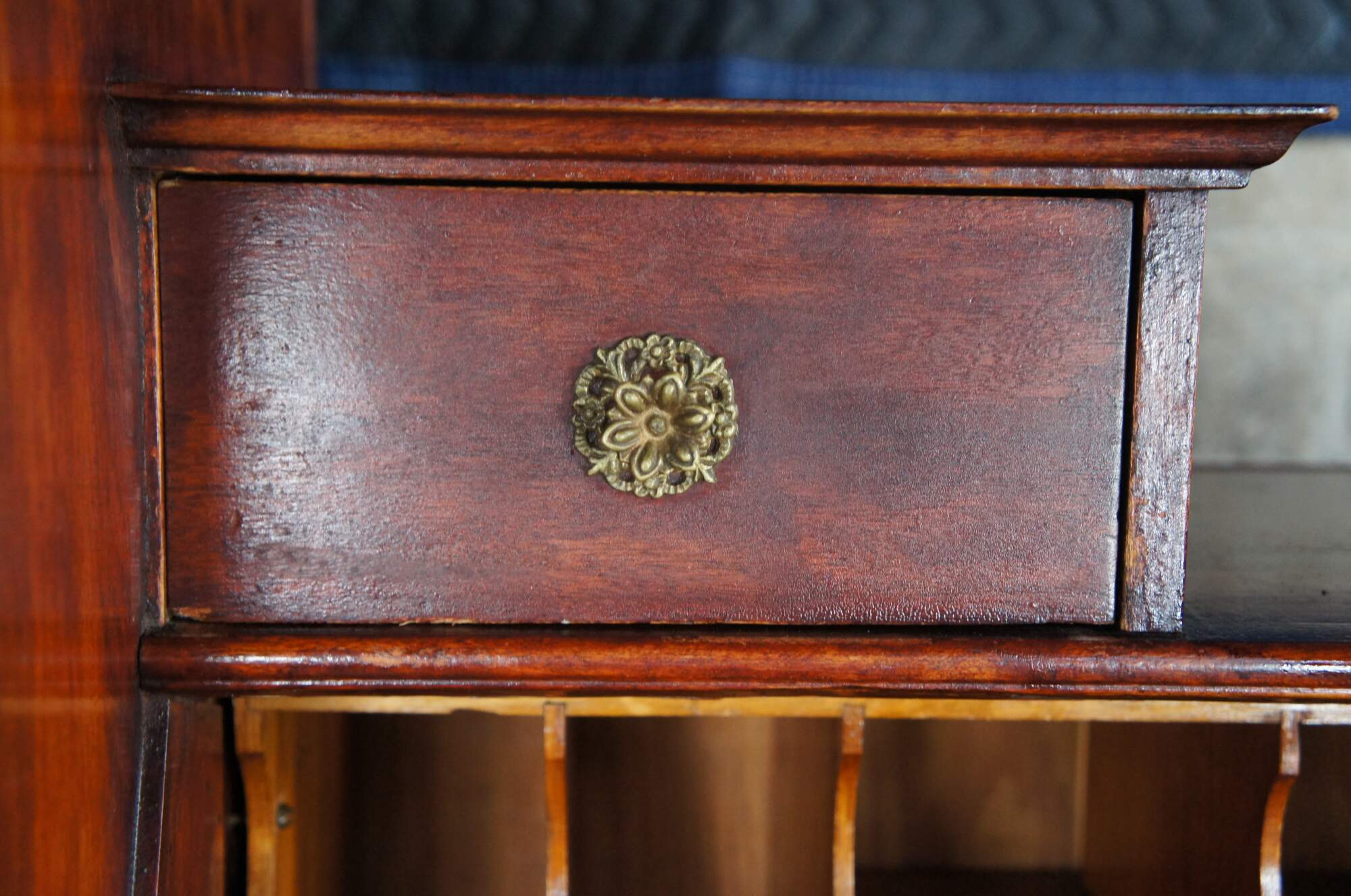 The cabinet is missing the original topper or crown. At some point the mirror above the desk portion and crown were removed1. The cabinet is structurally solid. There are some signs of use and age. Some missing veneer on inner desk surface