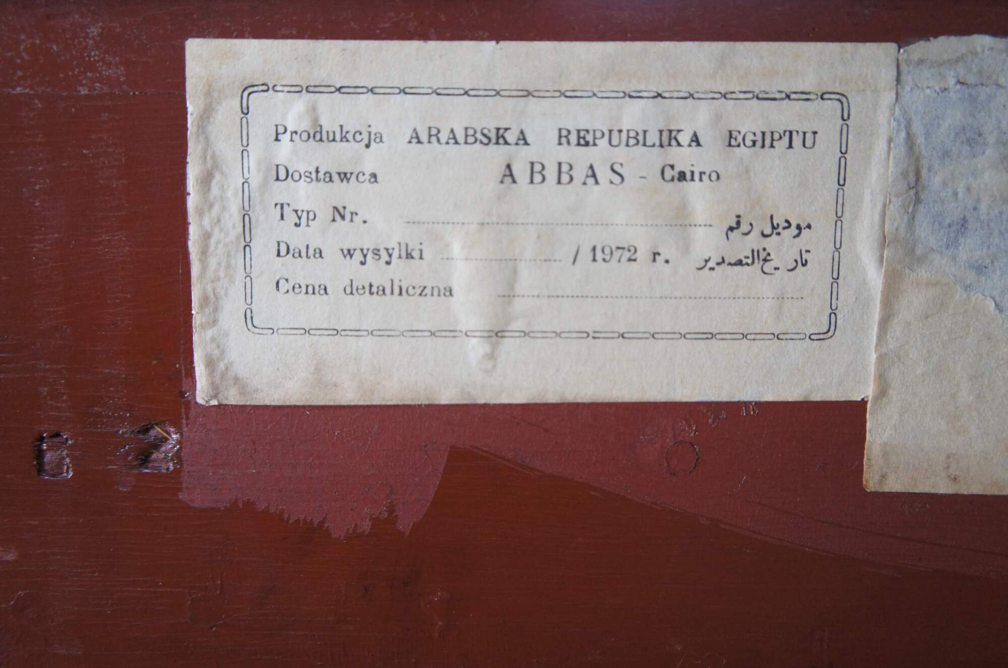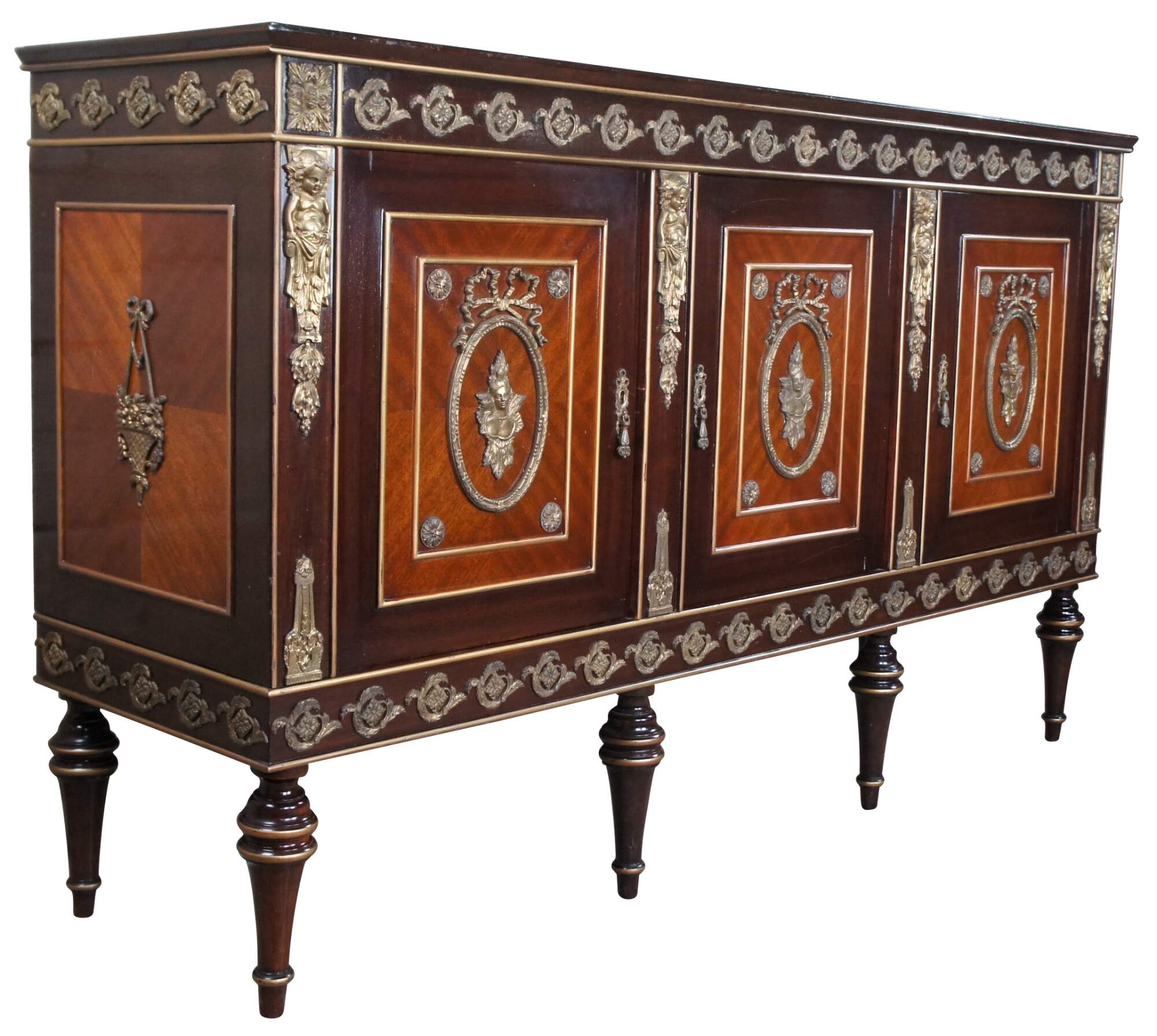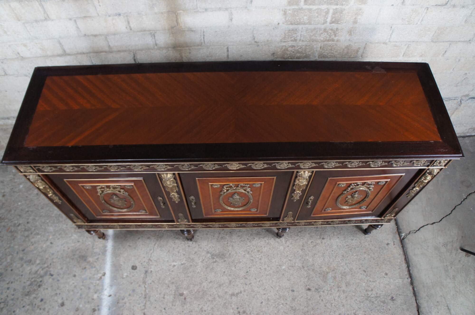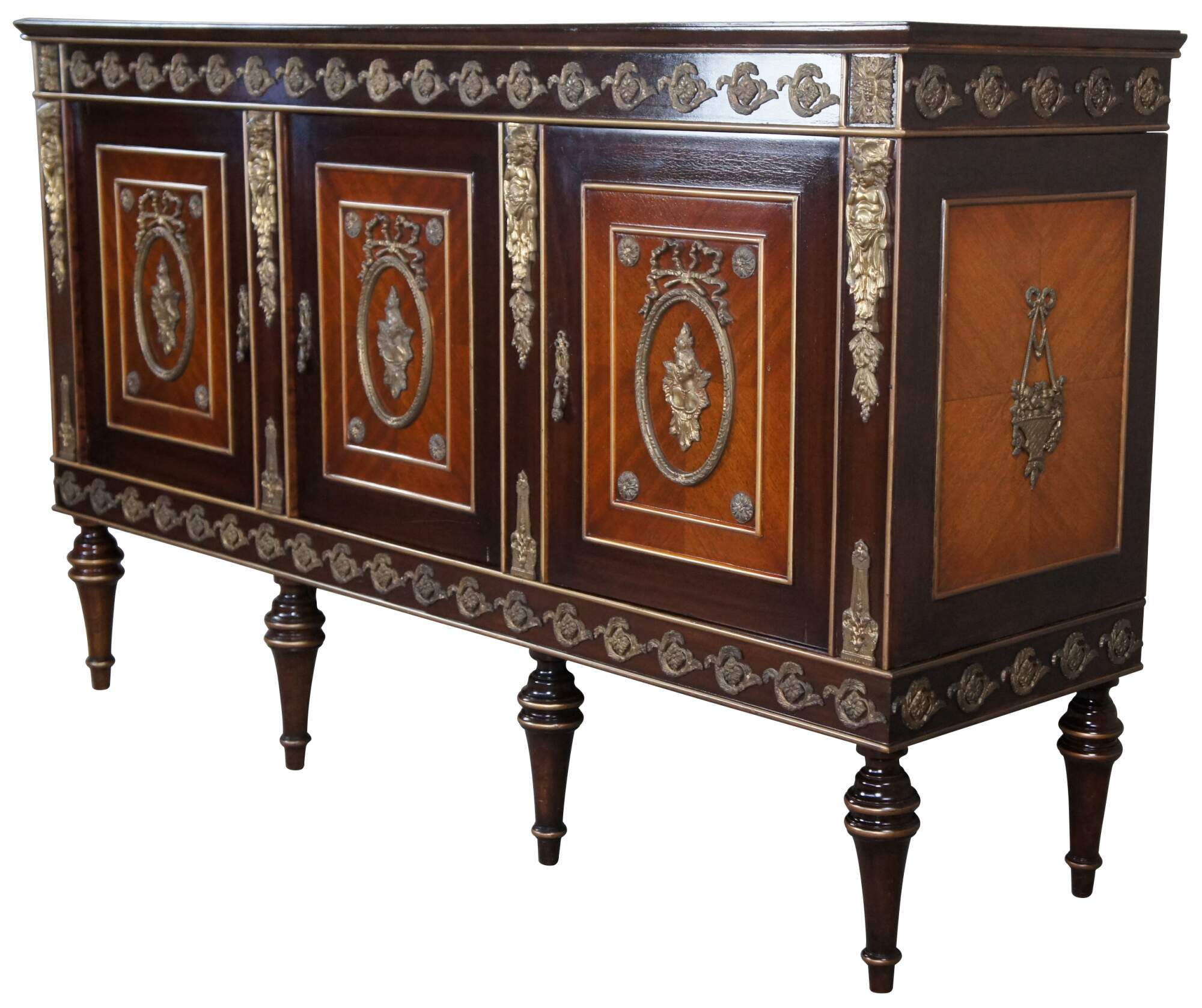 Vintage French Louis XVI inspired buffet, sideboard server or bar cabinet. Made in Cairo Egypt (Arabska Republika Egiptu) by Abbas, circa 1972. Made of mahogany with two tones and elegant matchbook veneer. Features ornate brass medallions, ormolu figural mounts, neoclassical cameos and gold banding. The cabinet is supported by six turned and tapered arrow feet.