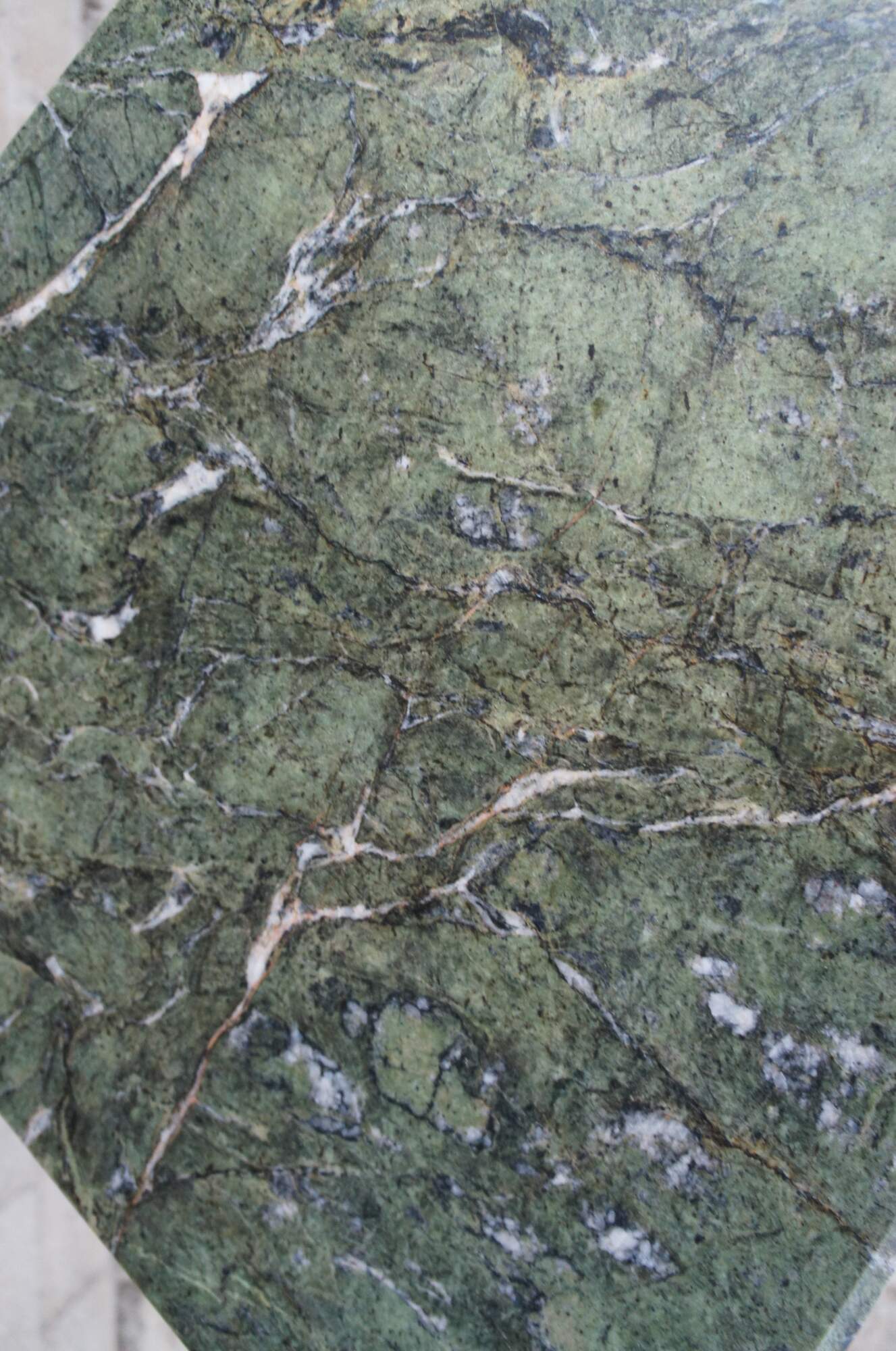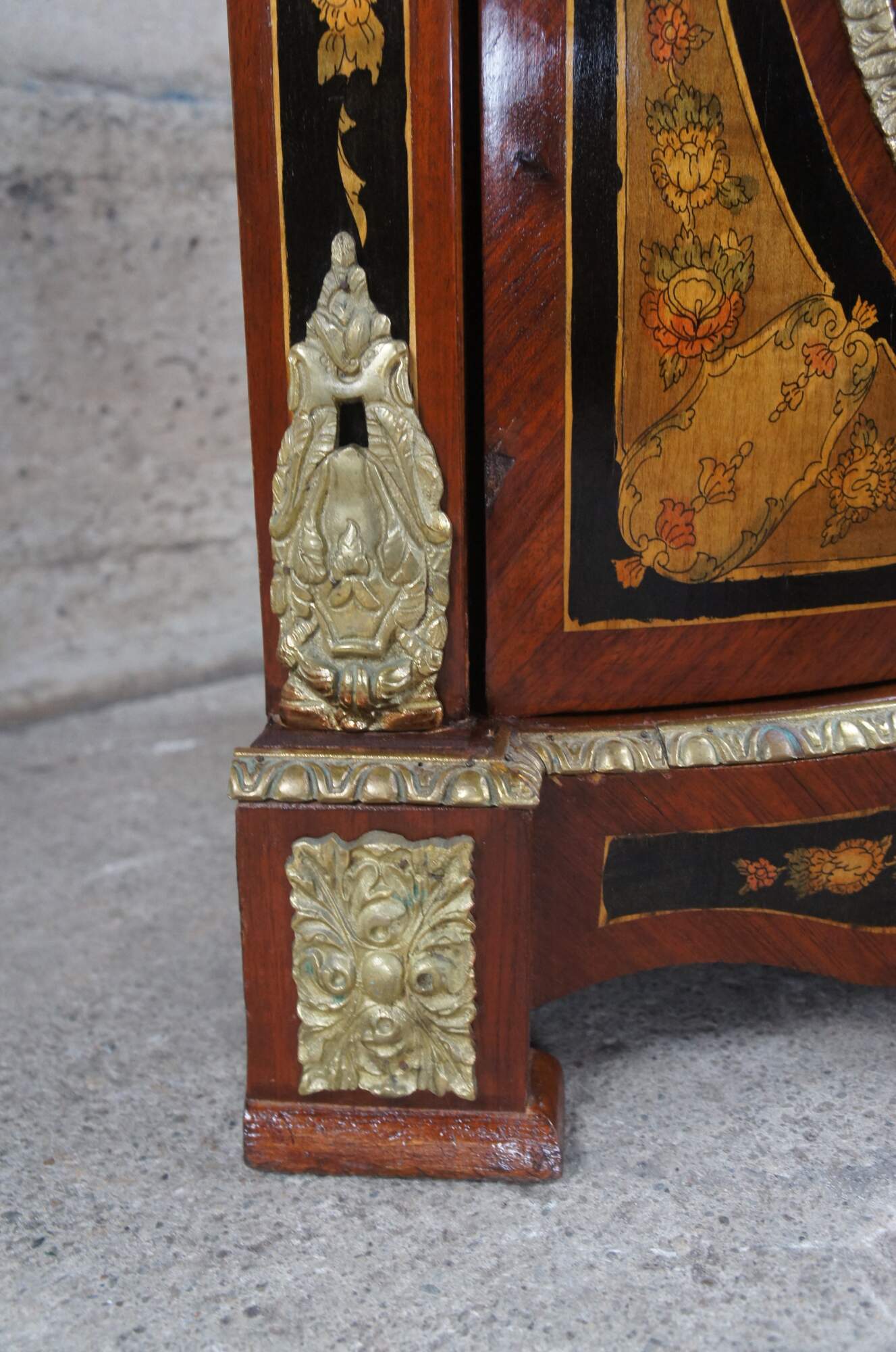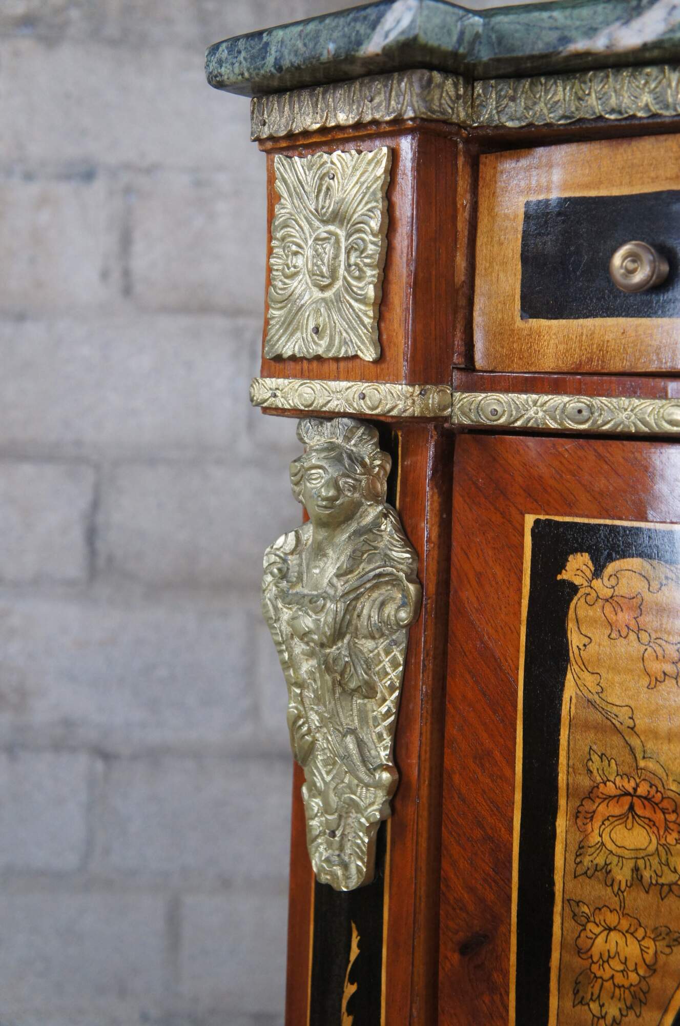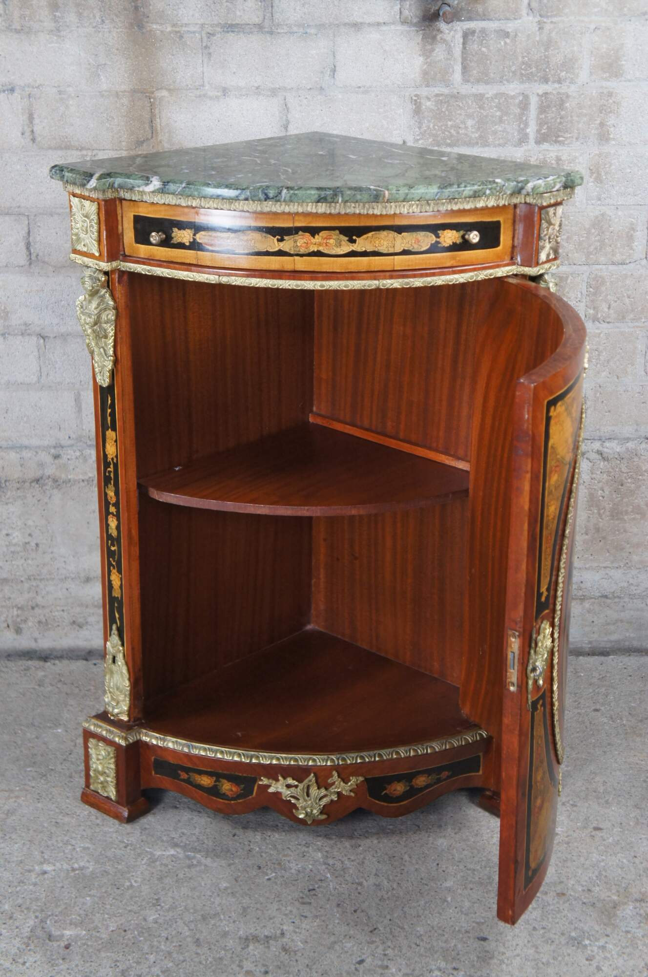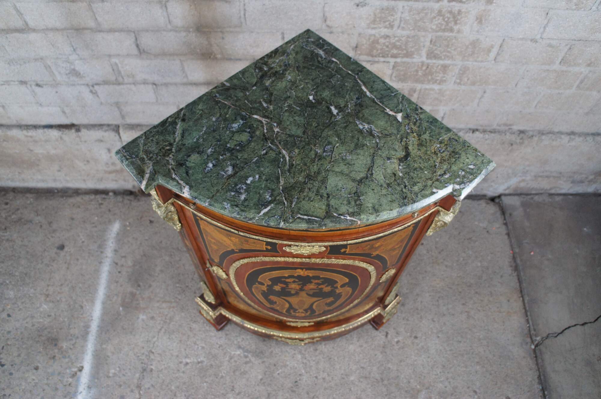 An exquisite French Boulle style corner cupboard in the manner of Napoleon III and Louis XVI, circa second half 20th century. Made from walnut with a green marble top over drawer and lower cabinet. Features painted floral motifs, brass medallions and figural ormolu mounts.