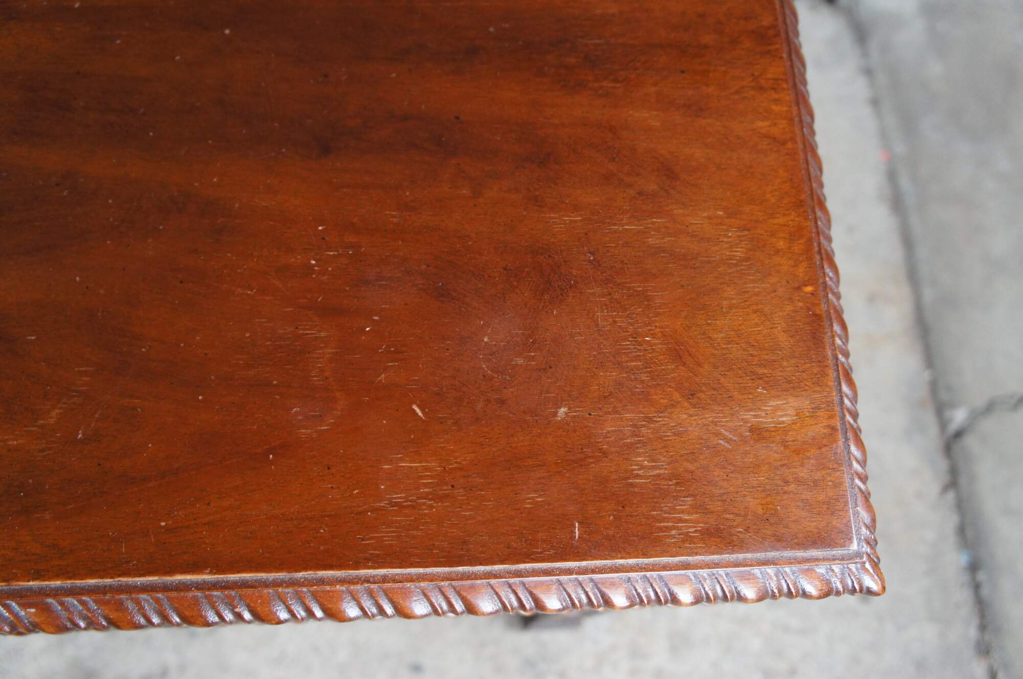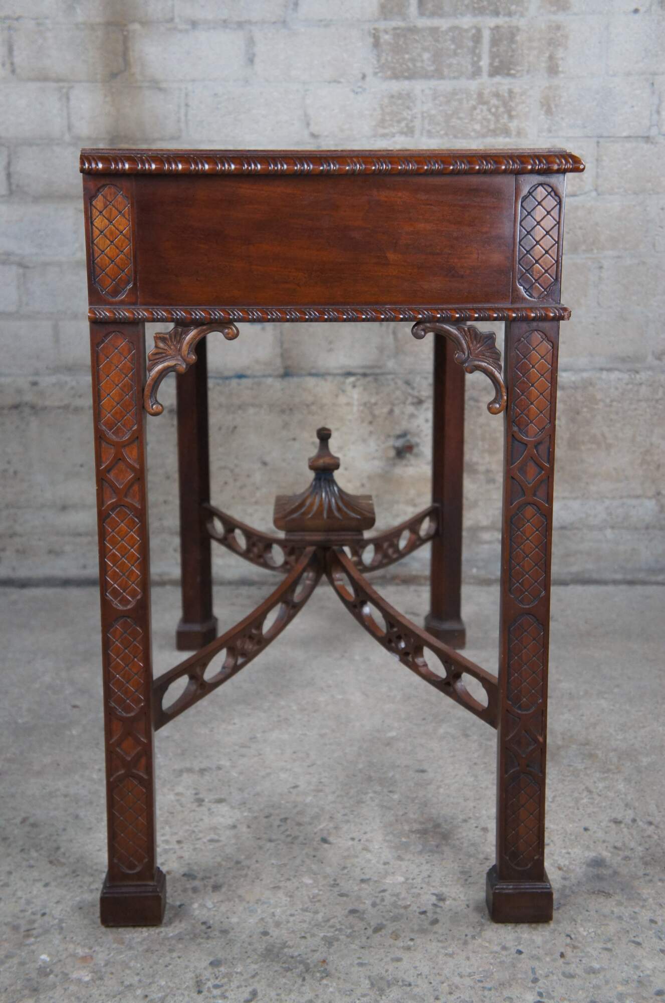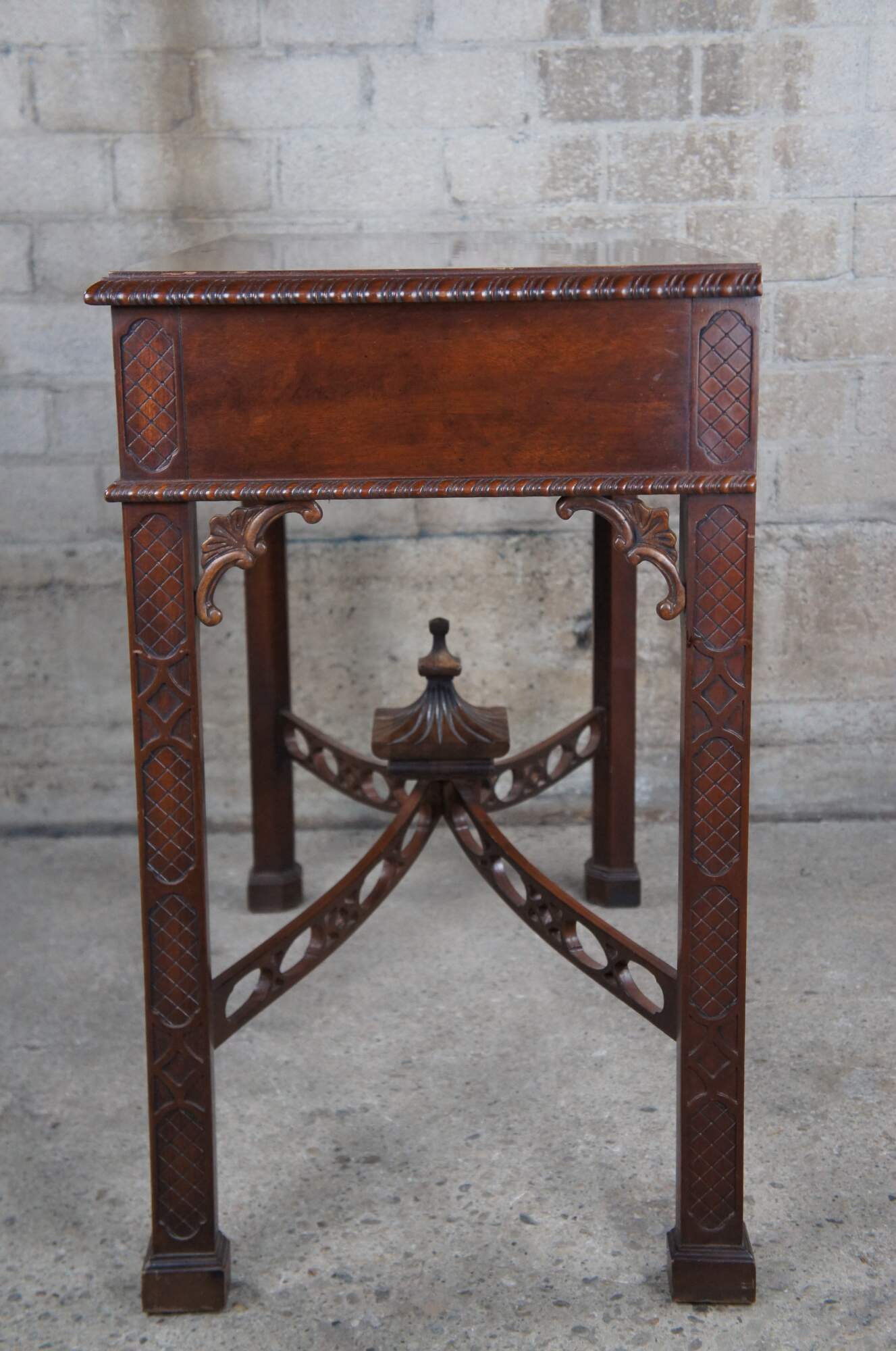Mid 20th Century Chinese Chippendale Console table or server. A rectangular form made mahogany with two dovetailed drawers and pagoda form hardware. Features gadrooned aprons, ornate spandrals and lattice carved stiles and legs. The table is supported by marlborough legs leading to block feet. The legs are connected by ornate pierced and arched fretwork stretchers that are centered by a pagoda form finial. An outstanding design that will add grandeur to any space. Marked along the back 20041-535-715 Console