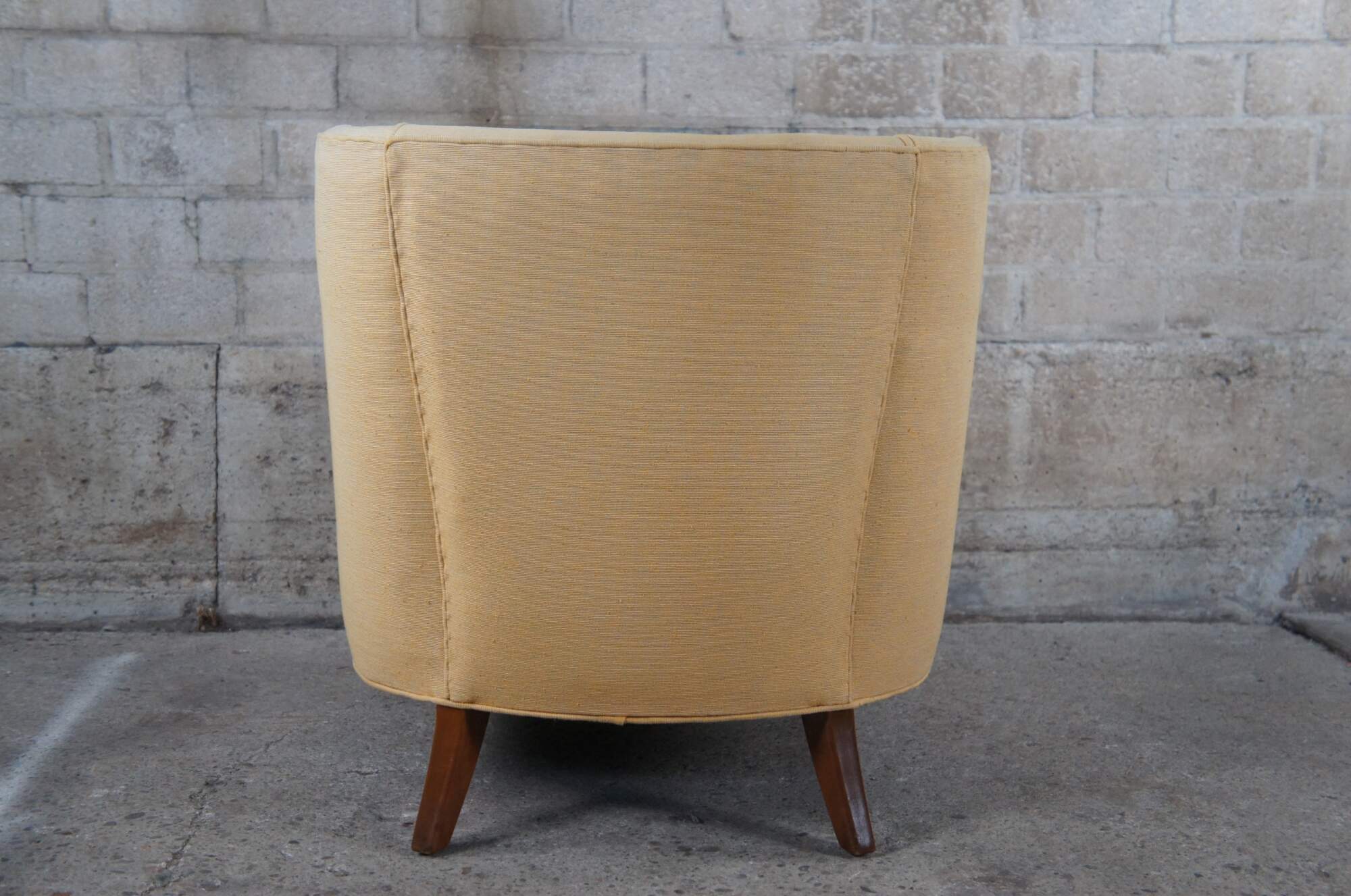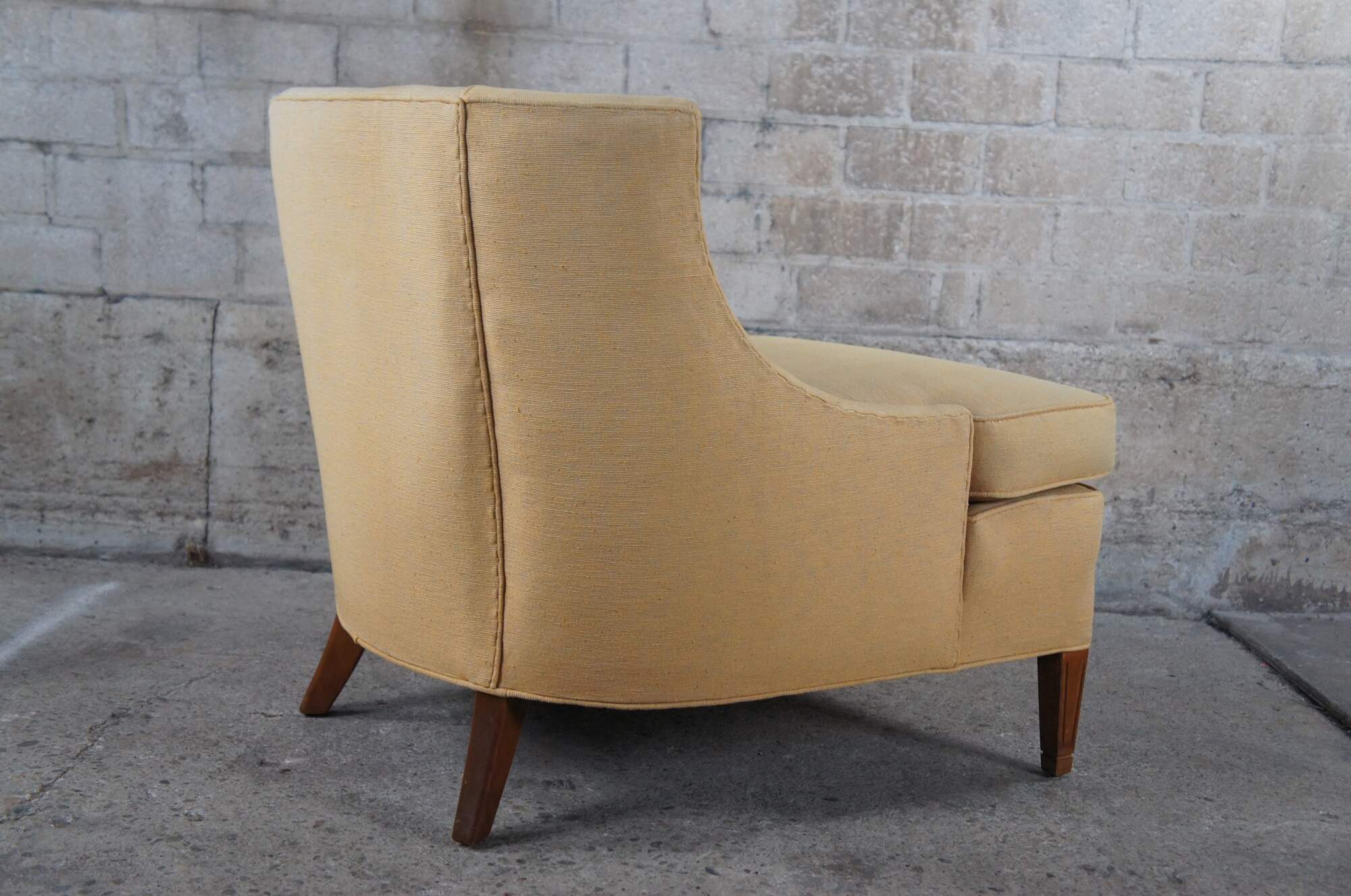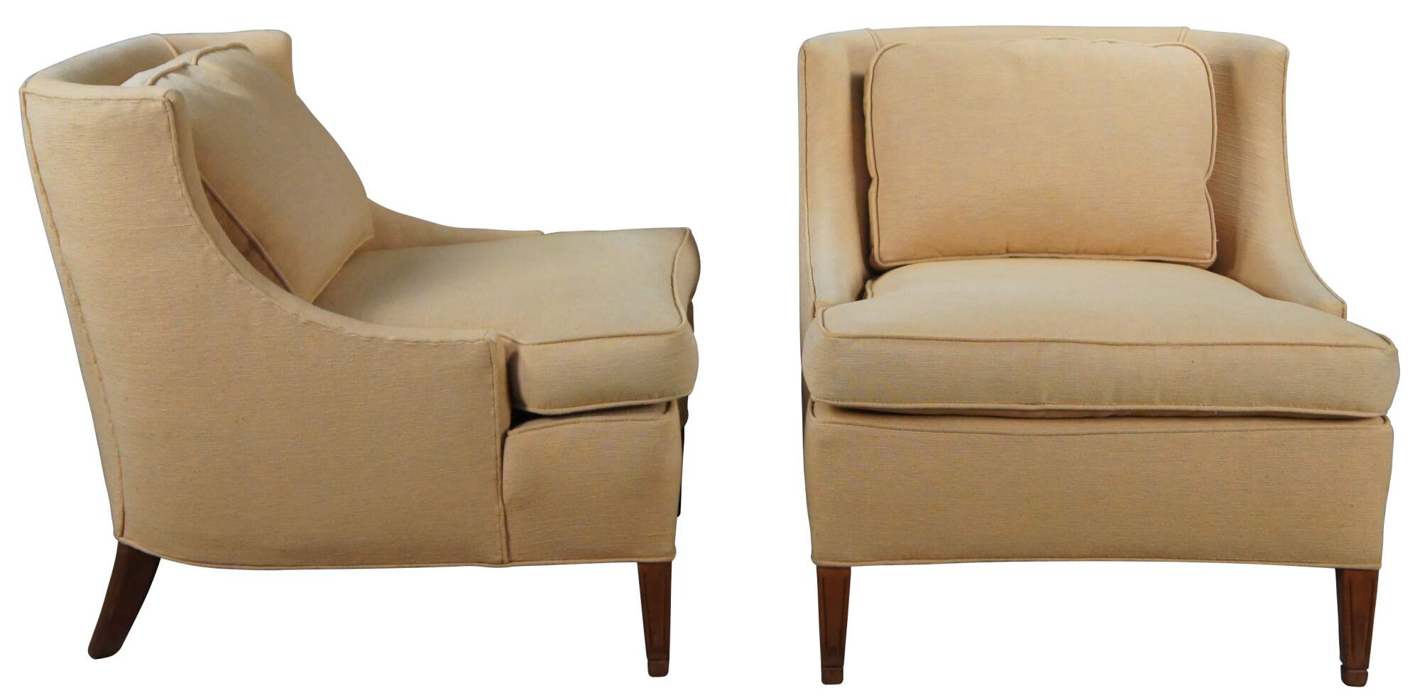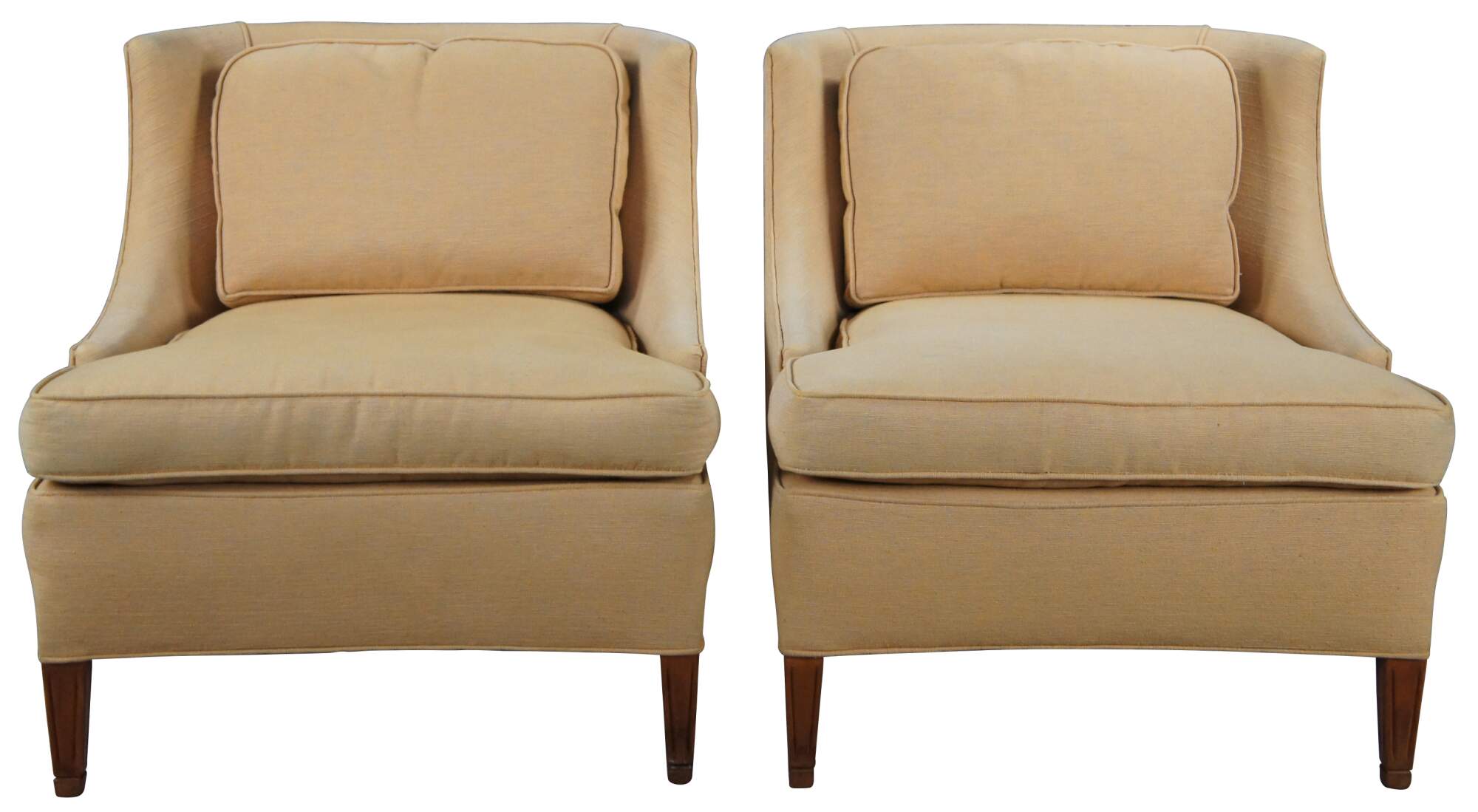 Pair of Mid Century Slipper Wingback Chairs by Baker Furniture. A sleek design with light yellow cotton upholstery and walnut finished square tapered legs.