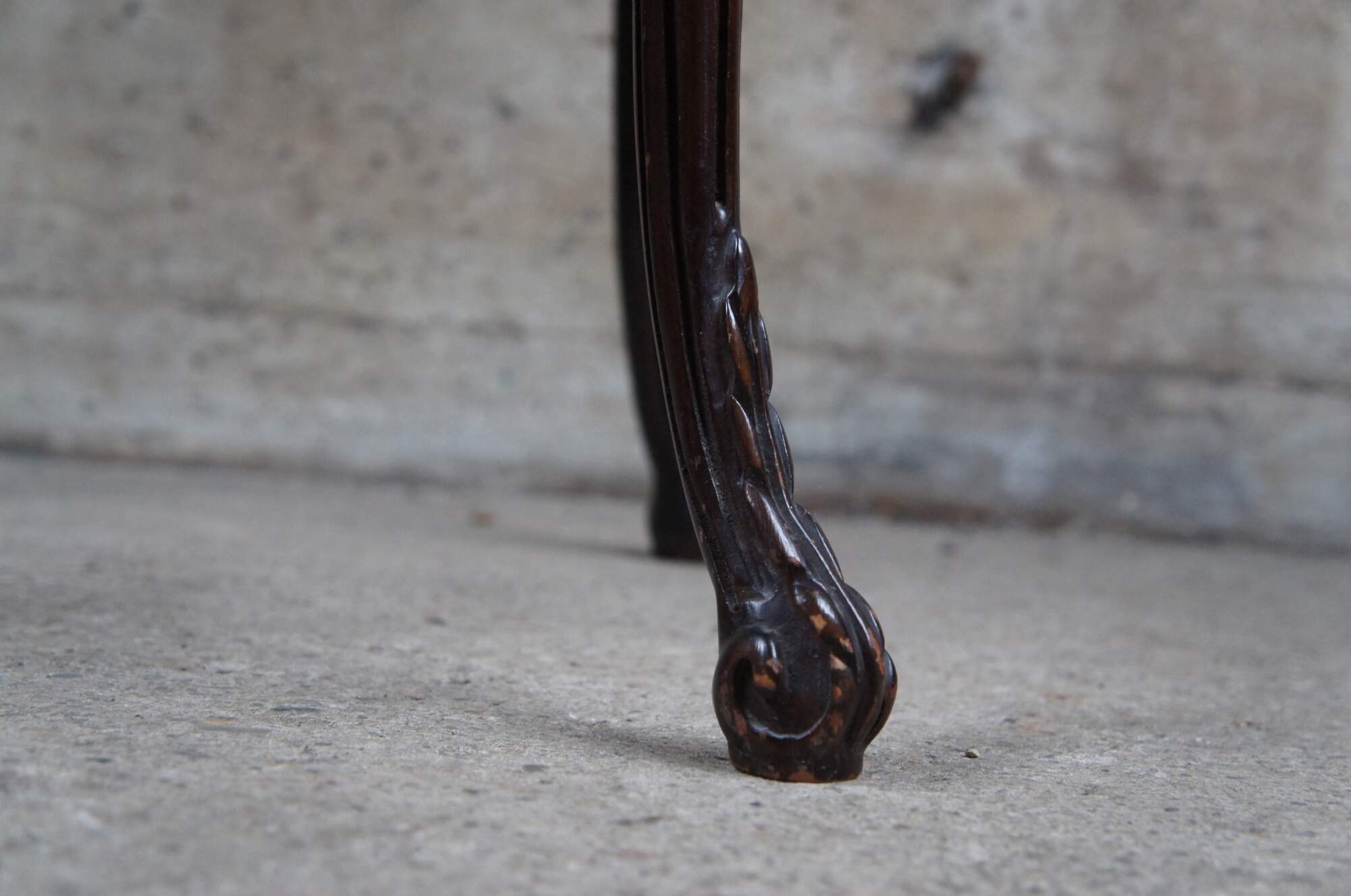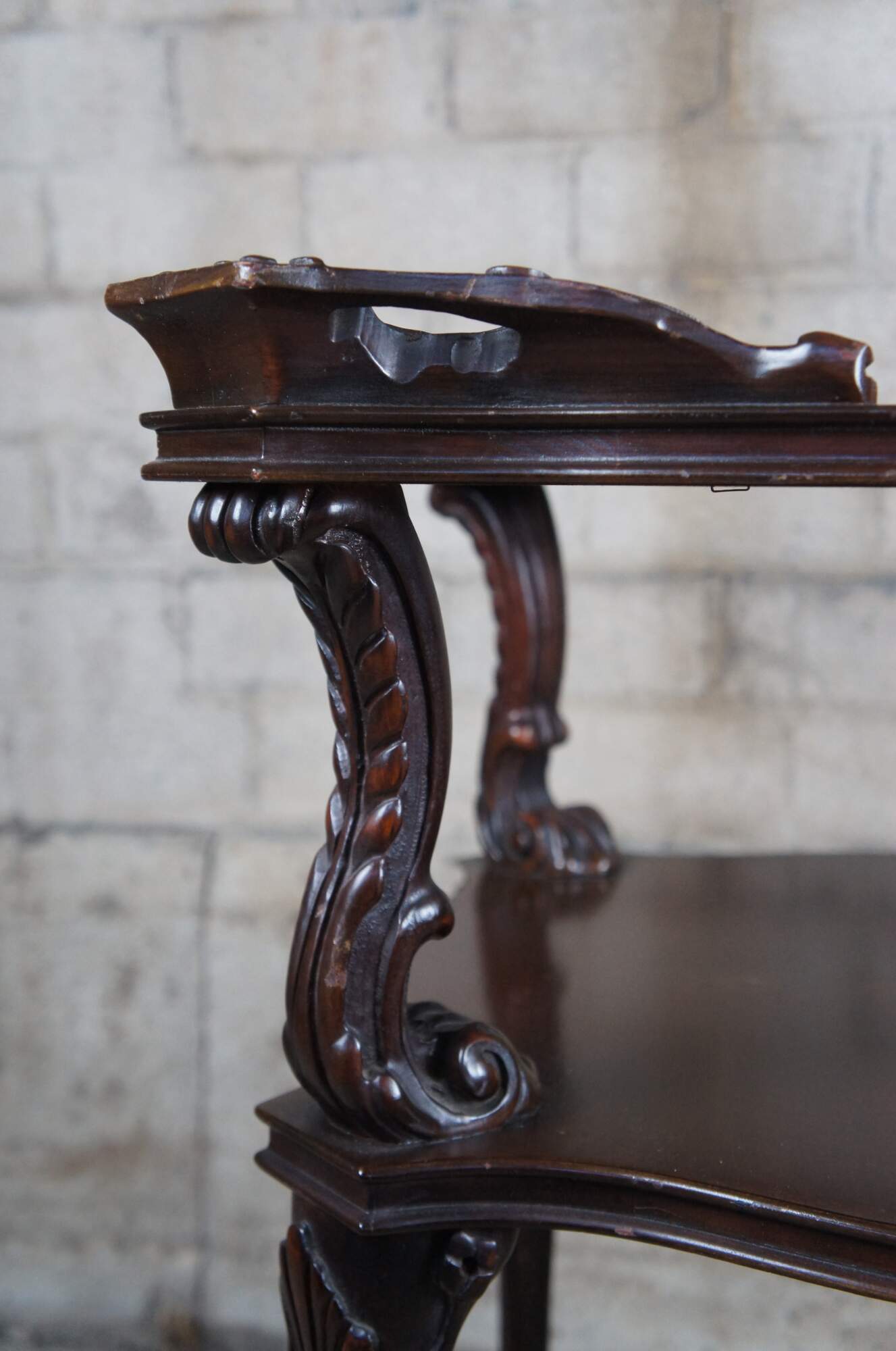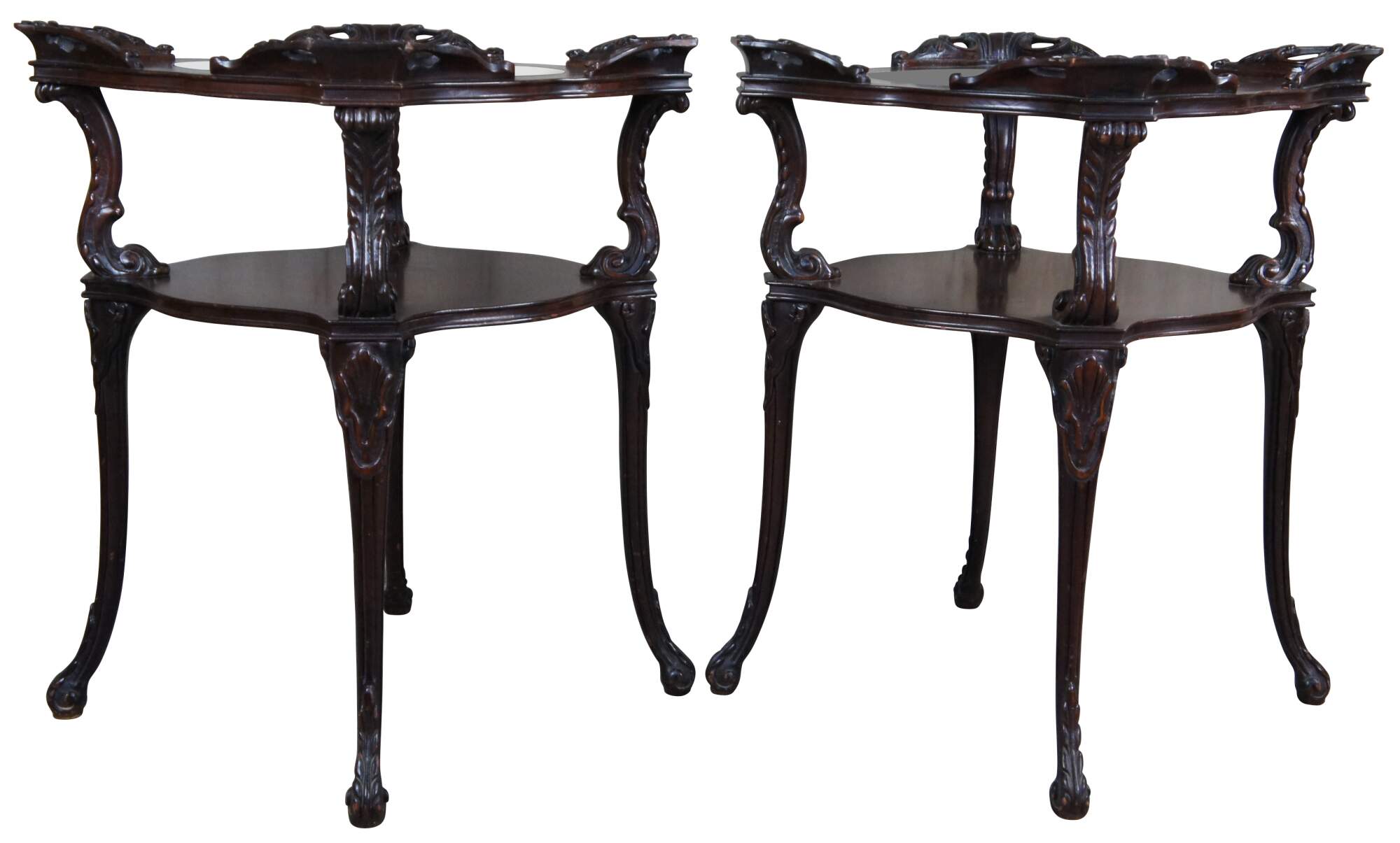 Adams Always Fine Furniture Louis XV style tiered end tables, circa 1930-40s. Beautifully designed with acanthus and scalloped details. Features an inset round glass top resting on a raised wooden top supported by ""s"" scrolls with raised and carved details along each corner. The circular glass inserts have a round frosted detail along the underside. Supported by long cabriole legs terminating into ""c"" scrolled feet. Made in America