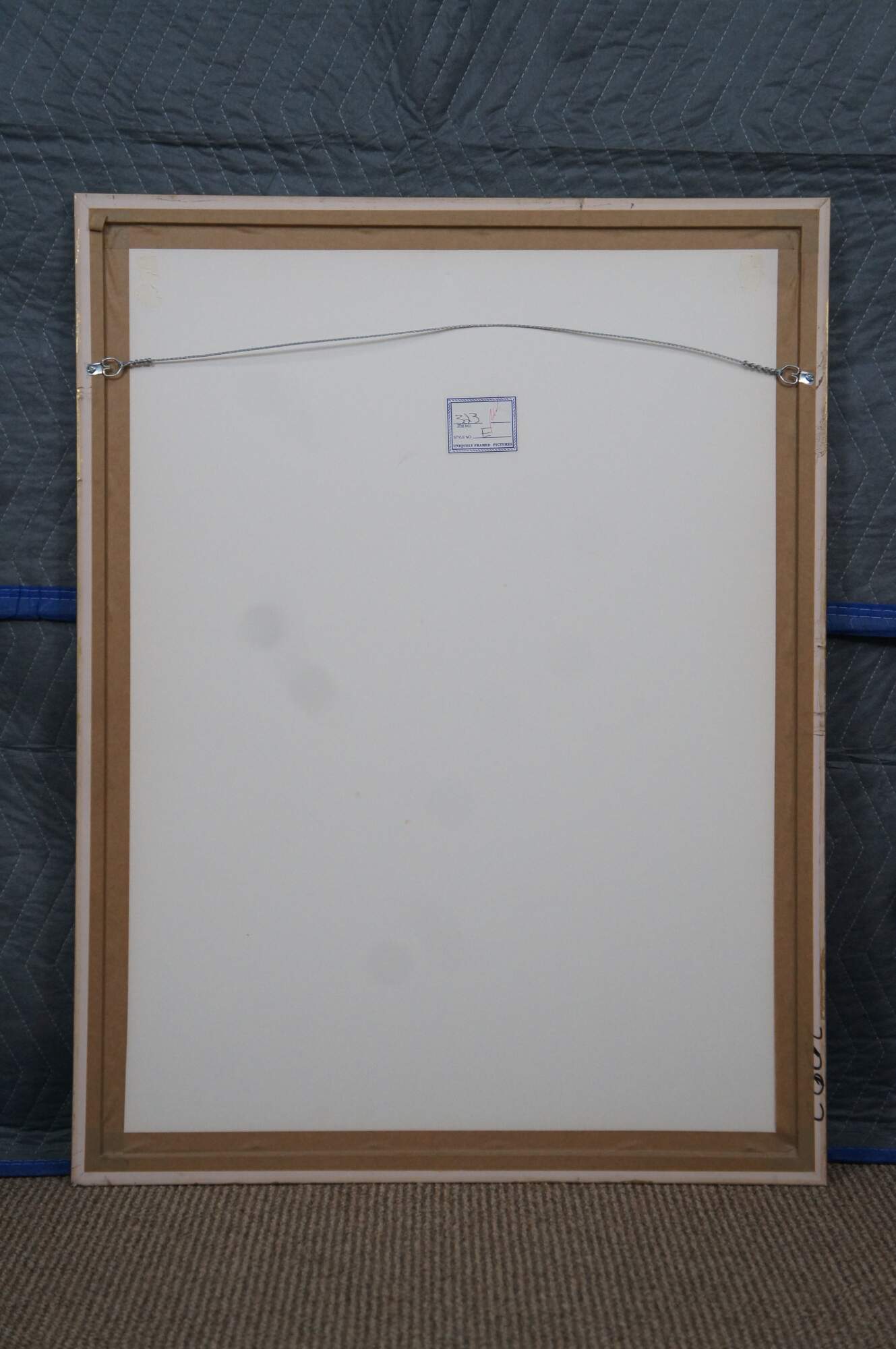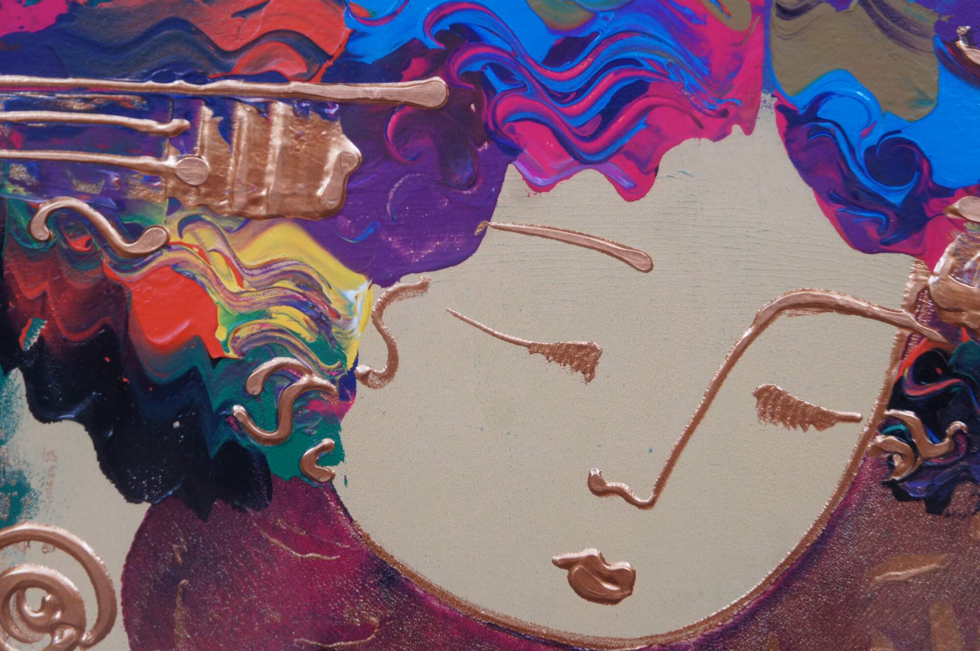 Framed mixed media artwork by Lee White showing an expressionist portrait of a female face floating in an abstract musical background of color and flowers. Signed in lower left.