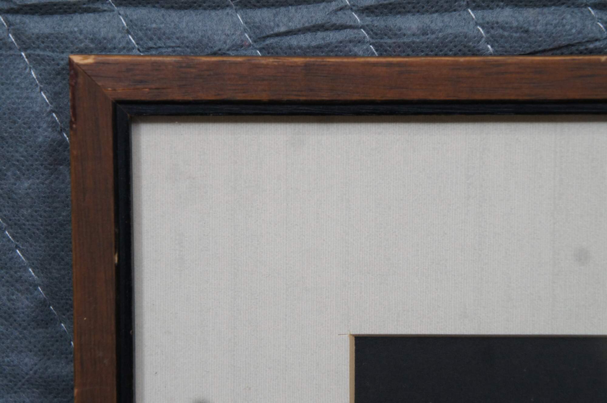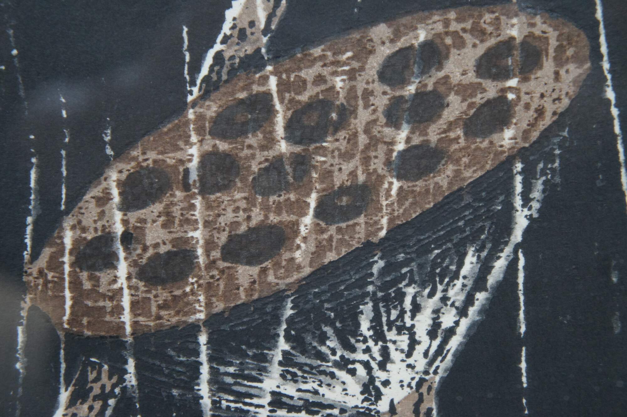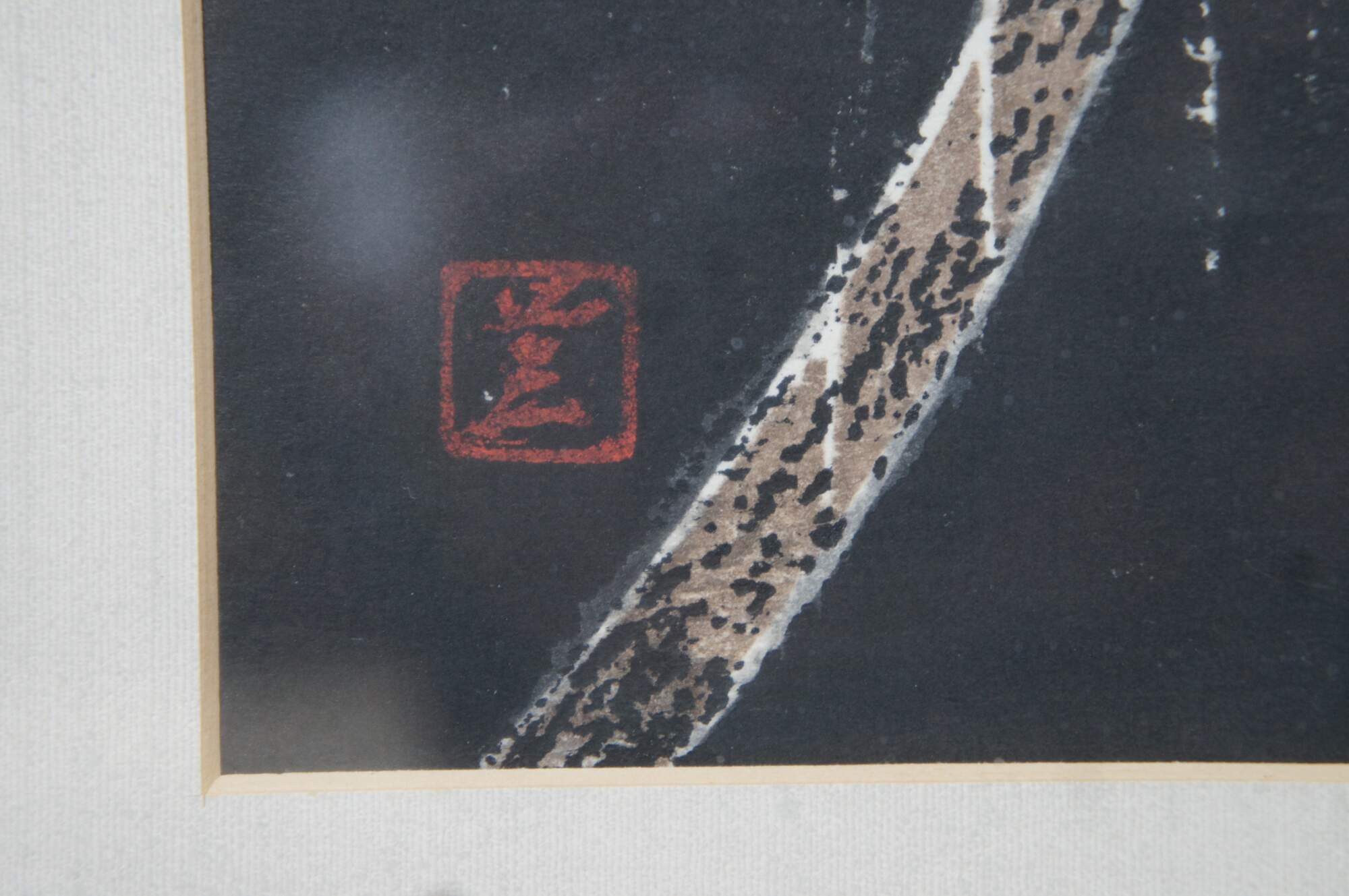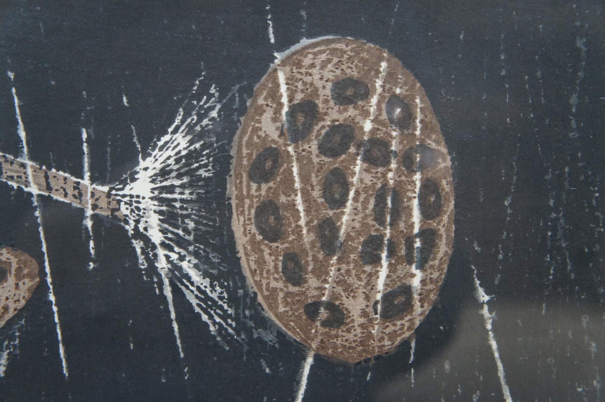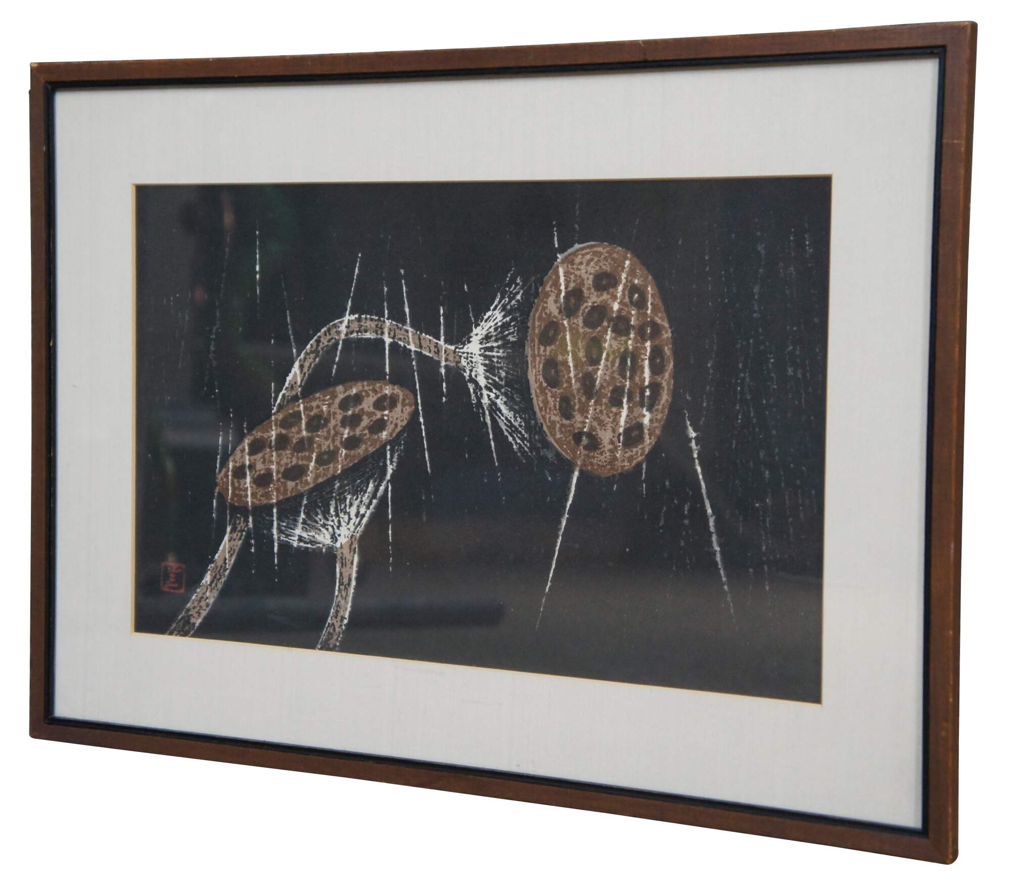 1950s-1960’s Japanese woodblock print titled “Quiet Rain” showing a pair of lotus pods under streaks of rain, by Kaoru Kawano.