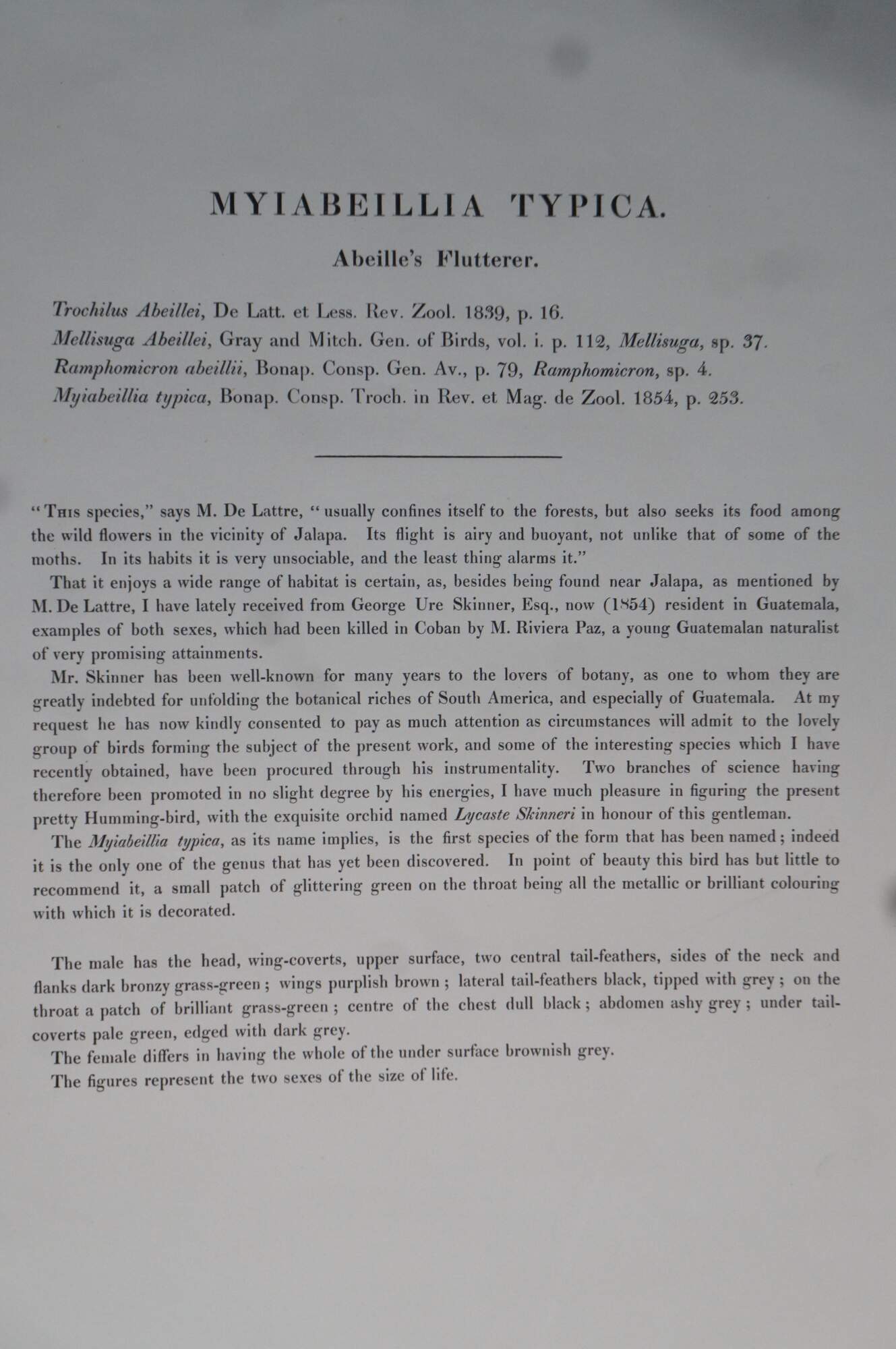 The work for which he is best known is his Monograph of the Trochilidae or the ""Family of Hummingbirds"", which was produced between 1849-1861. Each hand-colored lithograph, many of which are highlighted with shimmering iridescence, presents the tiny jewel-like birds visiting lush flowers and foliage.”