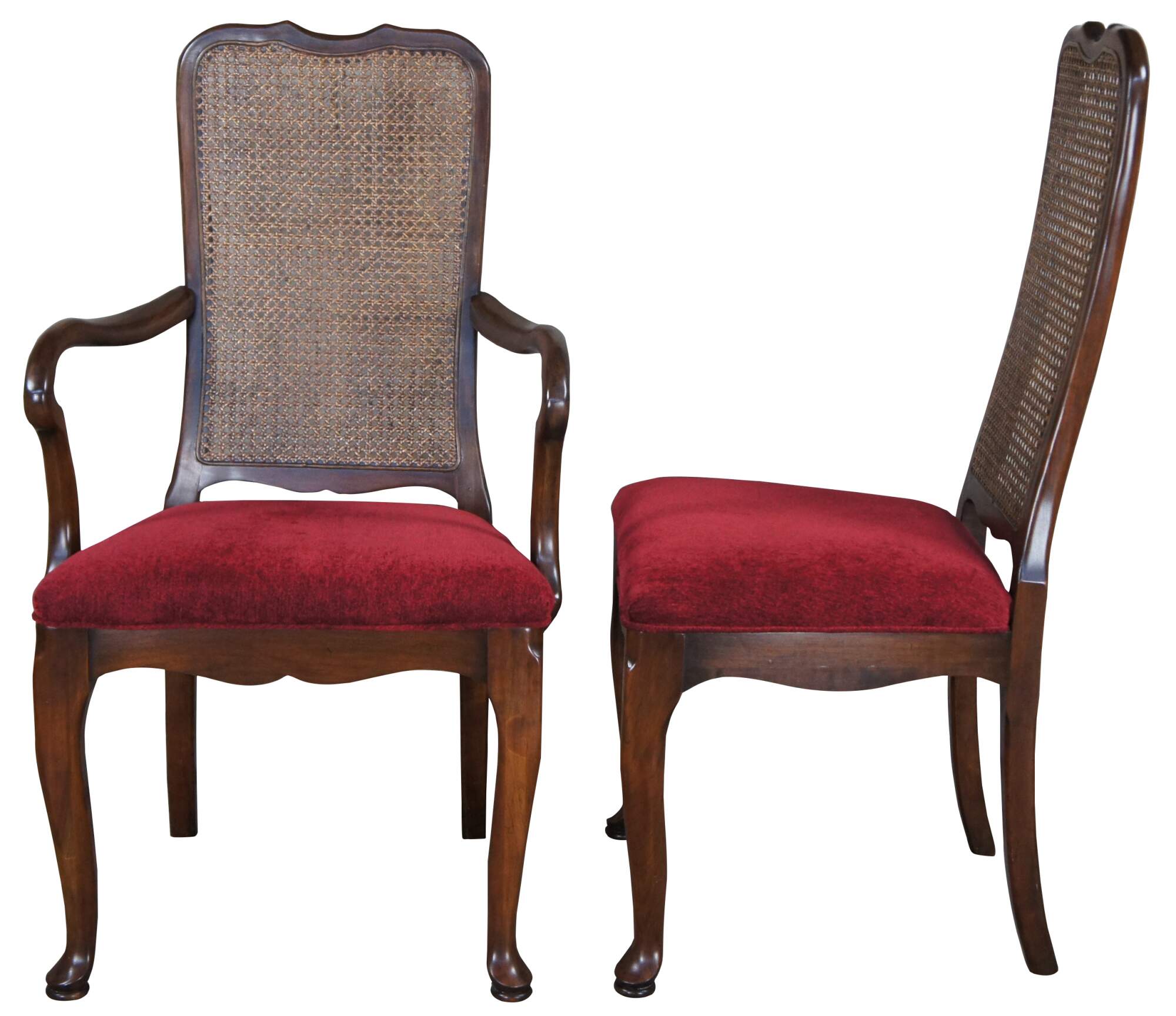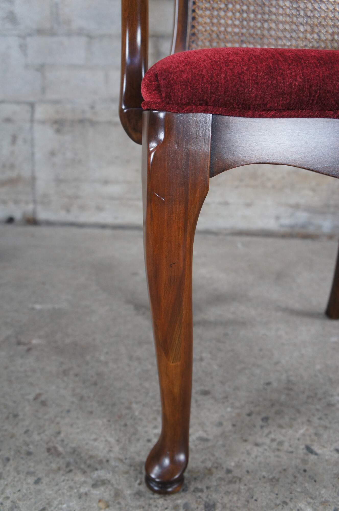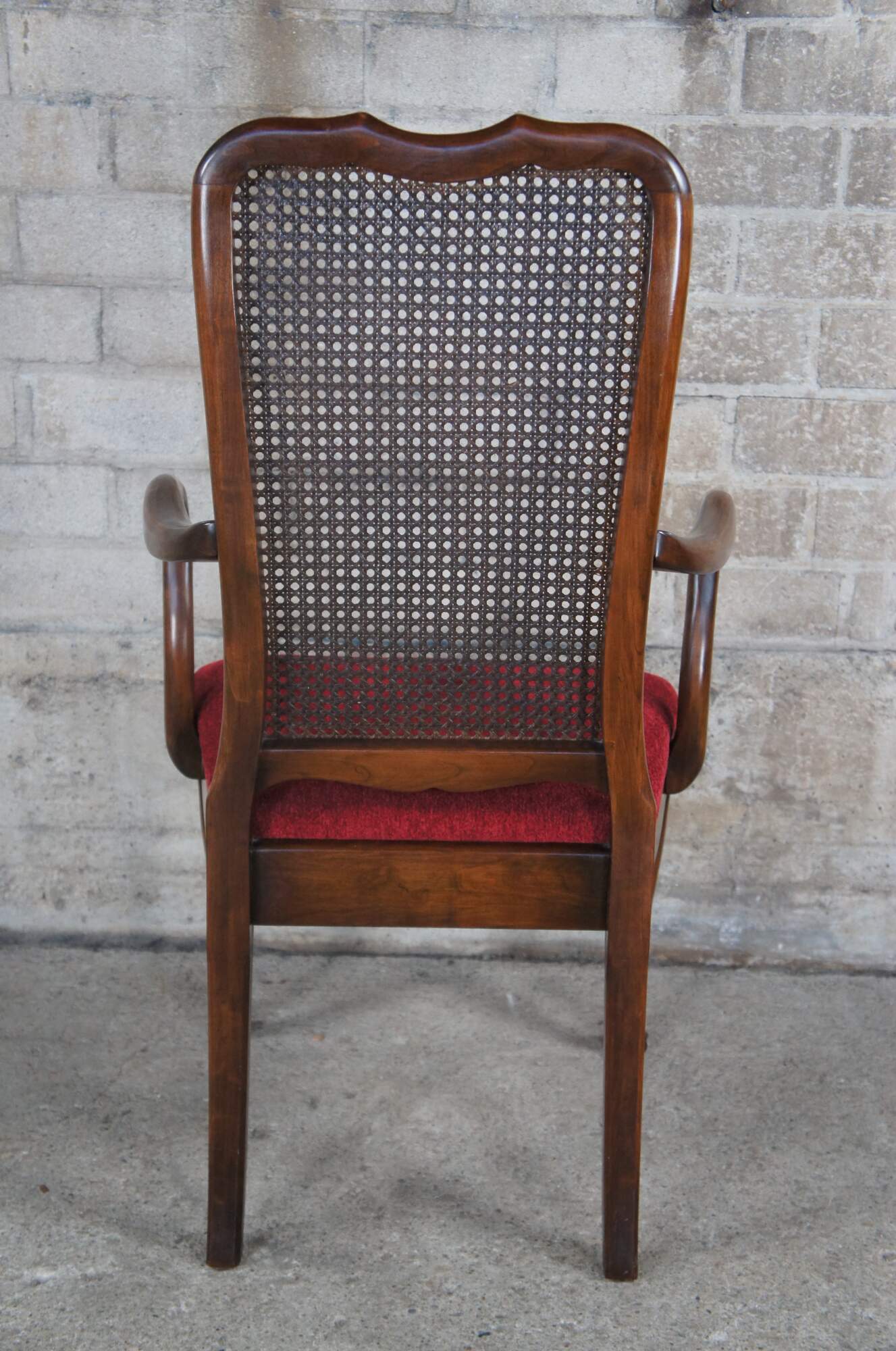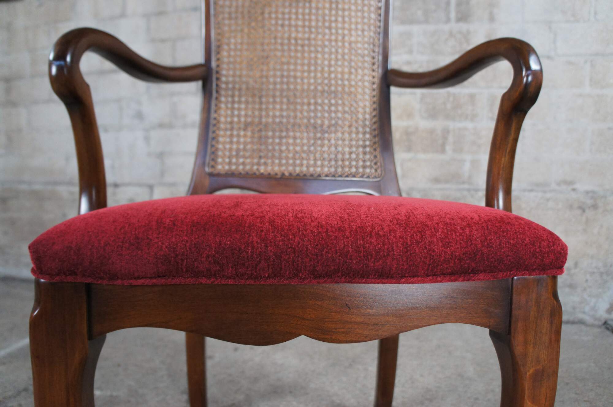 Six vintage dining chairs by Harden Furniture, circa 1958. Made of solid cherry featuring a crest rail leading to caned backs, red upholstery and cabriole leds leading to pad feet. Includes a serpentine seat apron and chamfered corners just beneath the seat. Includes two captains chairs with gooseneck arms and four sides.