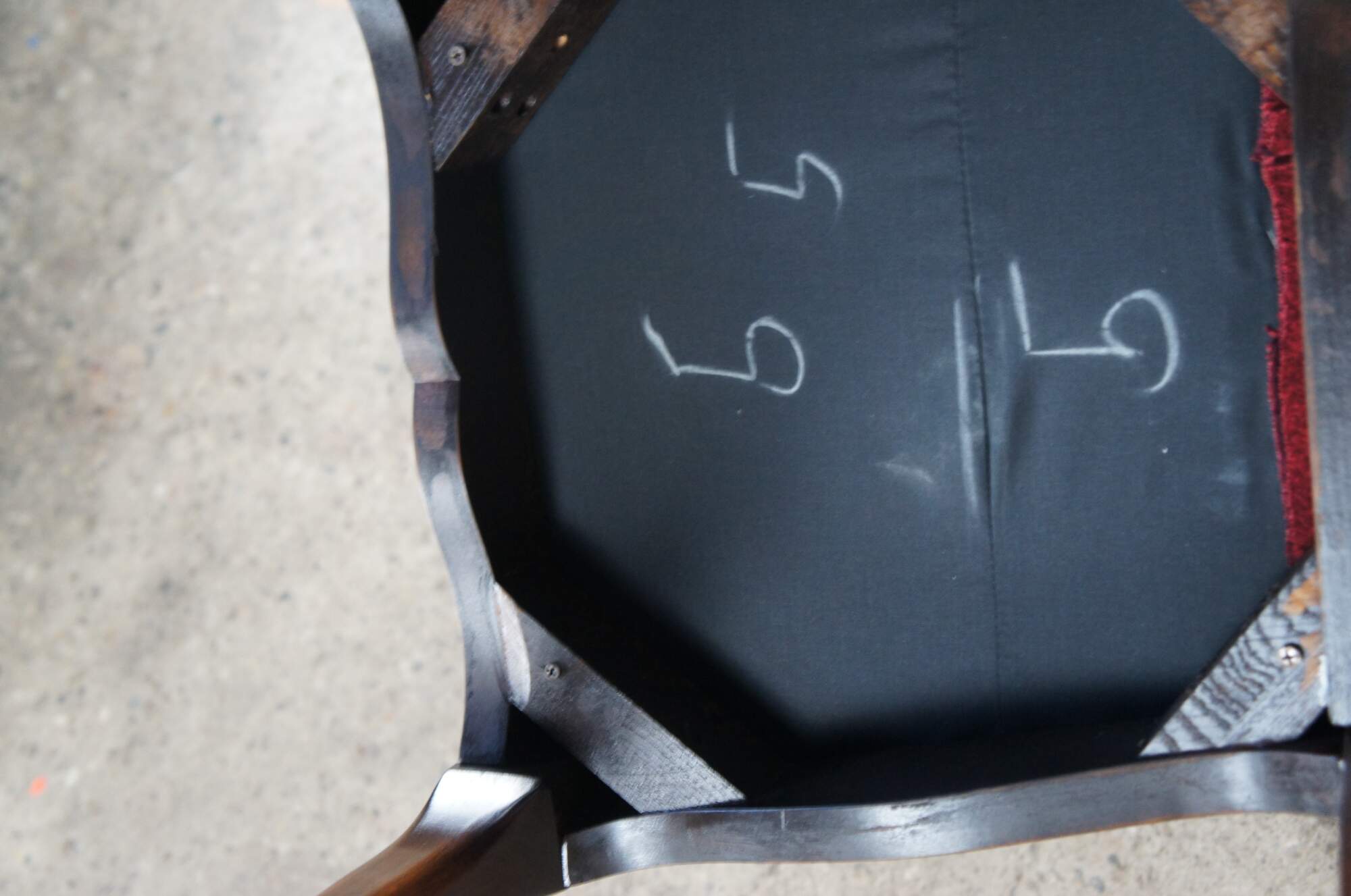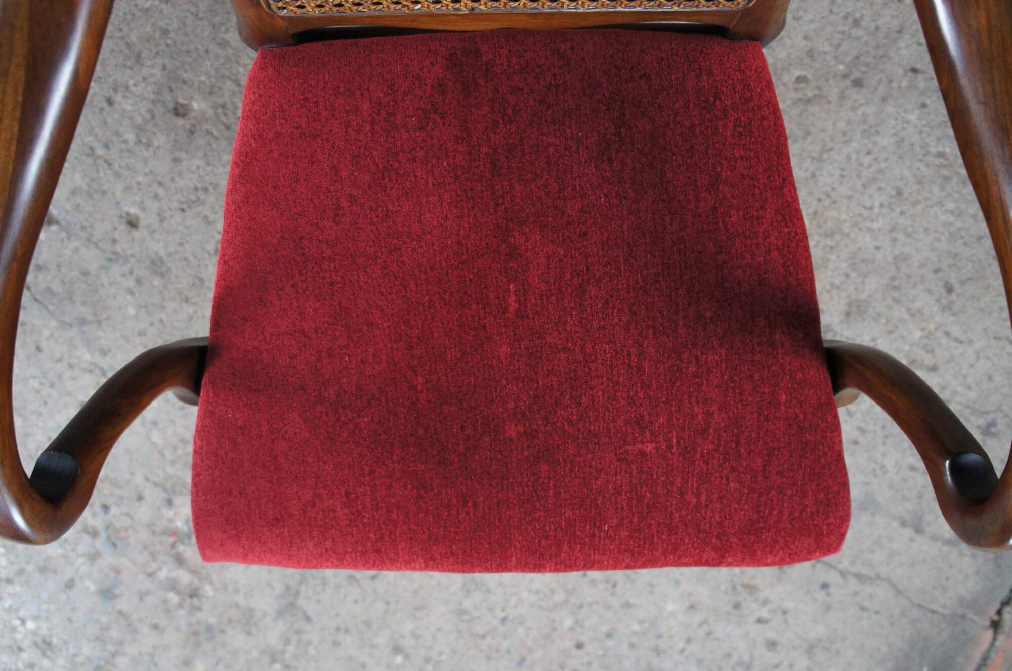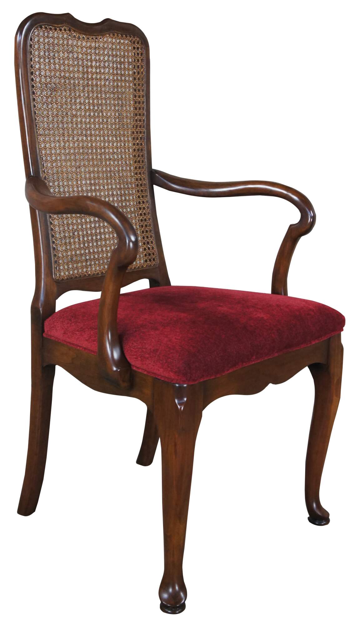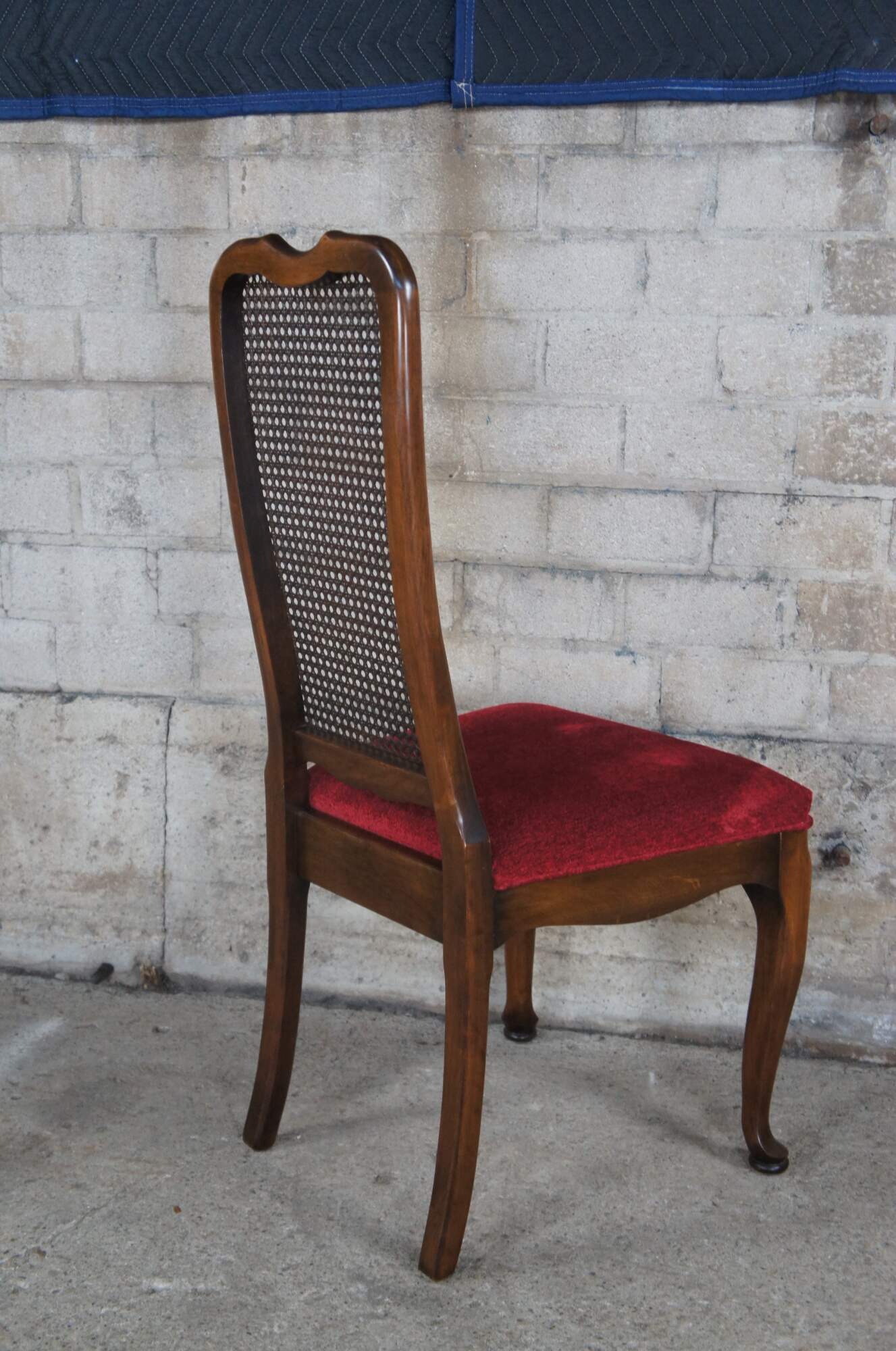 Six vintage dining chairs by Harden Furniture, circa 1958. Made of solid cherry featuring a crest rail leading to caned backs, red upholstery and cabriole leds leading to pad feet. Includes a serpentine seat apron and chamfered corners just beneath the seat. Includes two captains chairs with gooseneck arms and four sides.
