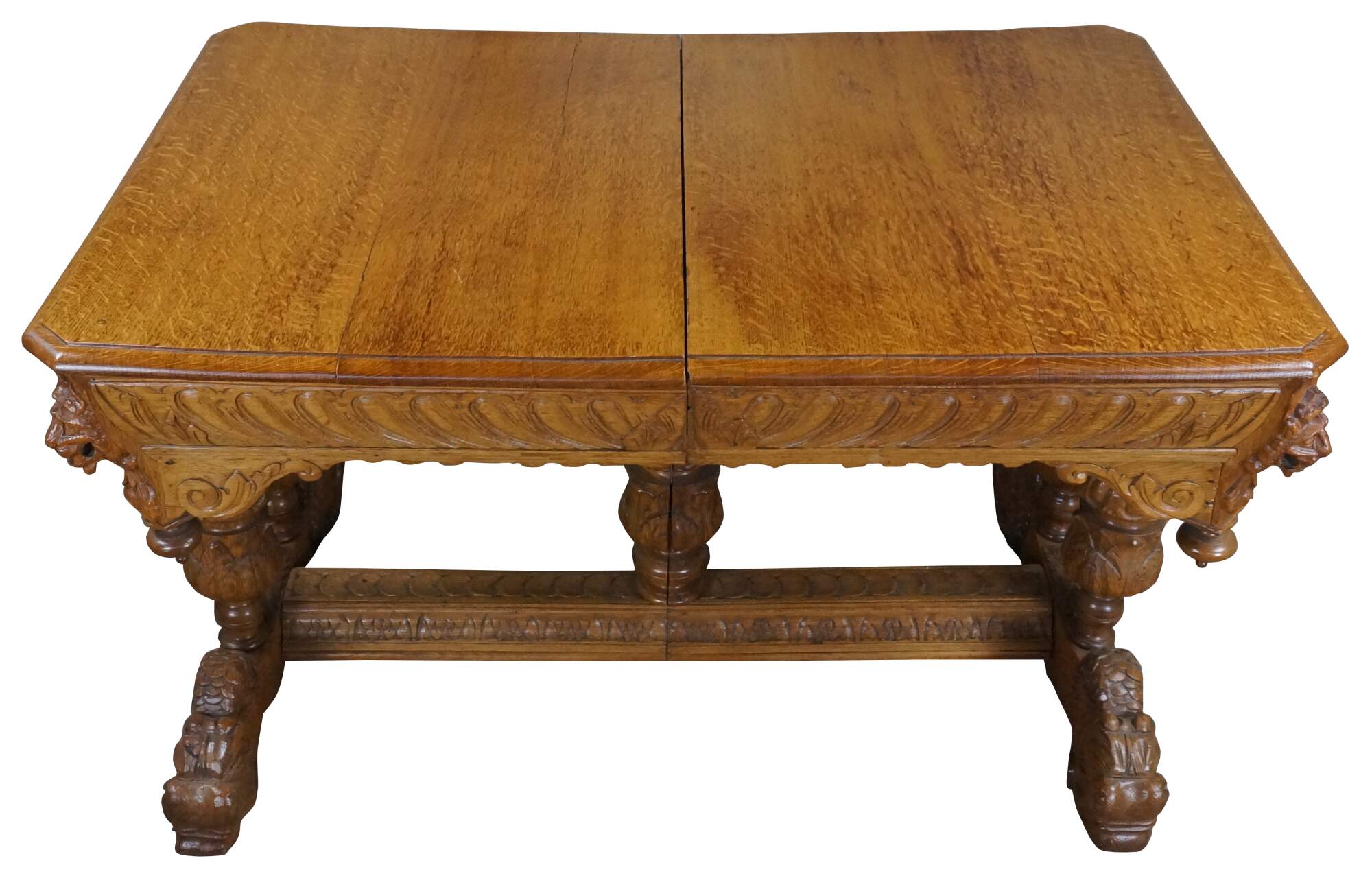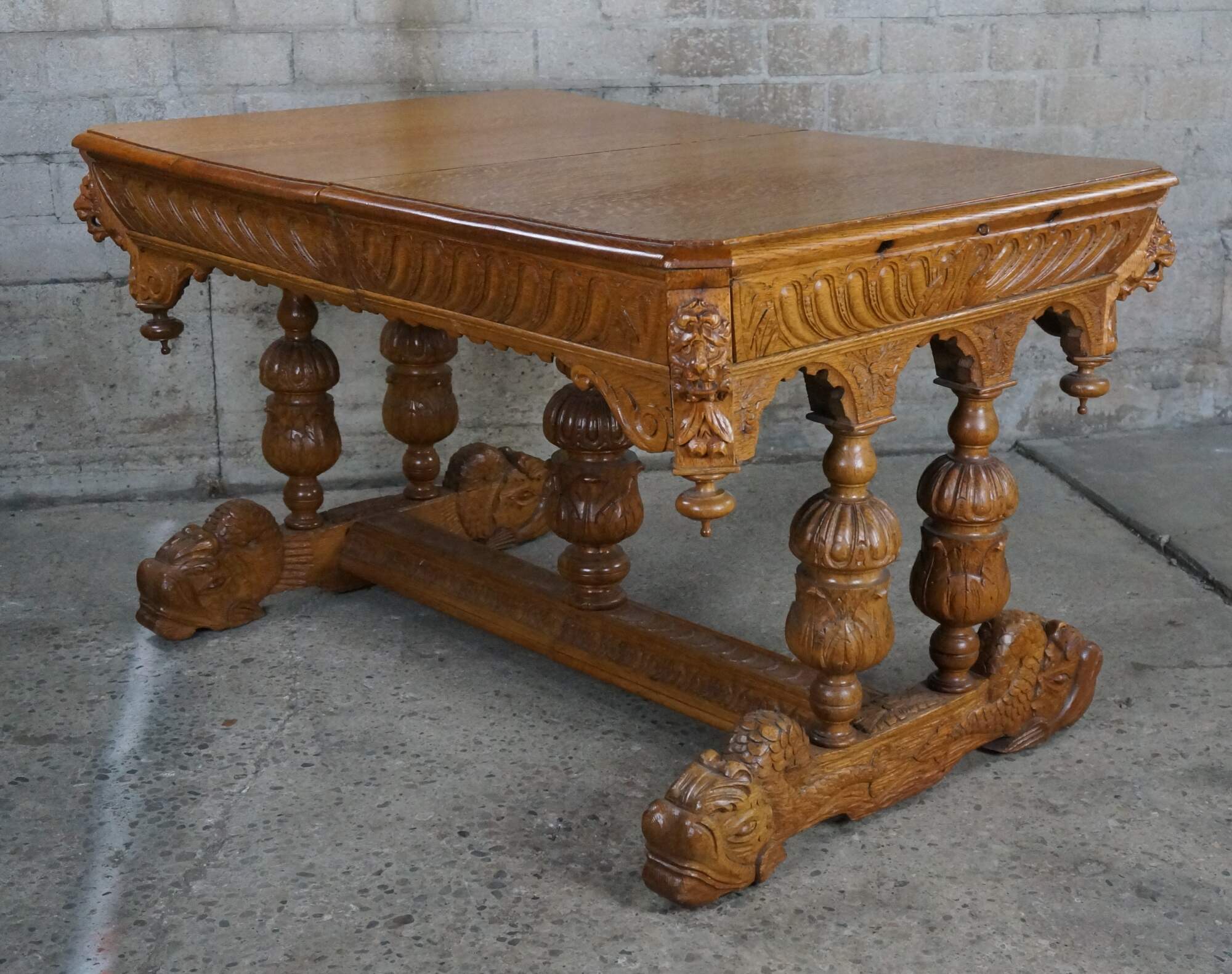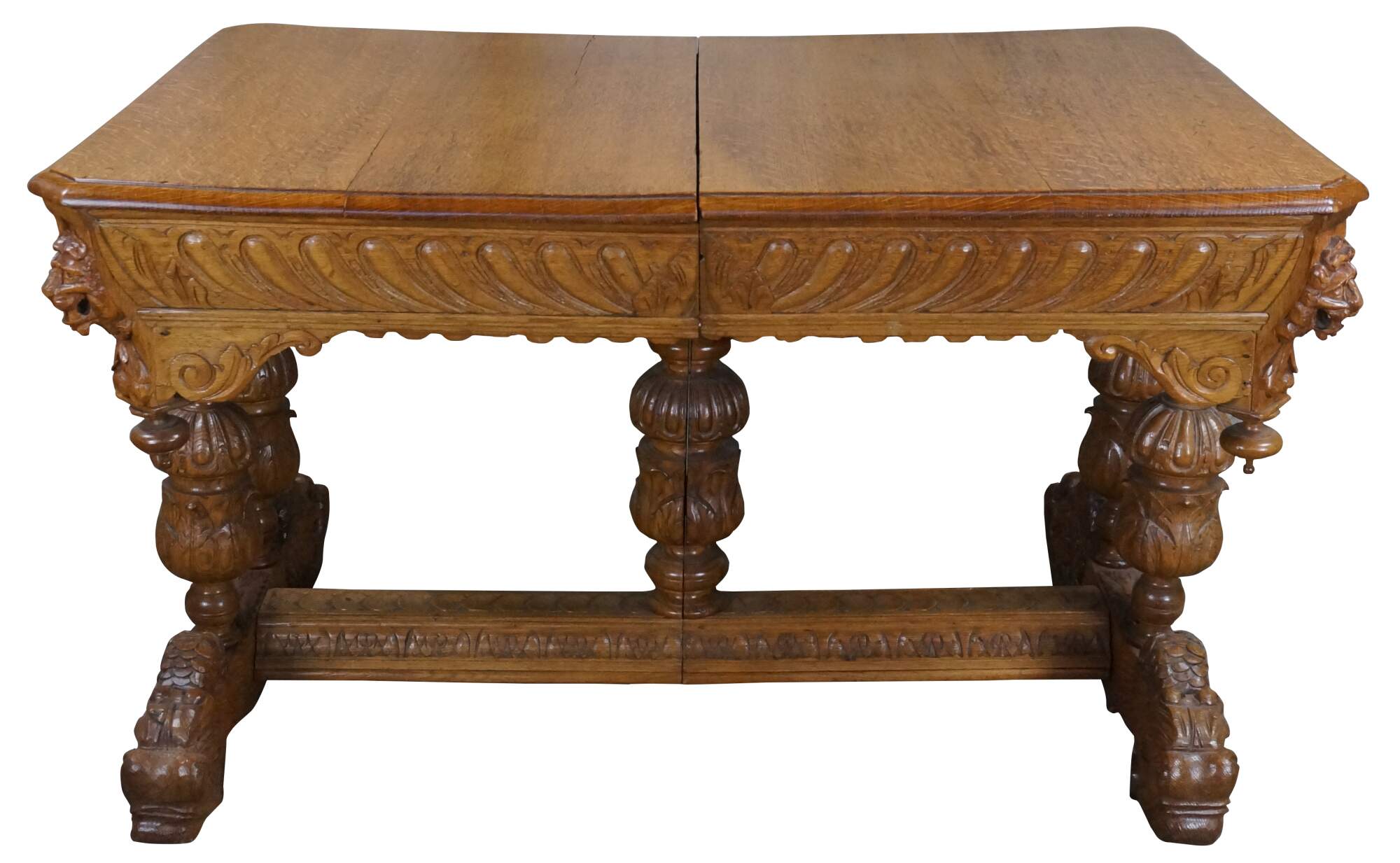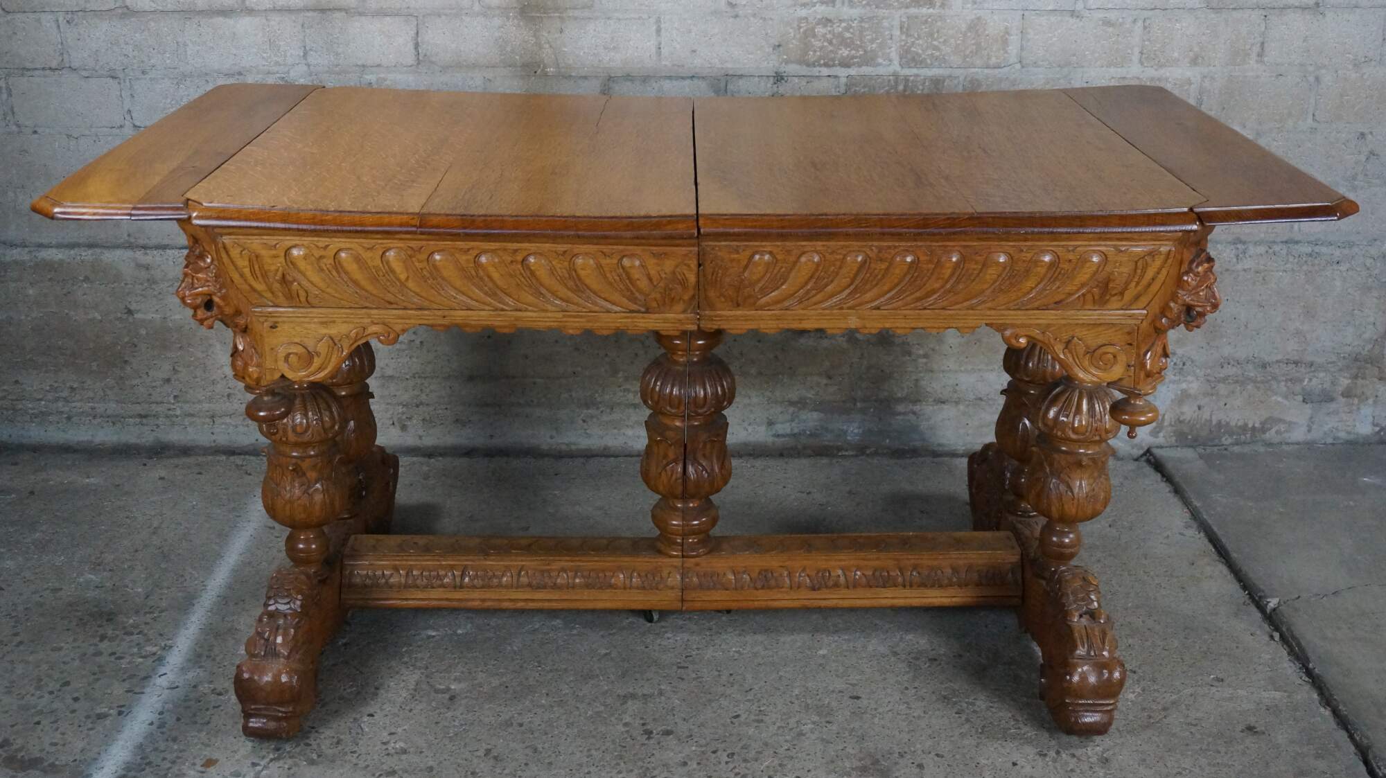 Antique 19th Century Figural French Renaissance Revival / Elizbethan style Dining or Library Table. A rectangular form made from oak with a quartersawn top. Features a thick gadrooned apron with ""S"" scrolls, gothic arches, drop finials and carved lions heads along each corner. The table is supported by hand turned robust baluster supports leading to an ornate carved base featuring Delphin (Dolphin) feet. Includes original draw leaf style extensions and make shift table leaves. Circa 1880s