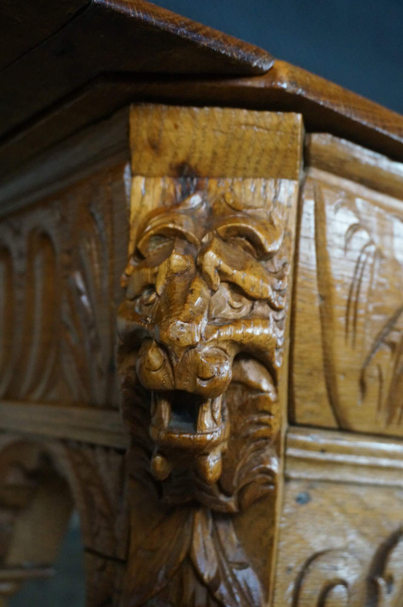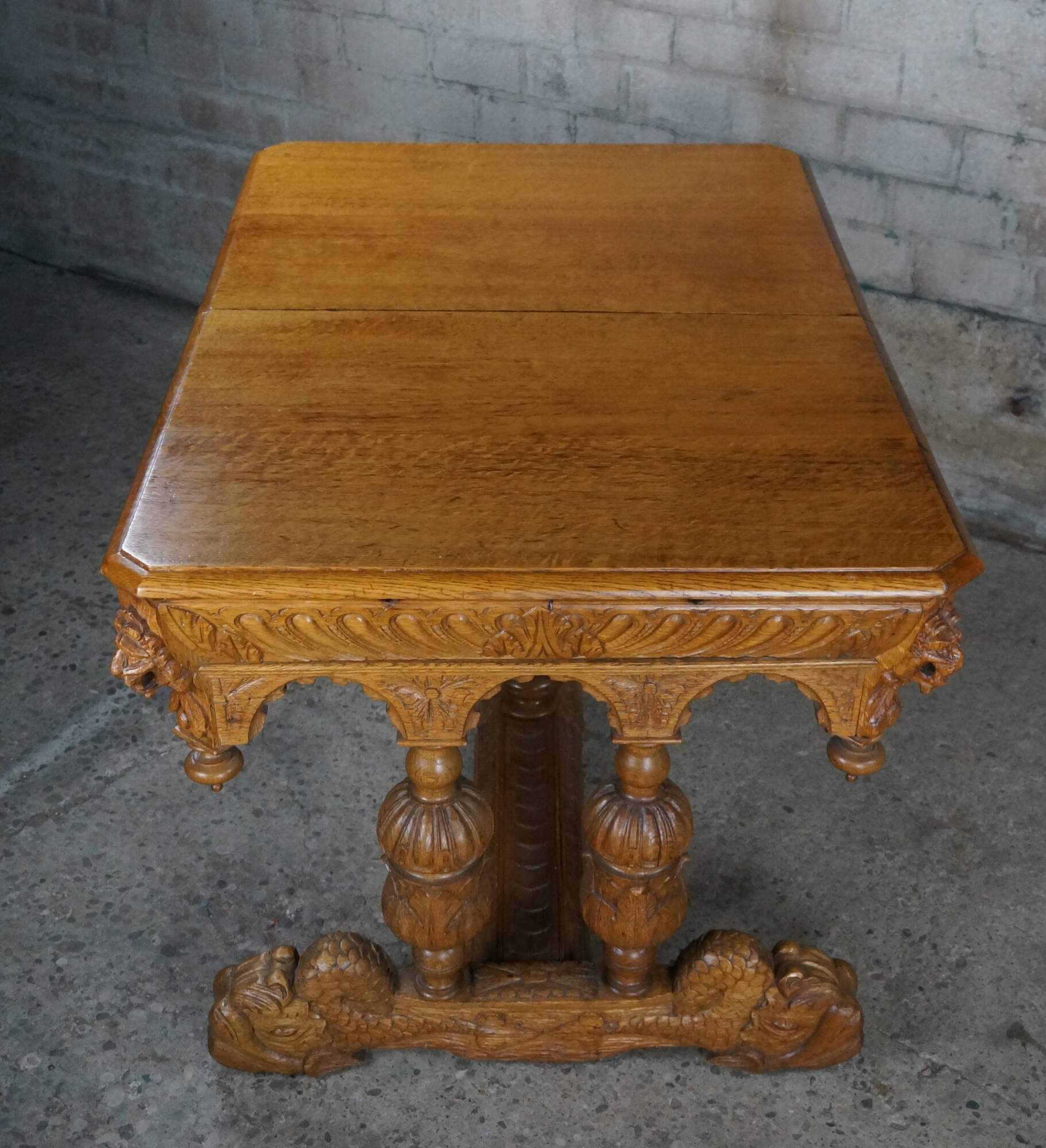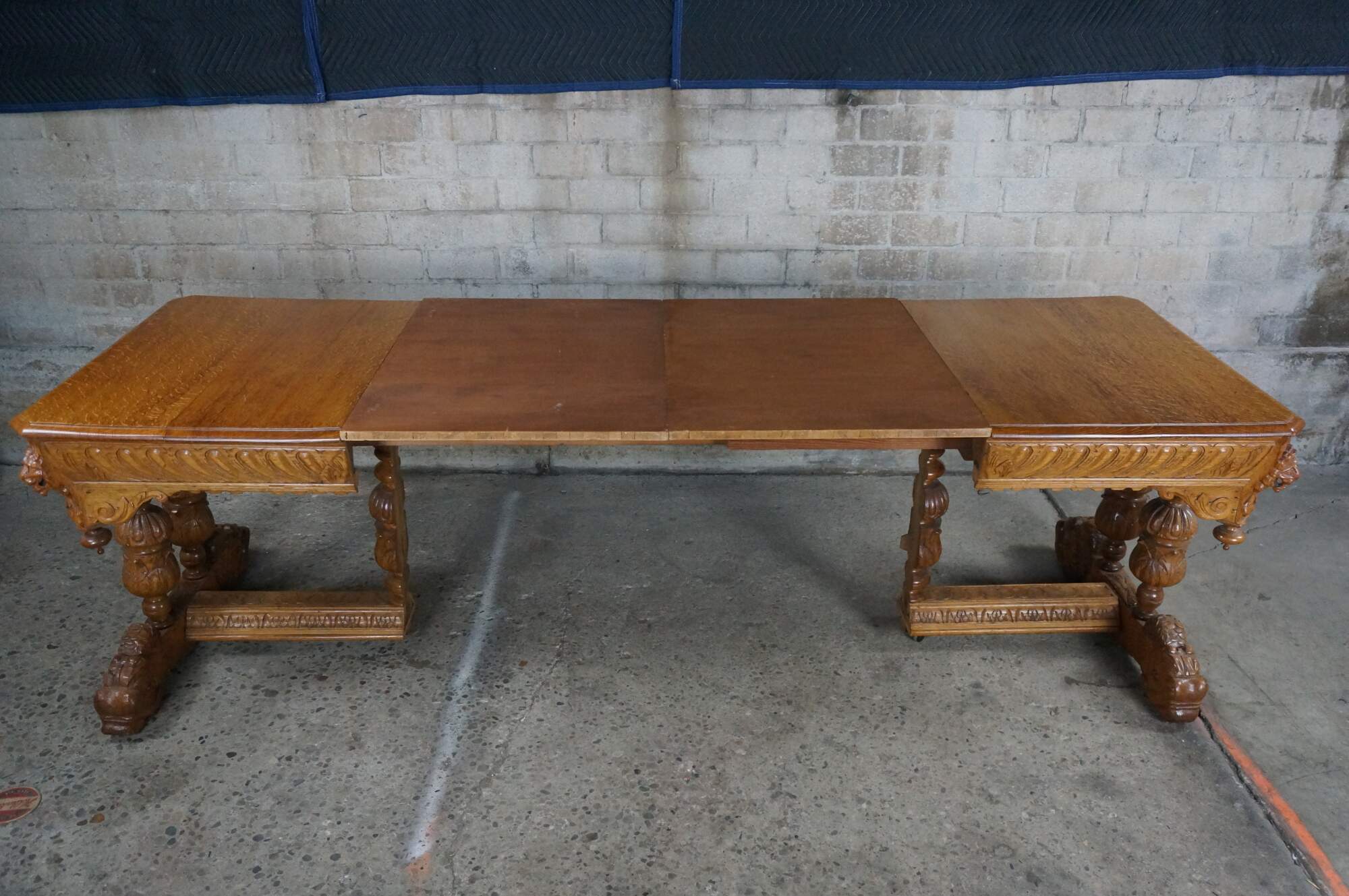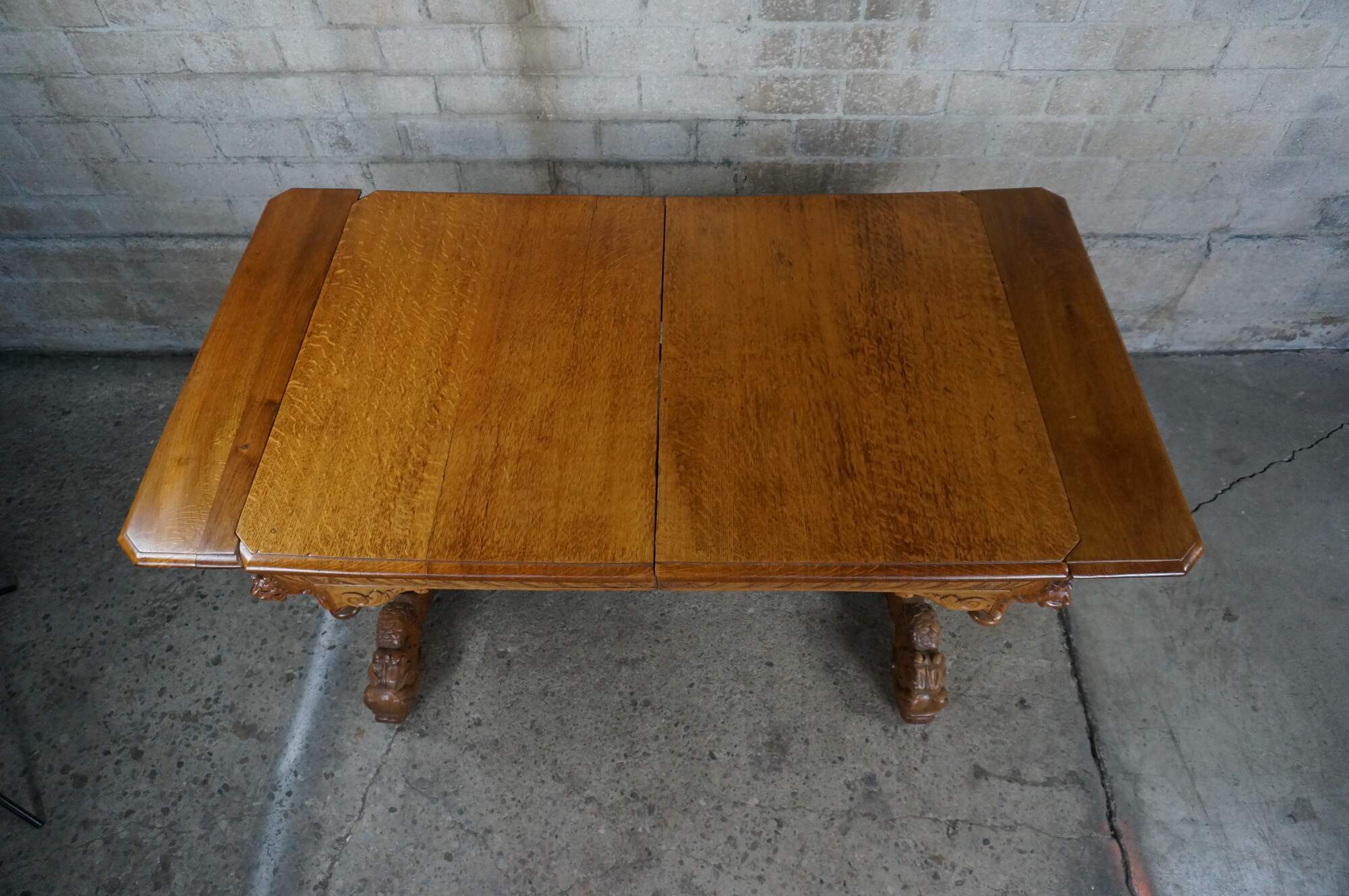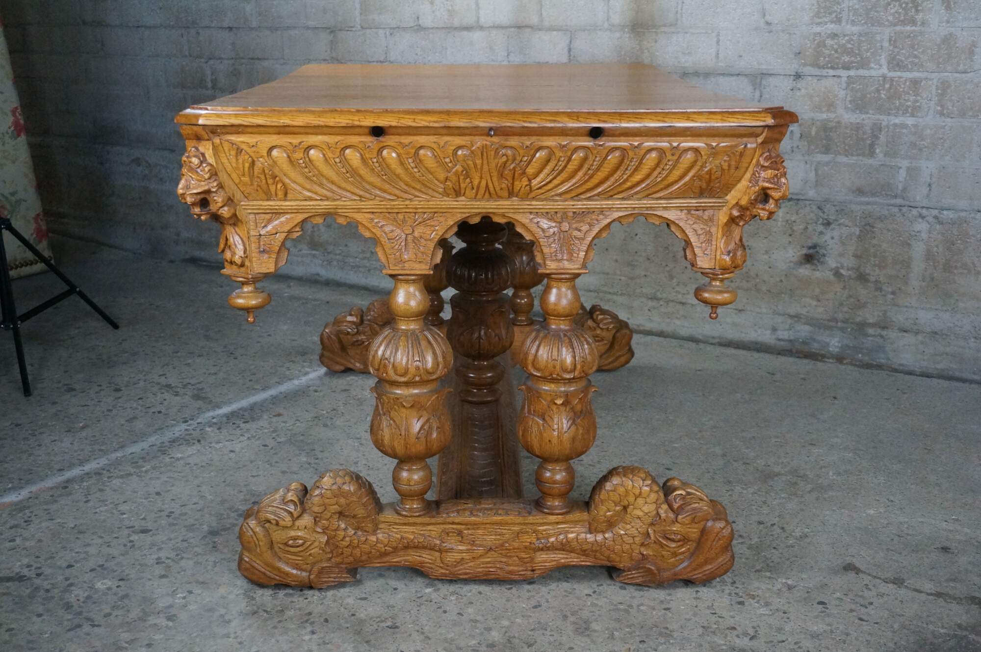 Antique 19th Century Figural French Renaissance Revival / Elizbethan style Dining or Library Table. A rectangular form made from oak with a quartersawn top. Features a thick gadrooned apron with ""S"" scrolls, gothic arches, drop finials and carved lions heads along each corner. The table is supported by hand turned robust baluster supports leading to an ornate carved base featuring Delphin (Dolphin) feet. Includes original draw leaf style extensions and make shift table leaves. Circa 1880s
