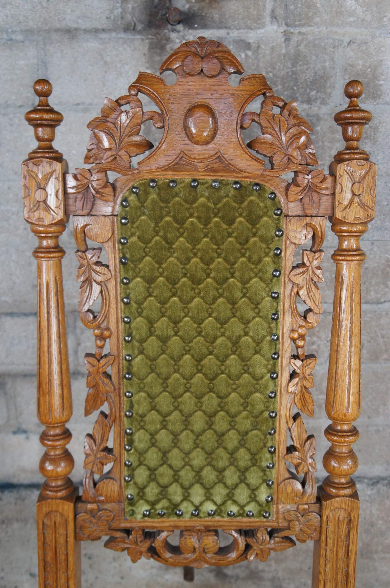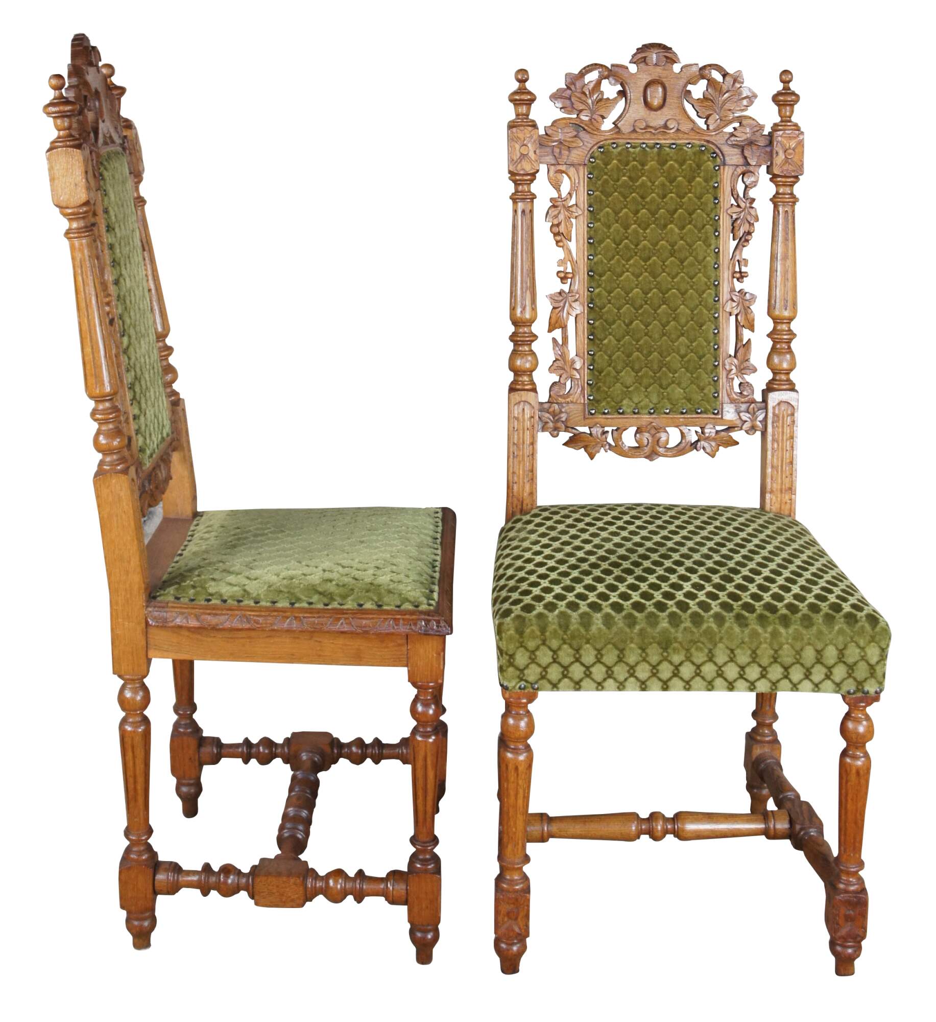 6 Antique French Renaissance Revival / Henry II Dining Chairs. Made from oak and ornately carved. Features a shielded heralic crest rail leading to leaf & berry foliate. Includes fluted, turned stiles and legs, a craved frieze and green upholstered geometric interlaced diamond pattern fabric with nailhead trim. 19th century, circa 1880s