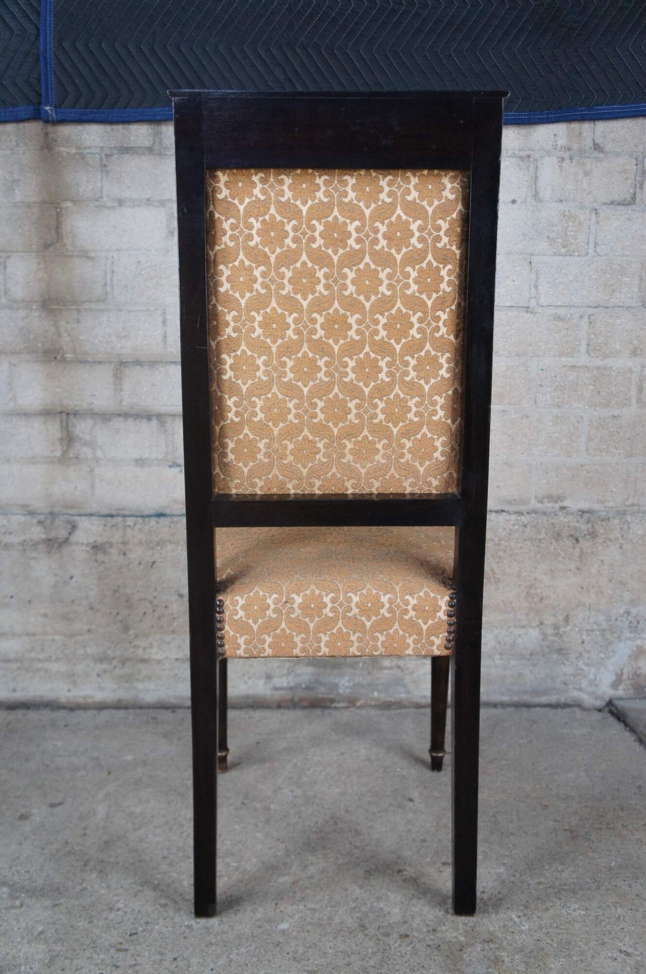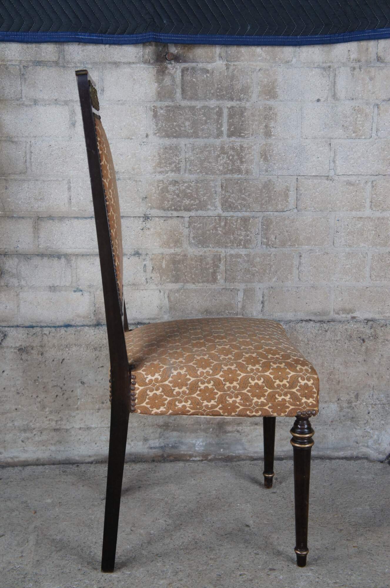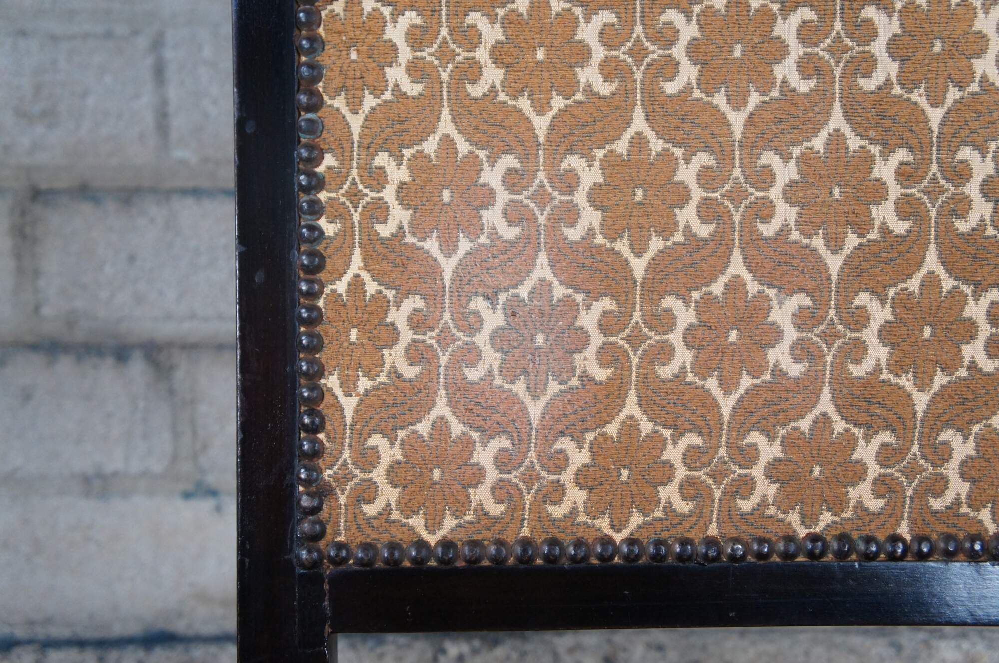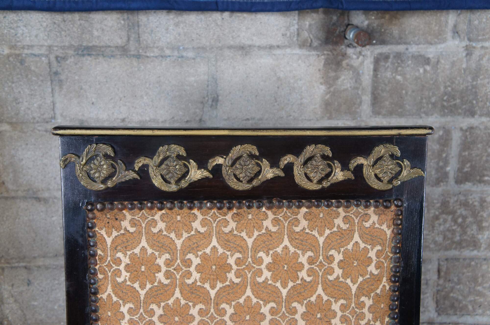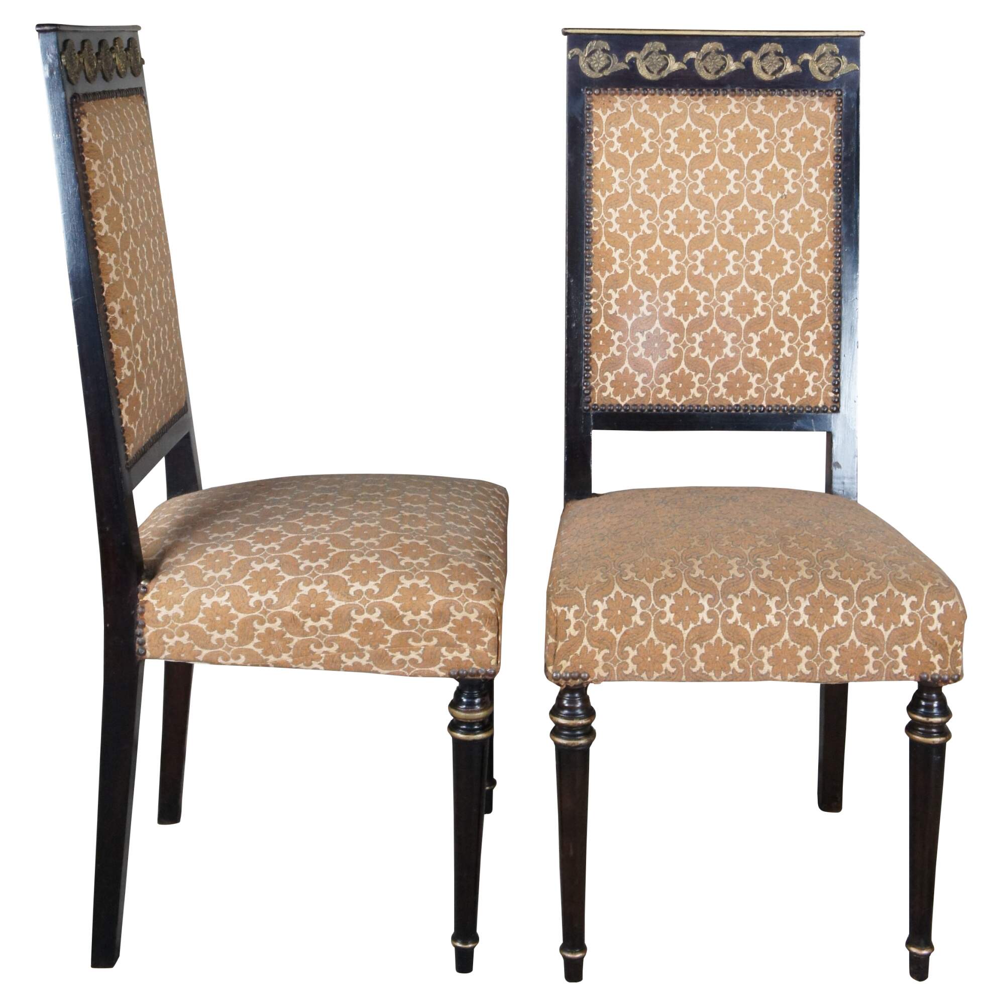 Vintage set of six French Louis XVI inspired dining chairs. Made in Cairo Egypt (Arabska Republika Egiptu) by Abbas, circa 1972. Made of ebonized wood featuring ornate brass medallions with floral upholstery, nailhead trim, and gold banding.