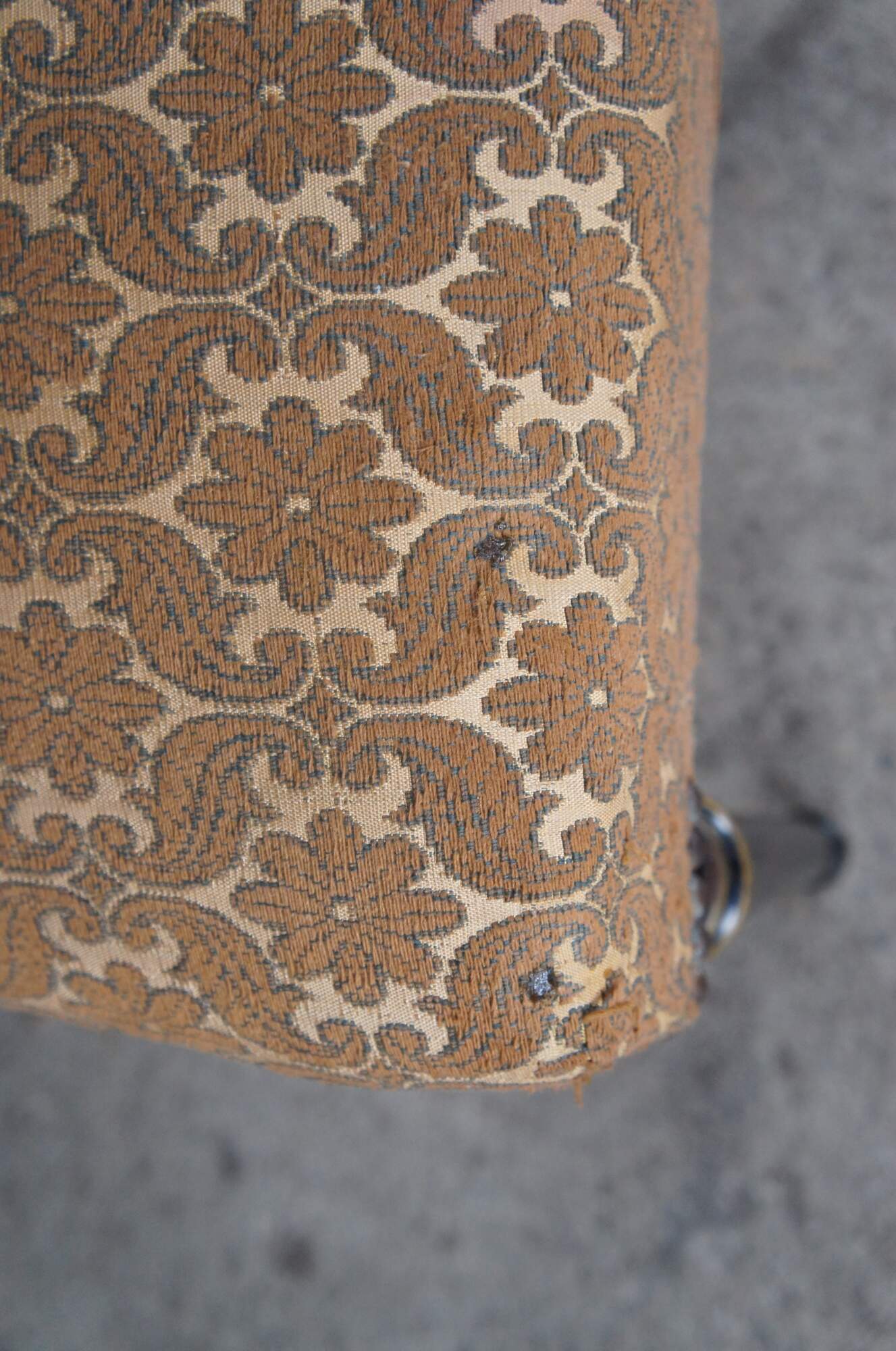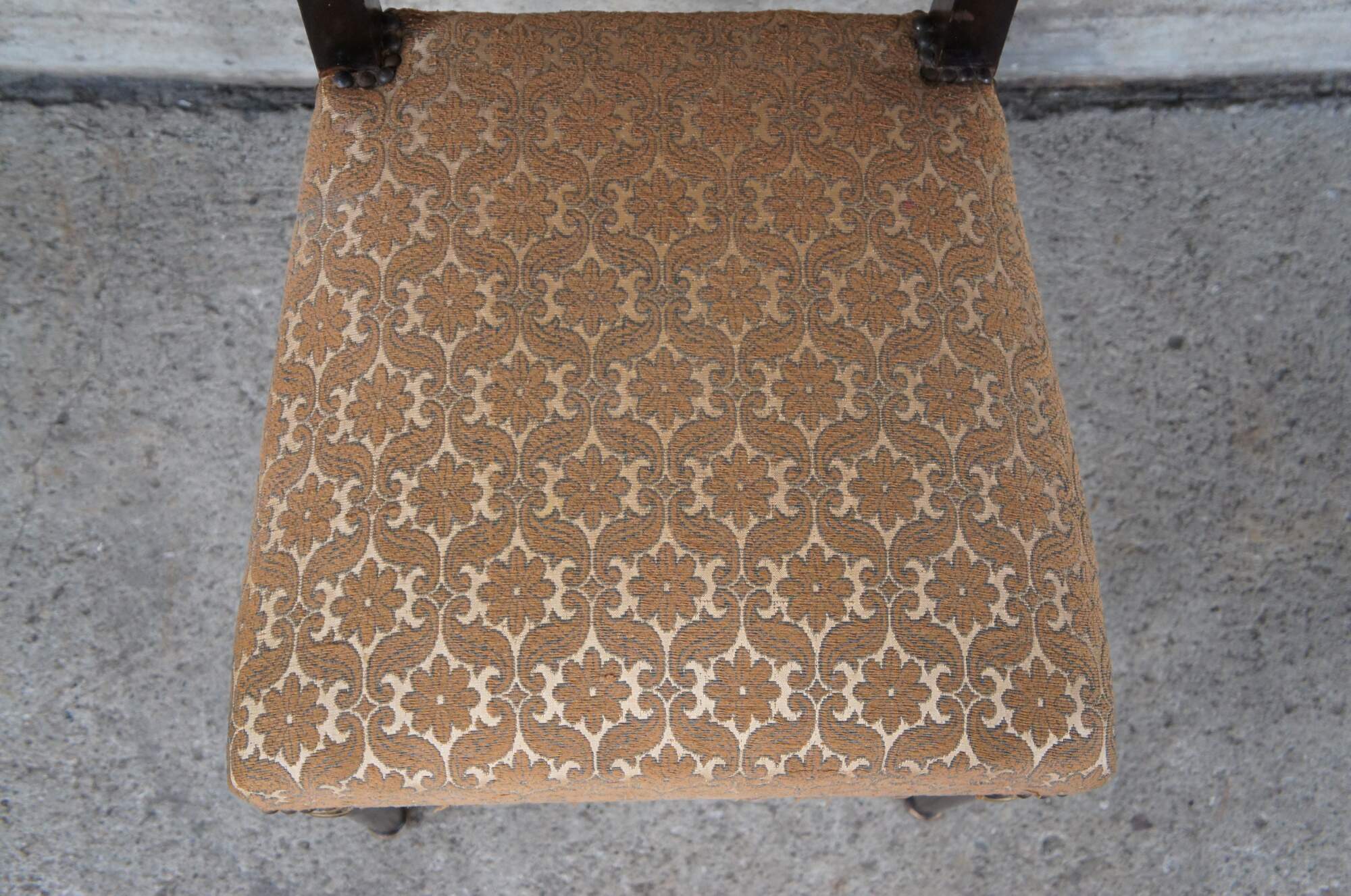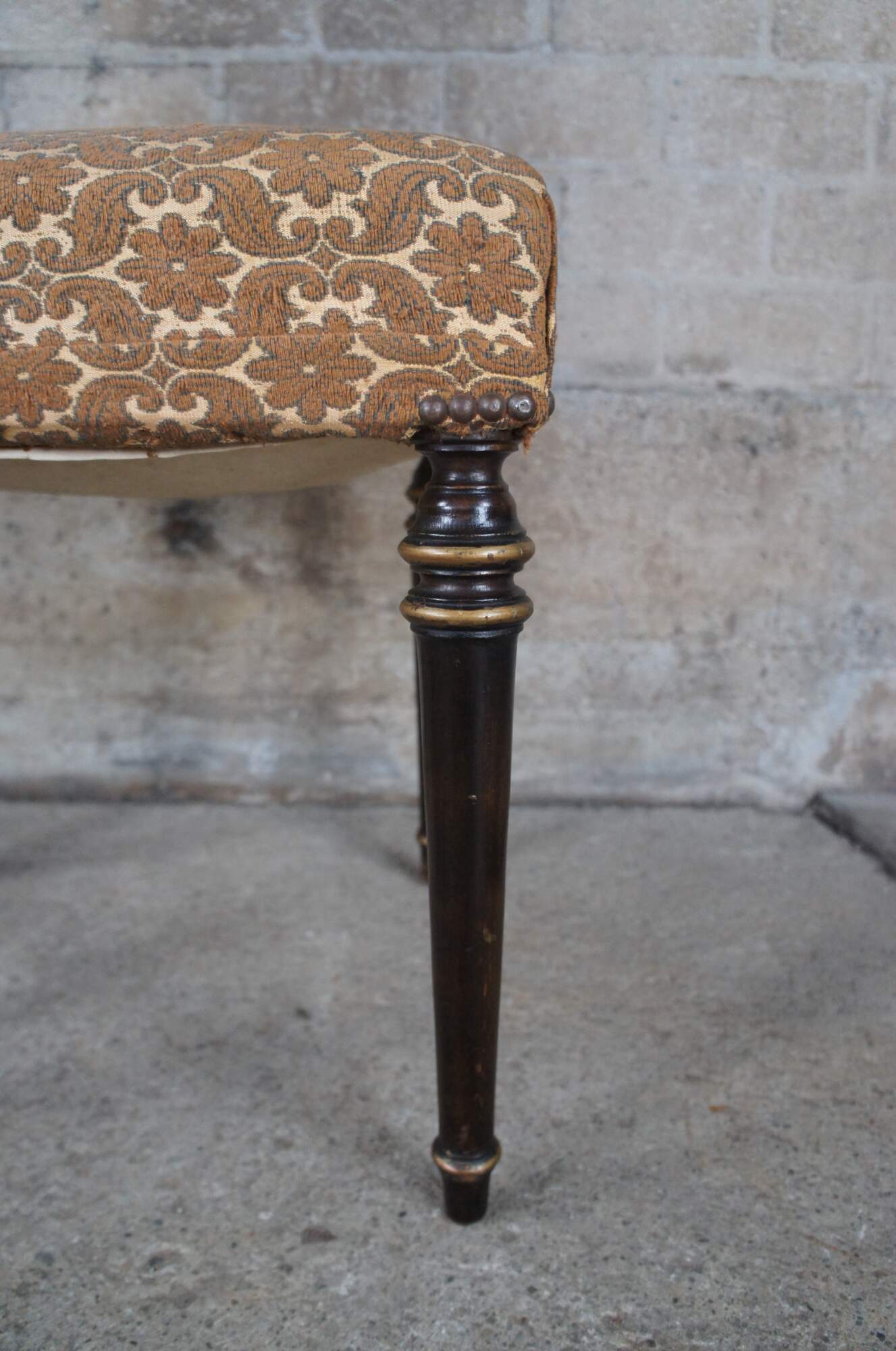 Good vintage condition, wear and distressing commensurate with age and use, finish loss / marking, splitting, corrosion around nailheads, pulls and spotting to upholstery, wear to guilding.