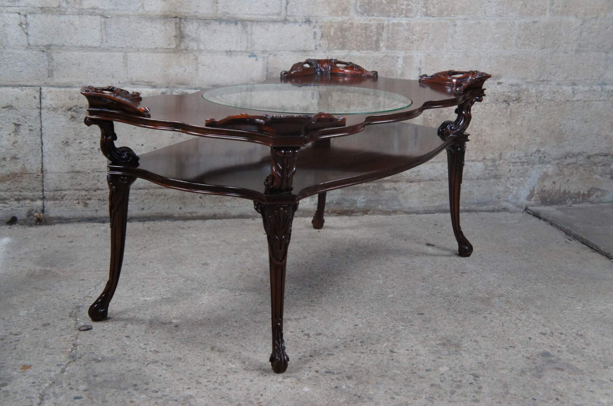 Adams Always Fine Furniture Louis XV style tiered coffee table, circa 1930-40s. Beautifully designed with acanthus and scalloped details. Features an inset round glass top resting on a raised wooden top supported by ""s"" scrolls with raised and carved details along each corner. The circular glass inserts have a round frosted detail along the underside. Supported by long cabriole legs terminating into ""c"" scrolled feet. Made in America