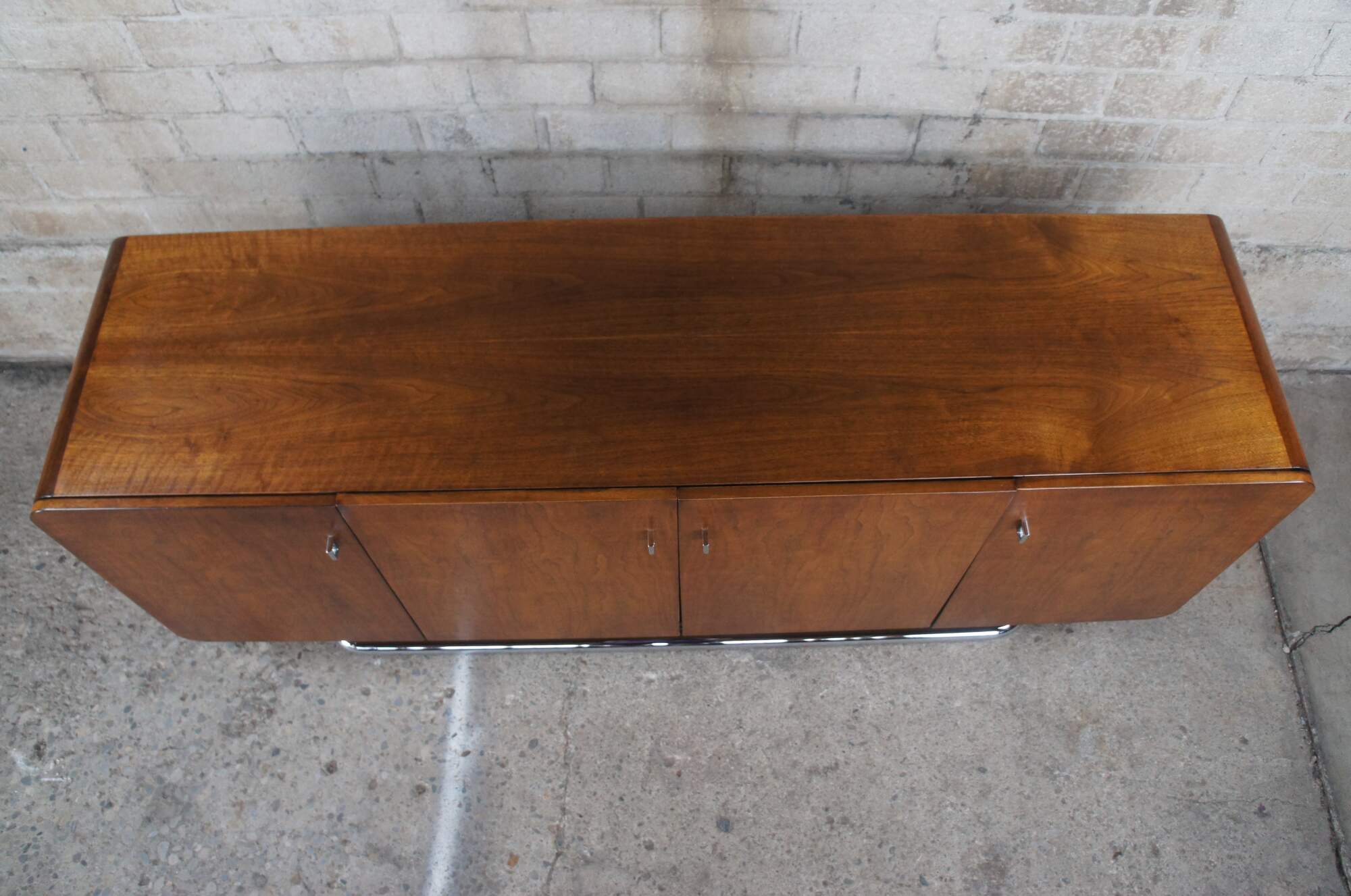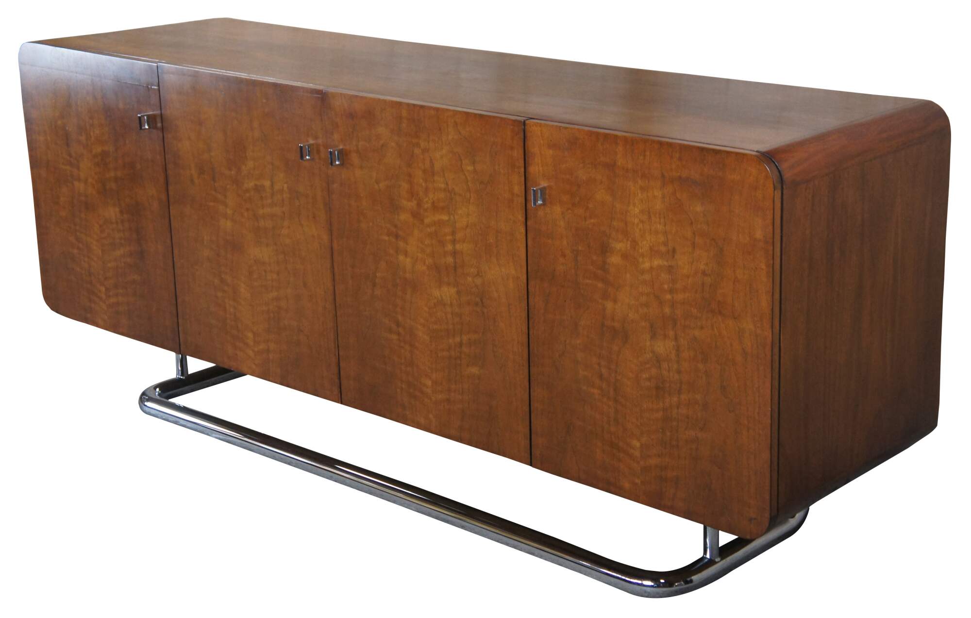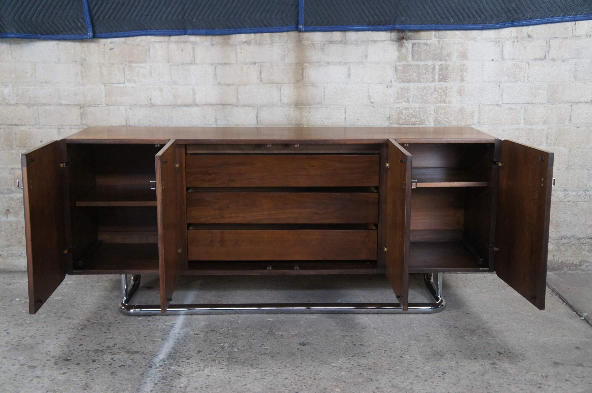 1970s Vintage Buffet, Credenza or Sideboard by Jack Cartwright for Founders Furniture. The carefully chosen American walnut veneers compliment the sleek tubular chrome base. Interior storage includes three center drawers flanked by adjustable shelves. Founders Furniture was started in 1946 as a subsidiary of the esteemed Knoll International to manufacture their residential line. Jack Cartwright designed their iconic lines that speak to mid century modern collectors today.
