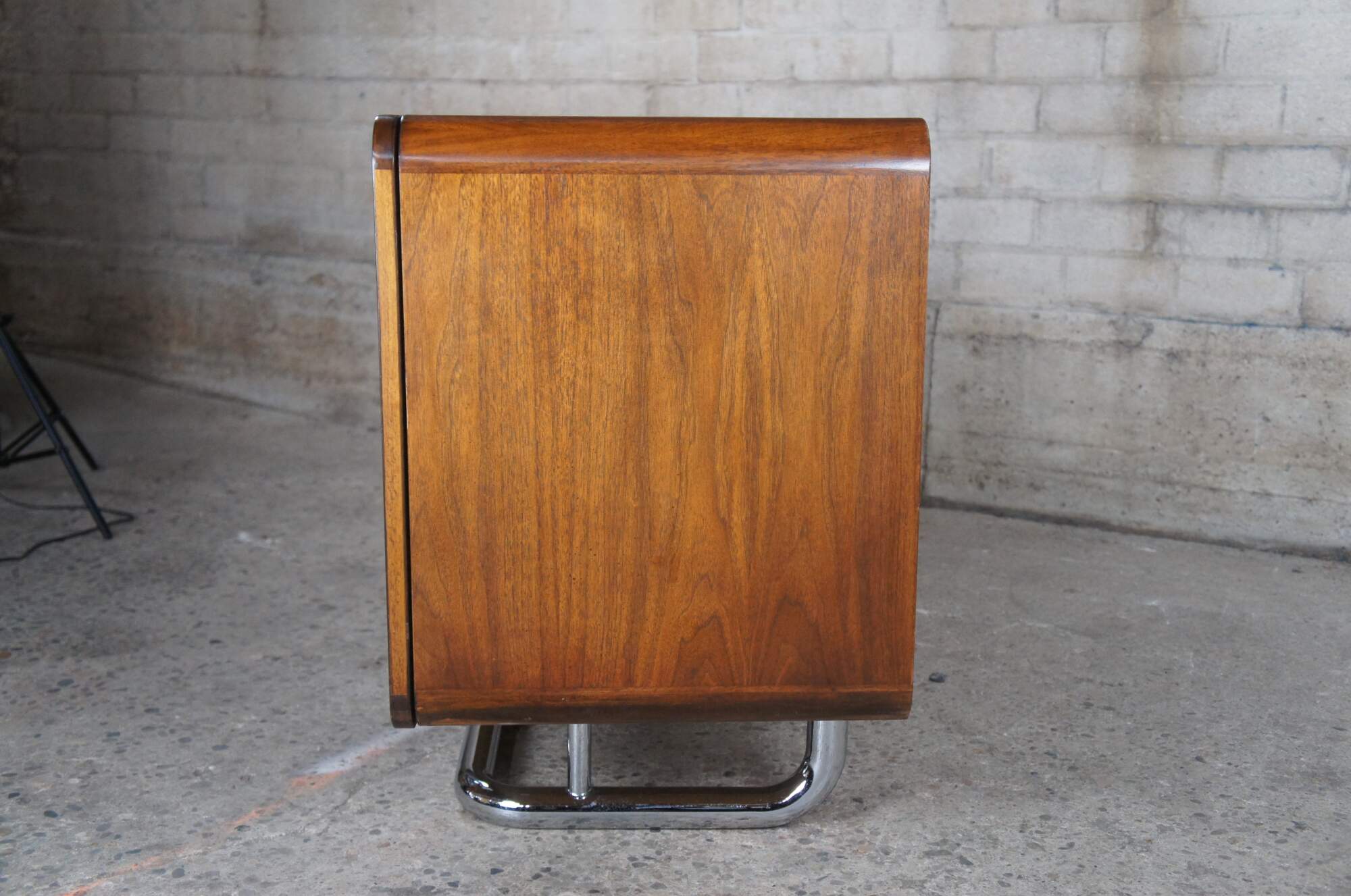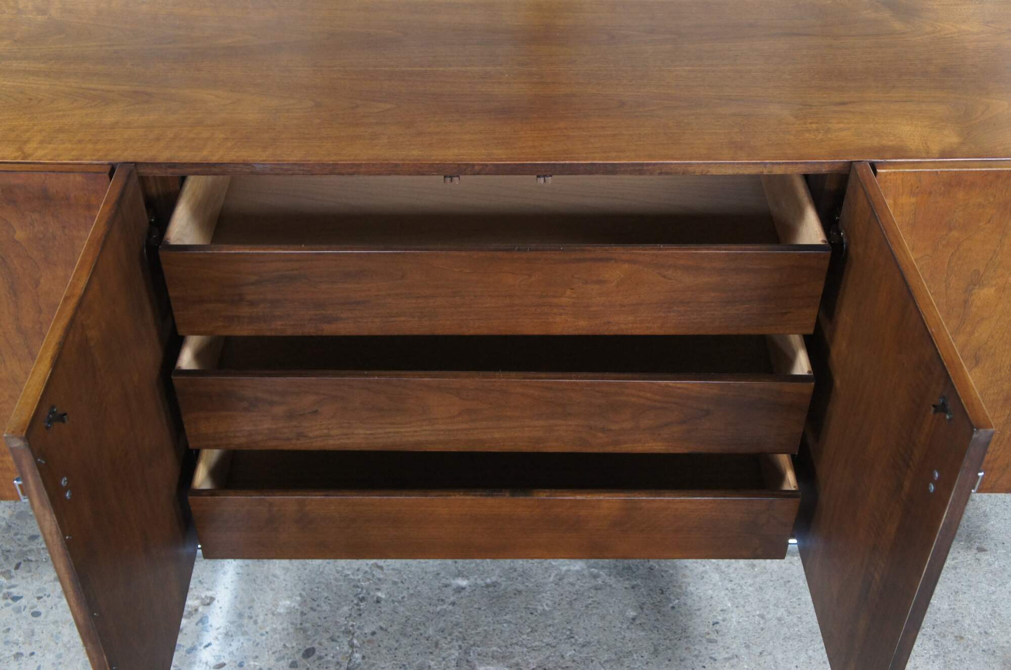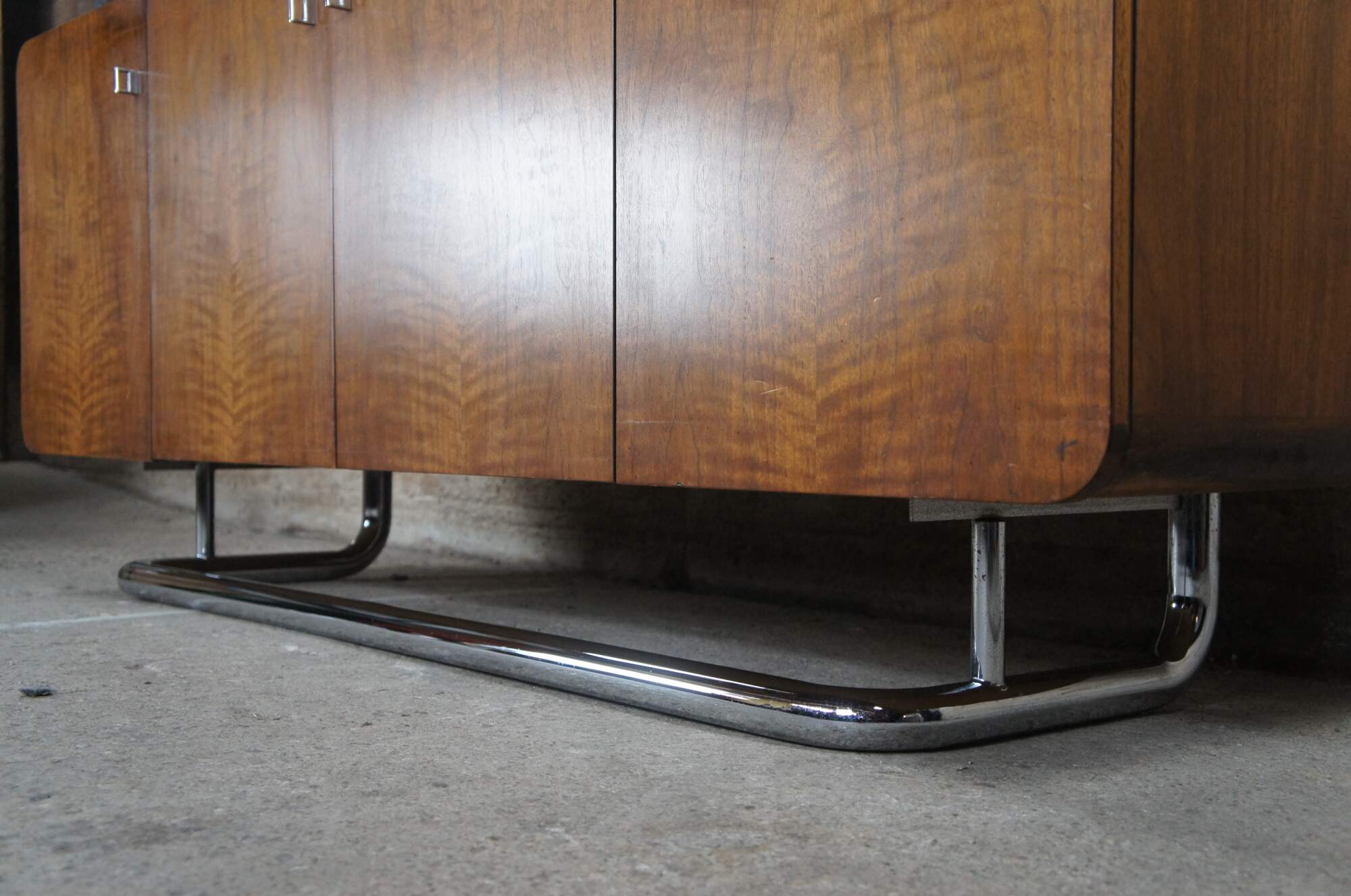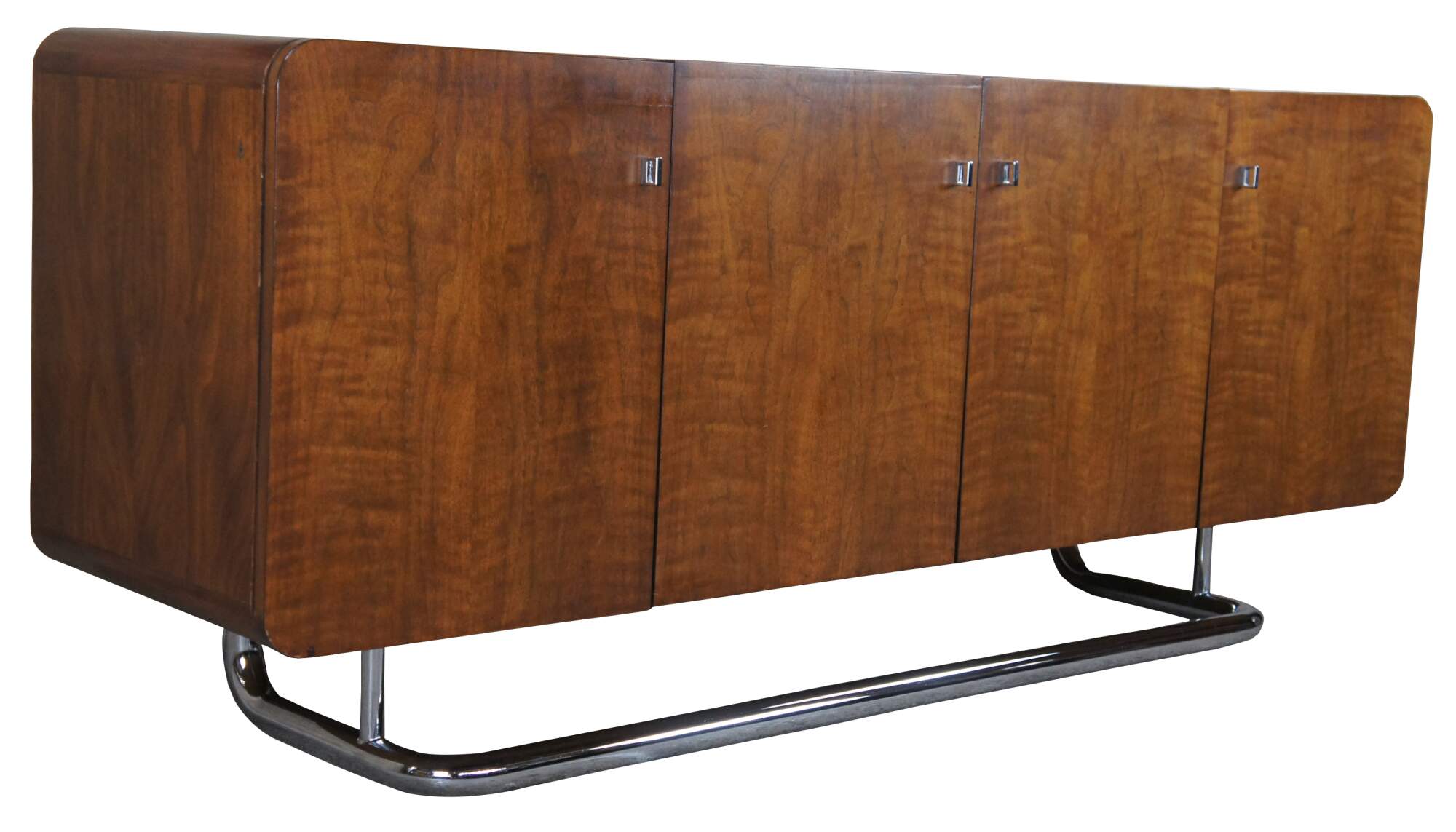 1970s Vintage Buffet, Credenza or Sideboard by Jack Cartwright for Founders Furniture. The carefully chosen American walnut veneers compliment the sleek tubular chrome base. Interior storage includes three center drawers flanked by adjustable shelves. Founders Furniture was started in 1946 as a subsidiary of the esteemed Knoll International to manufacture their residential line. Jack Cartwright designed their iconic lines that speak to mid century modern collectors today.