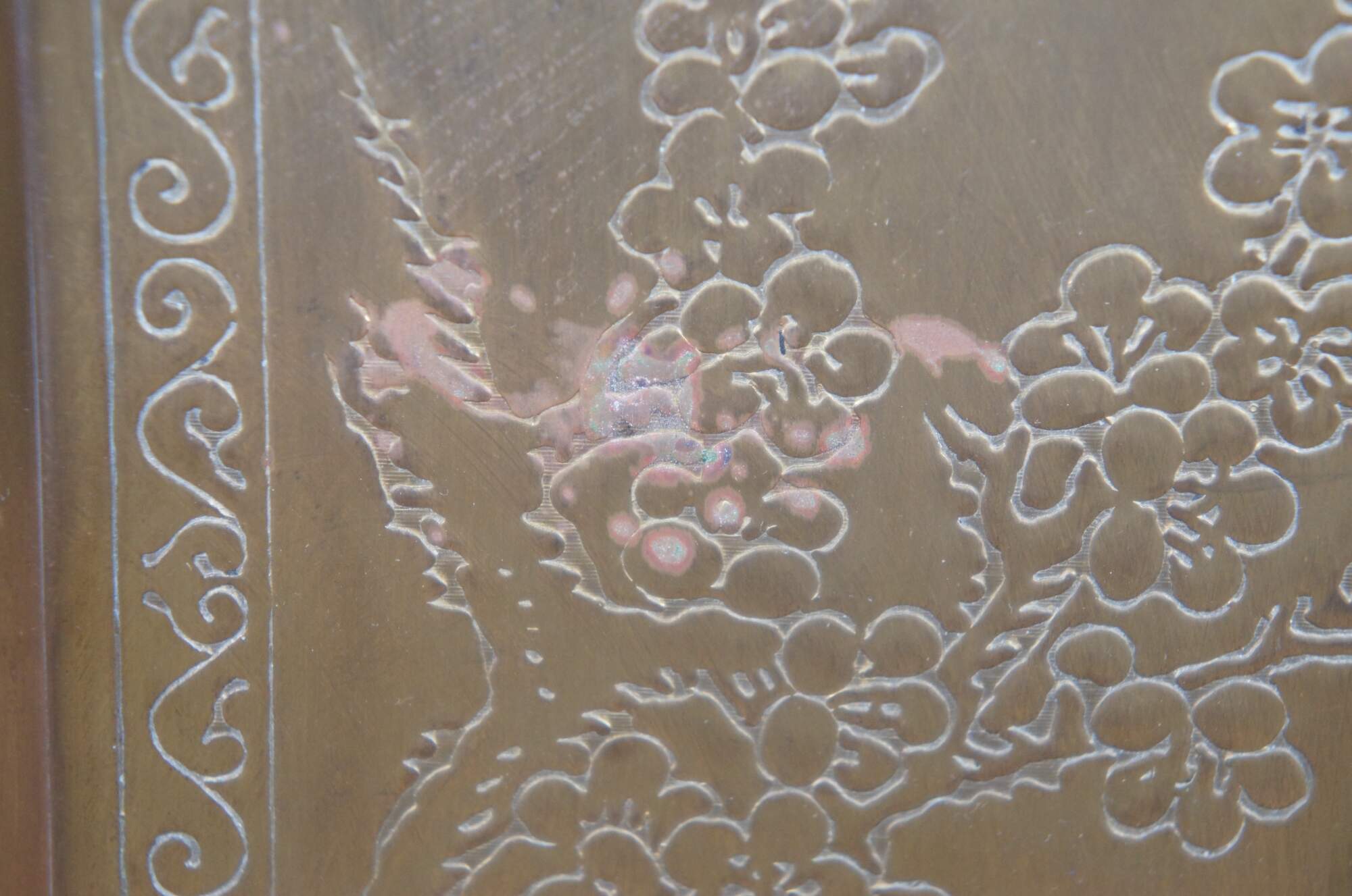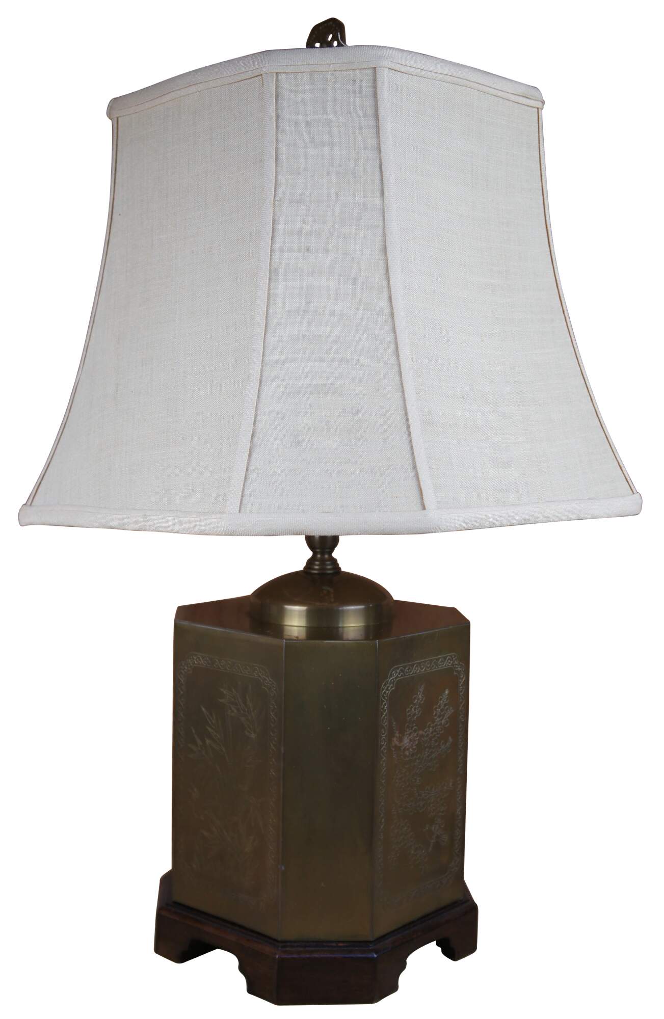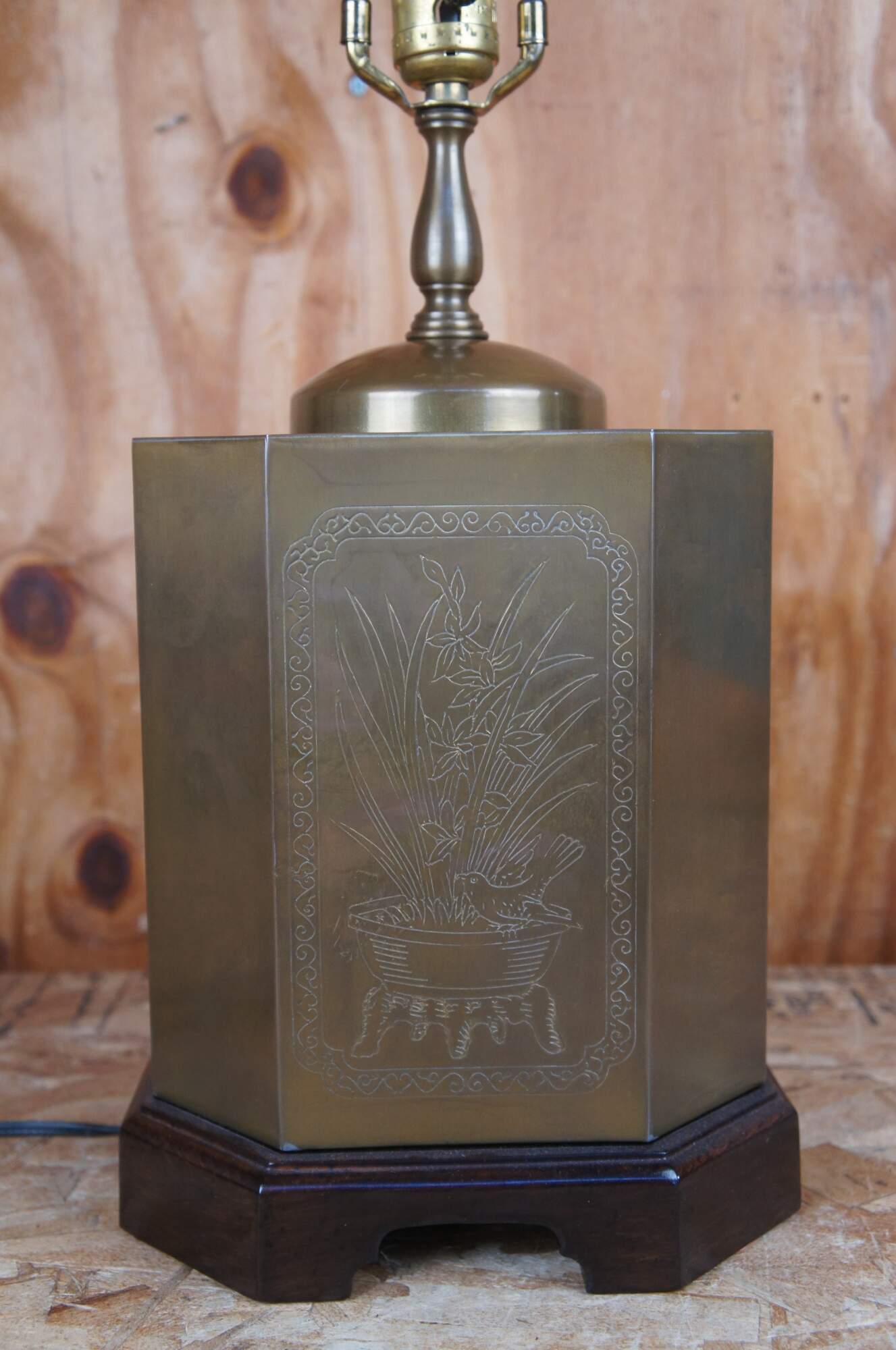 Vintage Frederick Cooper Chinese canister ginger jar or tea caddy table lamp featuring etched octagonal brass body with dogwood floral and bird motif.