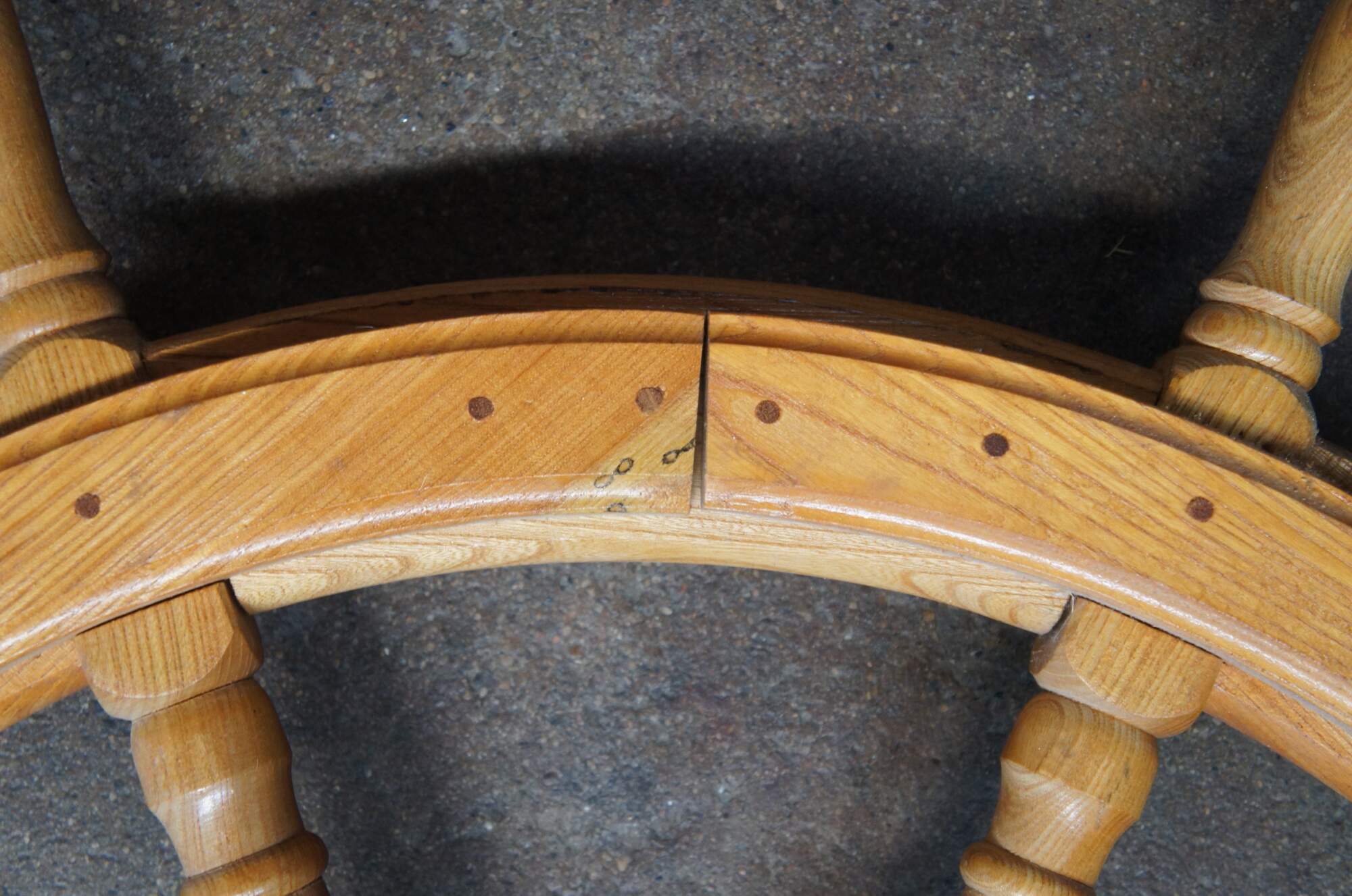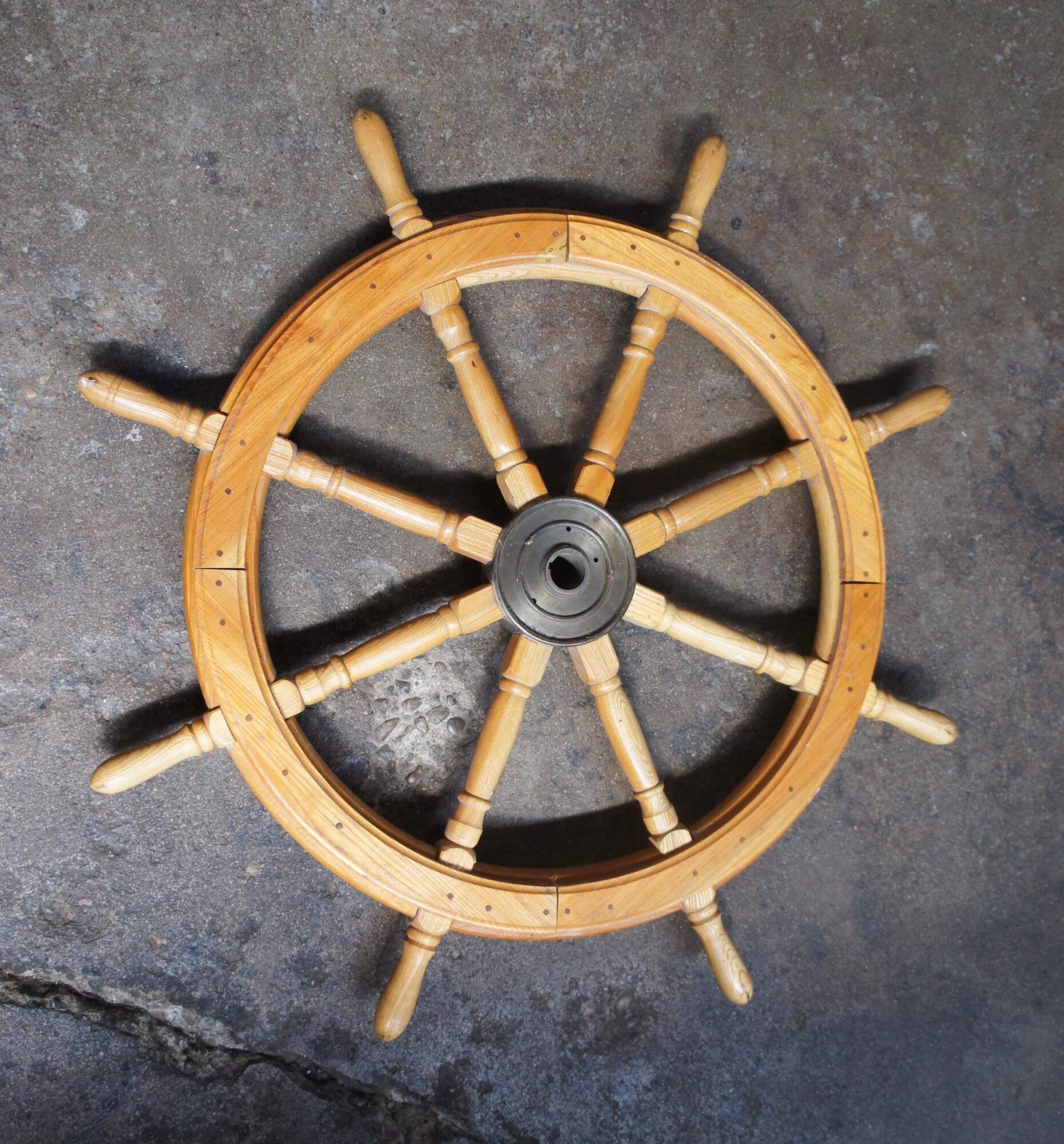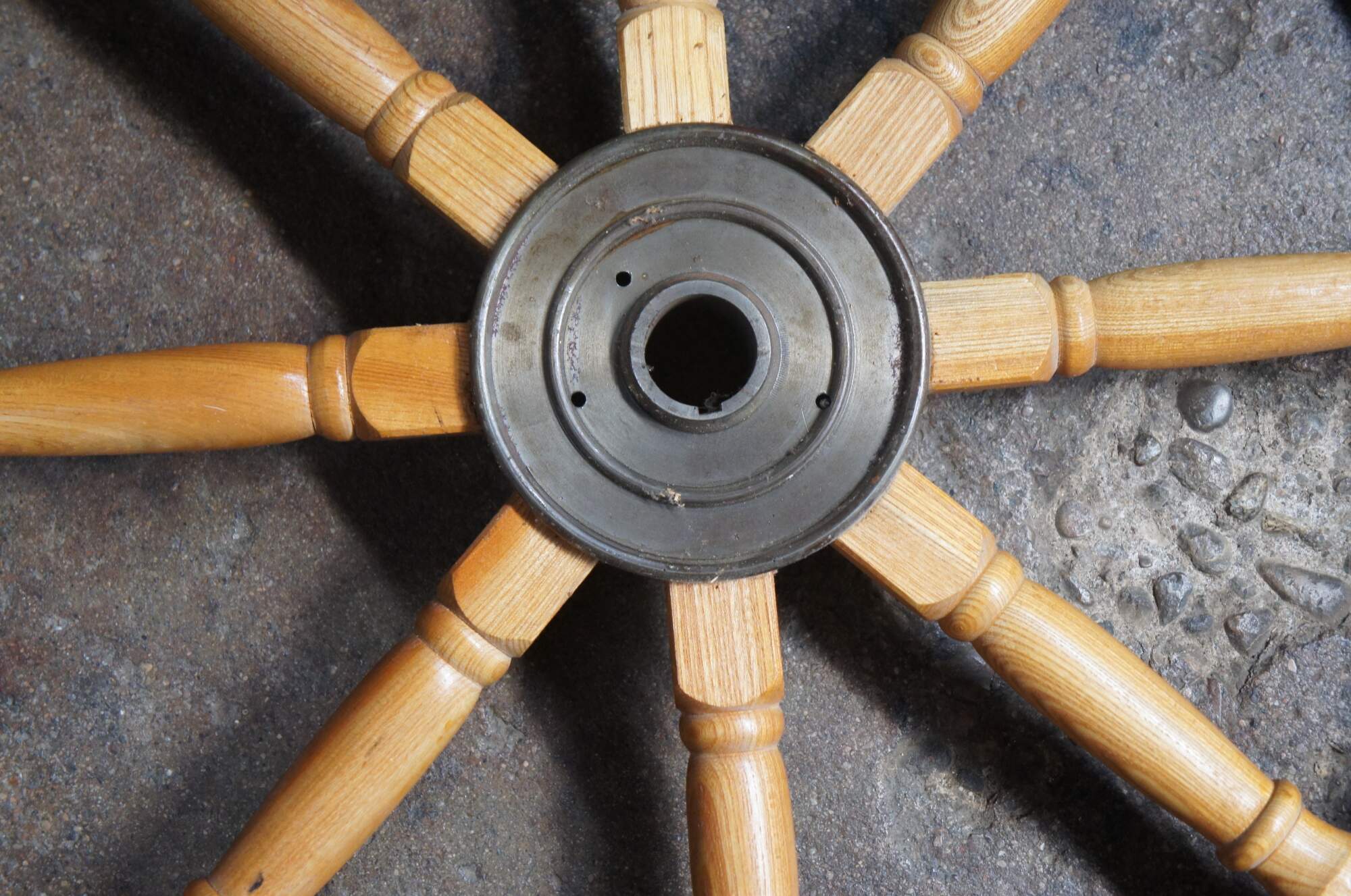 Antique oak and brass boat or ship wheel featuring rounded form with turned posts.