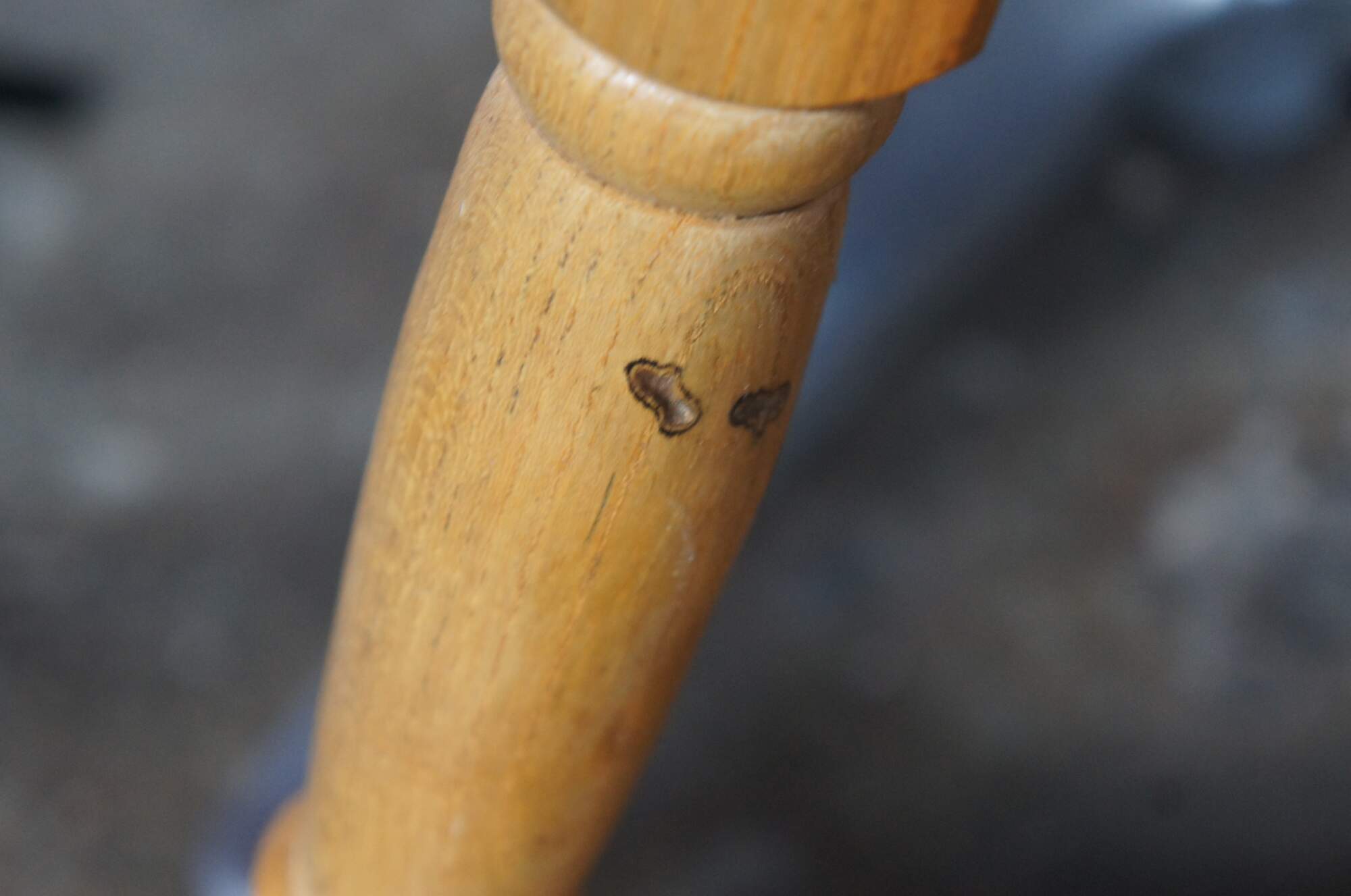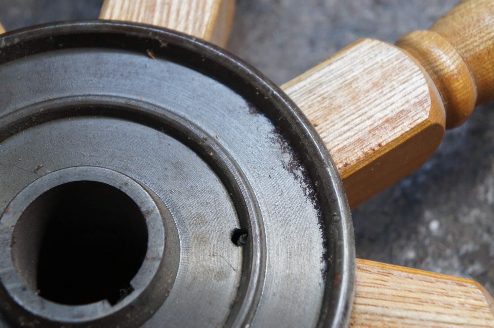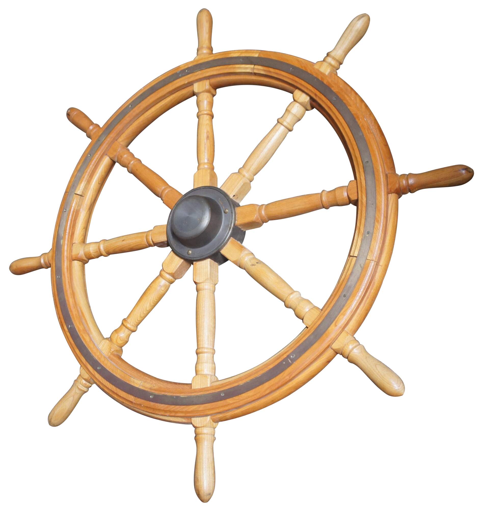 Antique oak and brass boat or ship wheel featuring rounded form with turned posts.