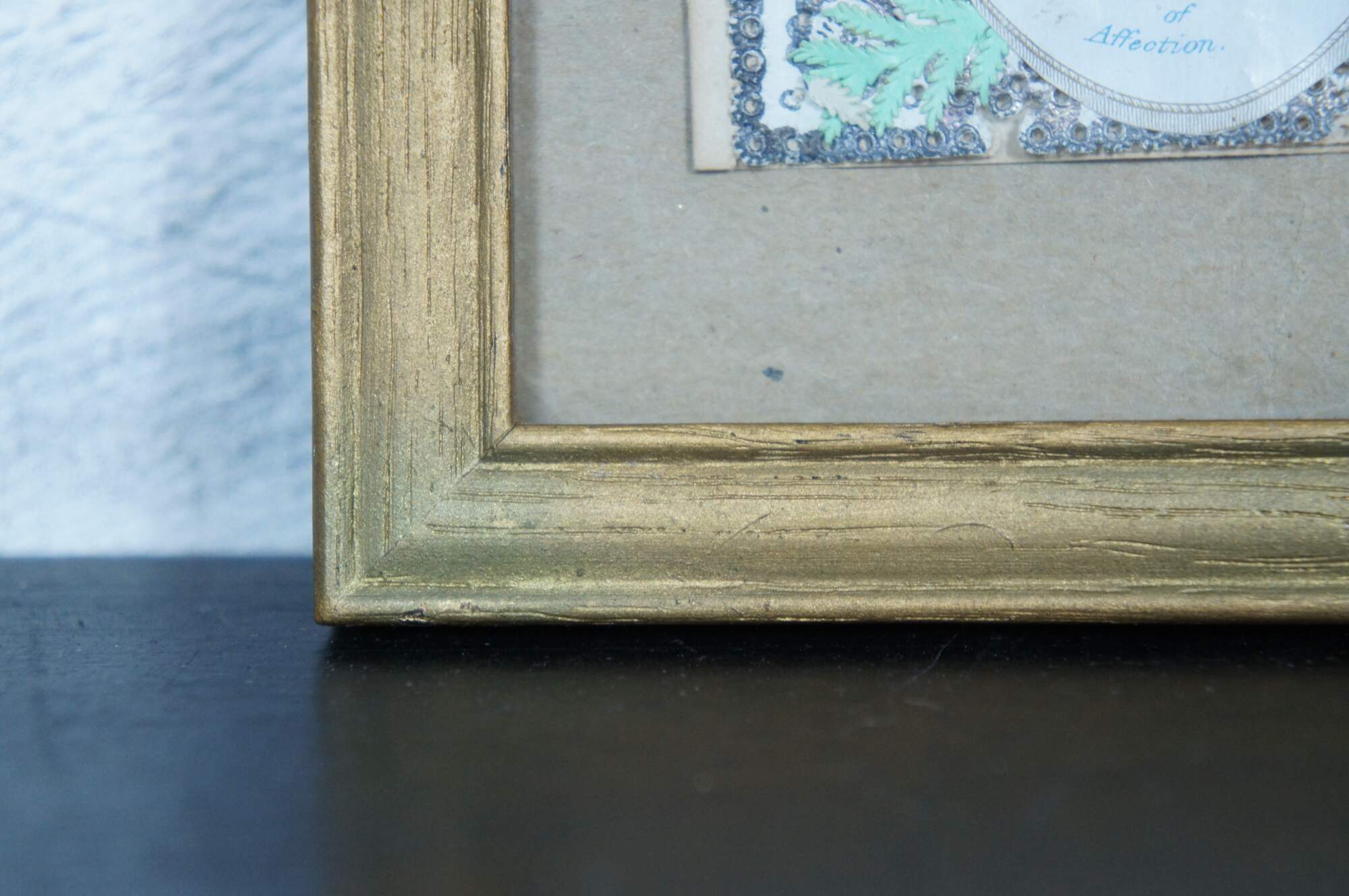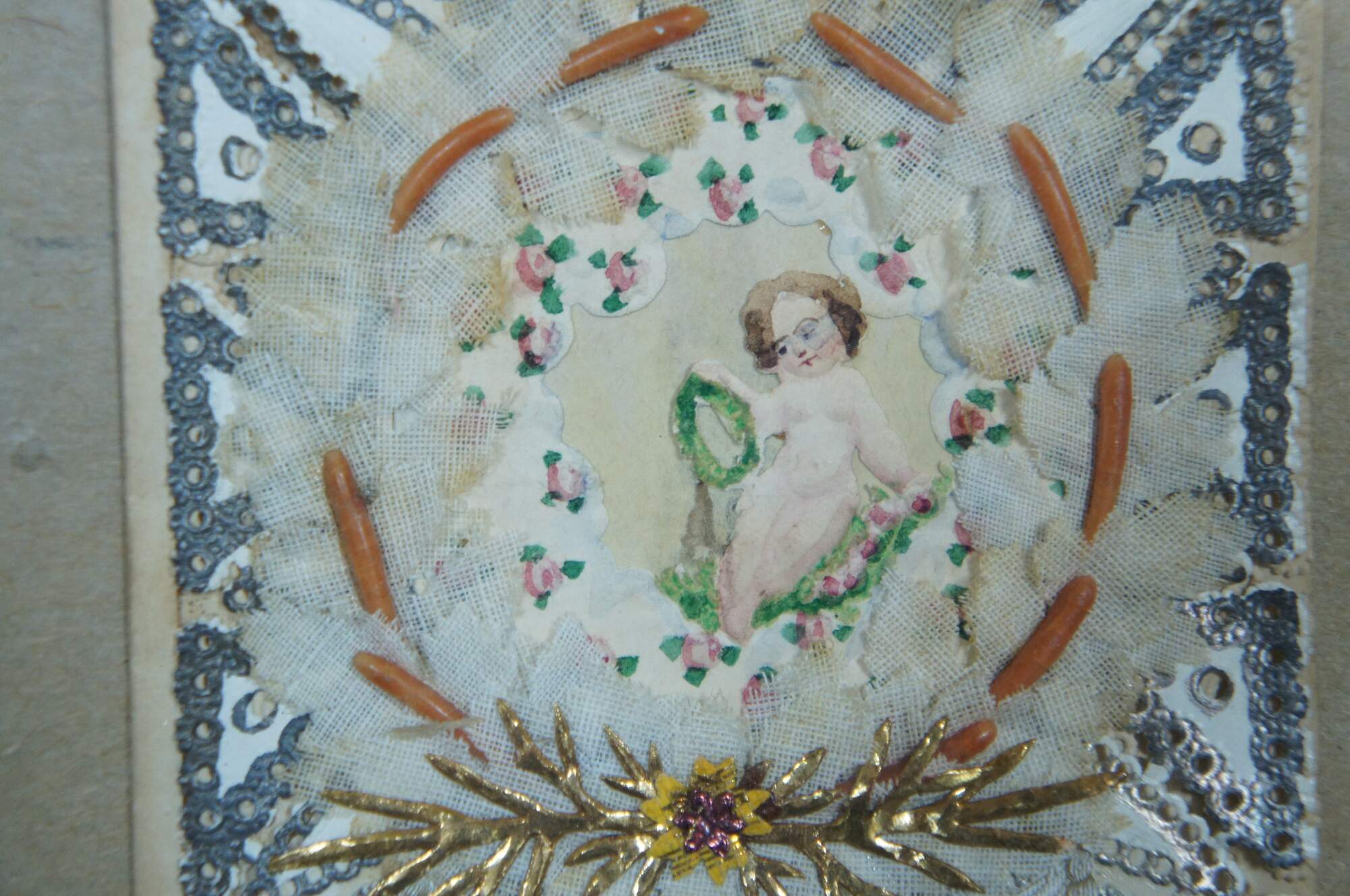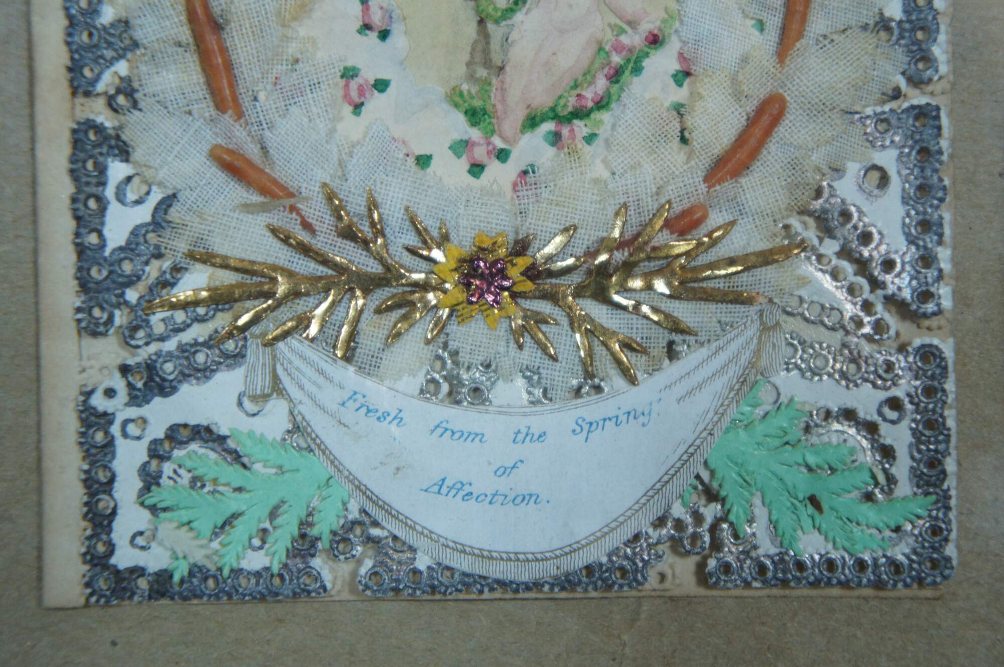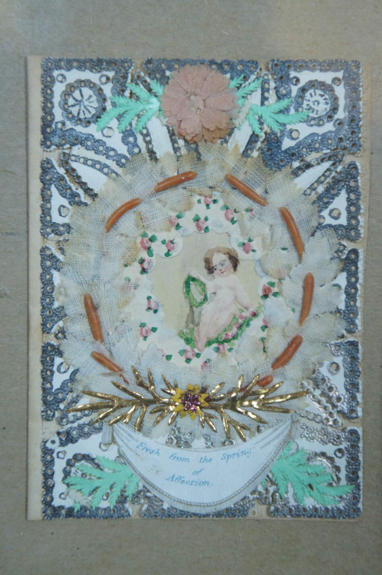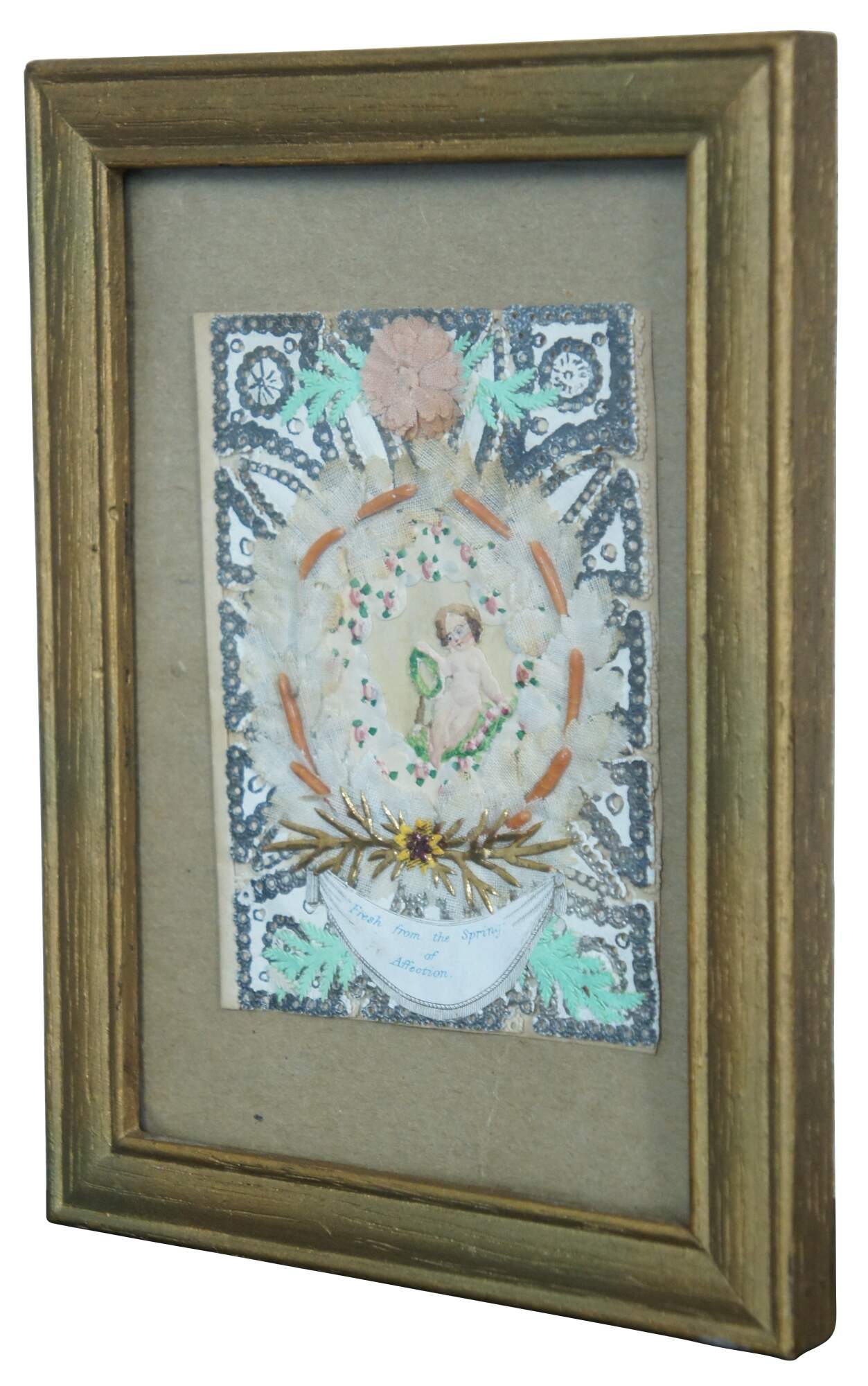 Antique framed Victorian Valentine, inscribed inside “From Wm. Kennedy 1861.” Front features a frame of painted paper lace doily, a wreath of fabric leaves and flowers surrounding a hand painted cherub and roses, with a banner below, printed with the words “Fresh from the Spring of Affection.”