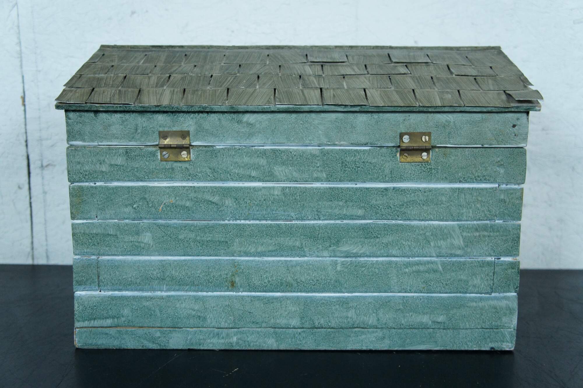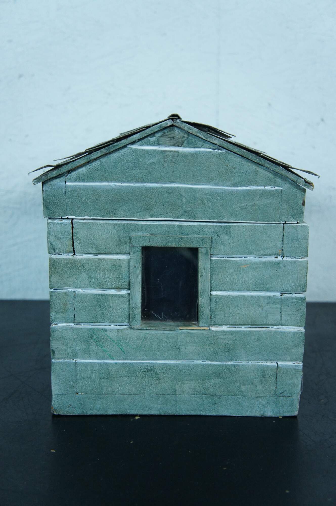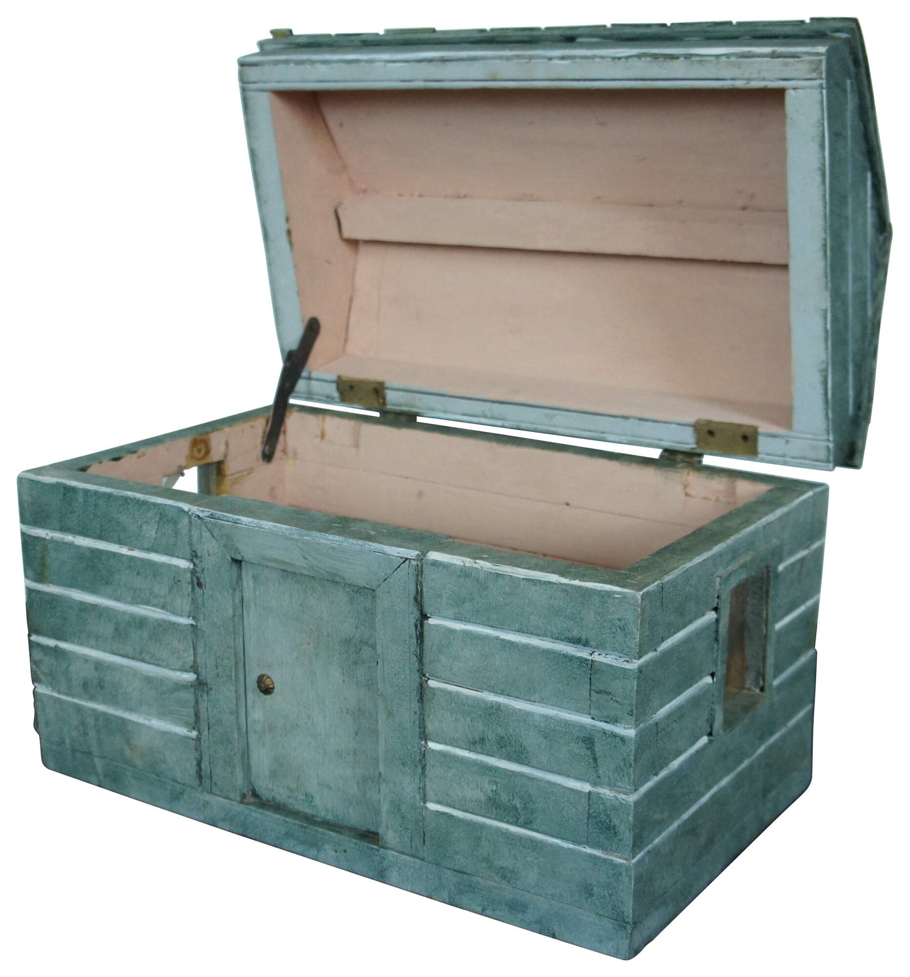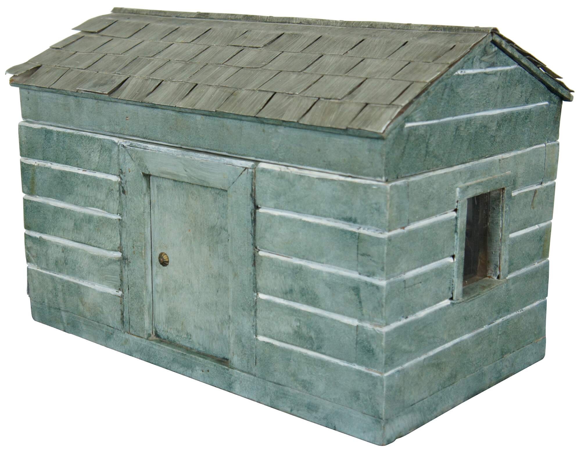 Rare and antique folk art doll house box or toy chest in the shape of a rustic green cabin with two glass windows and a shingle roof.
