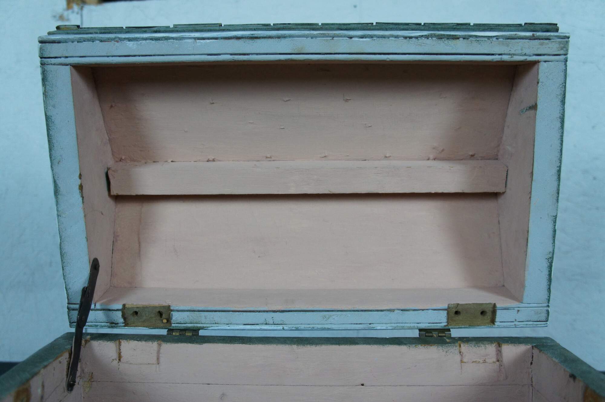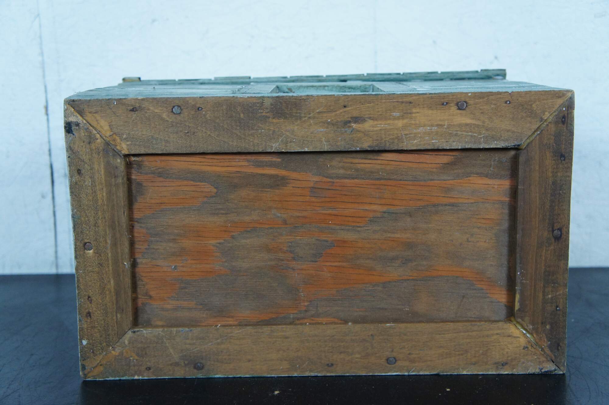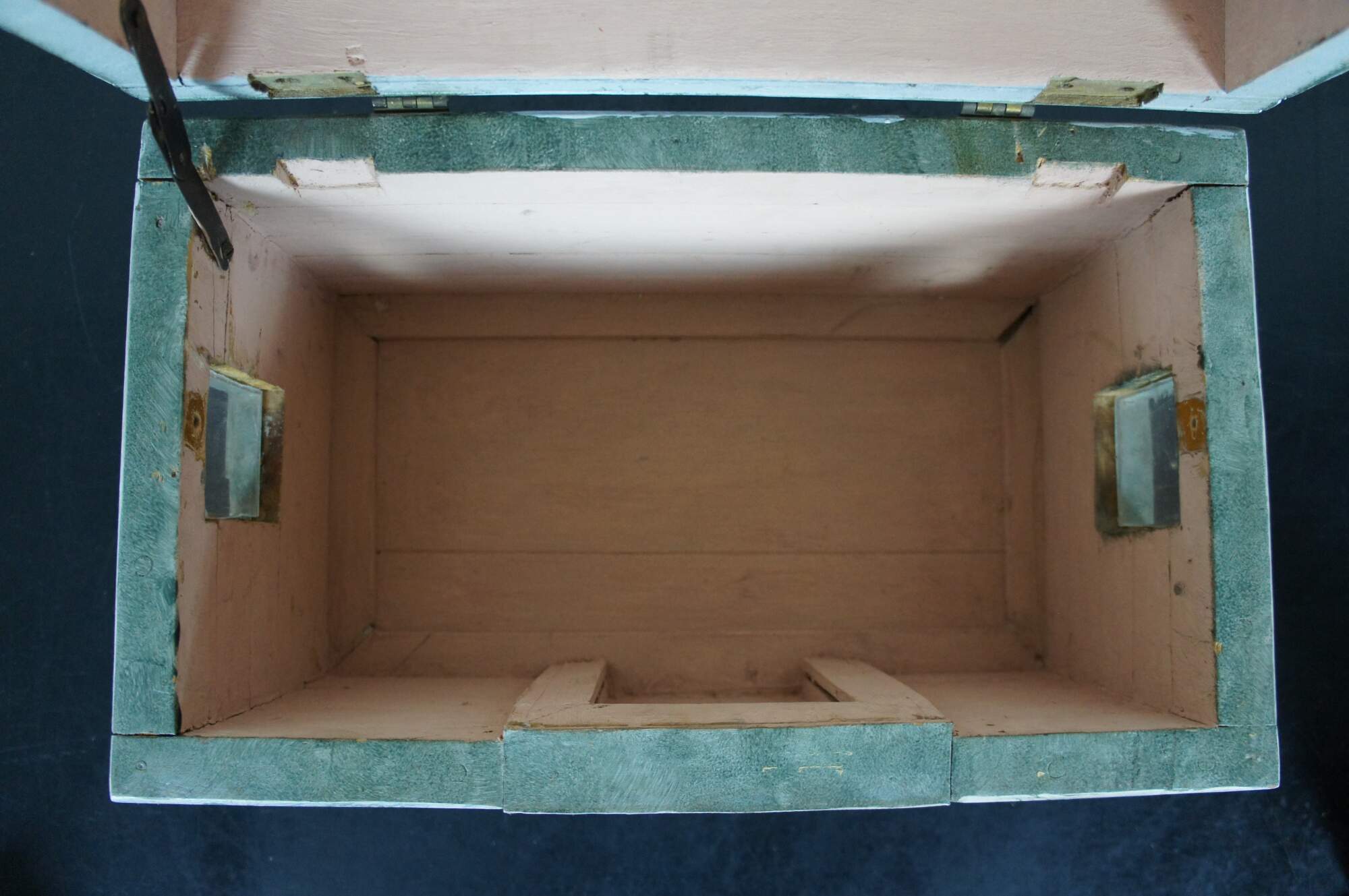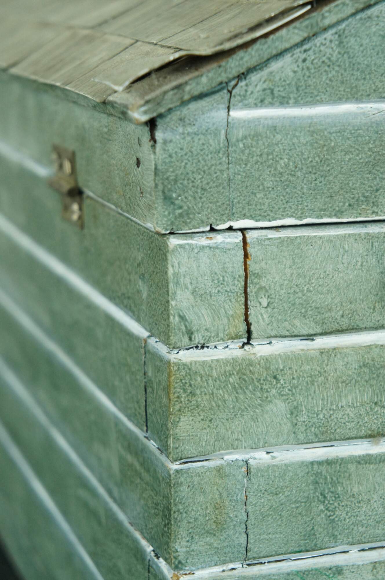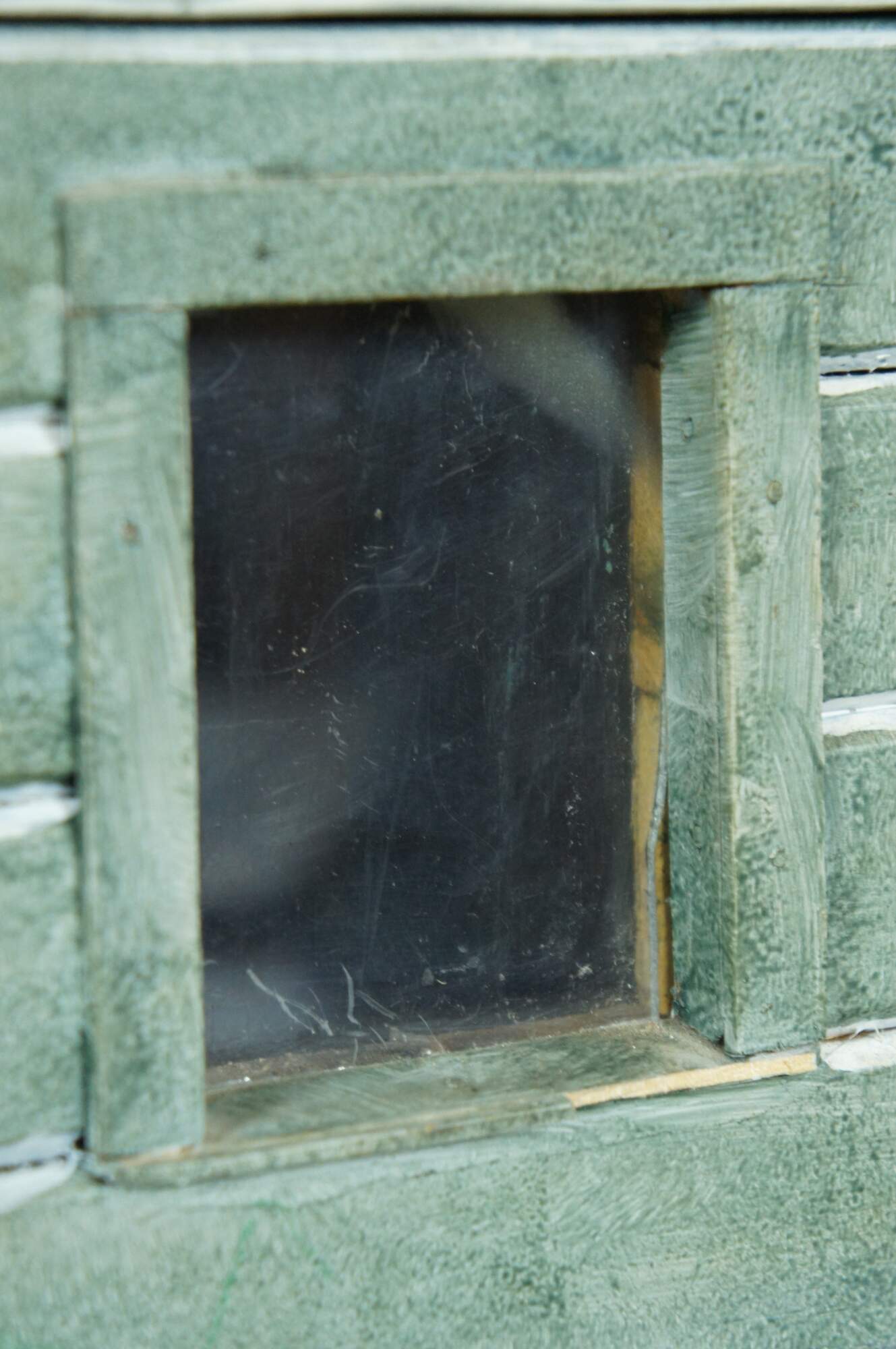 Rare and antique folk art doll house box or toy chest in the shape of a rustic green cabin with two glass windows and a shingle roof.